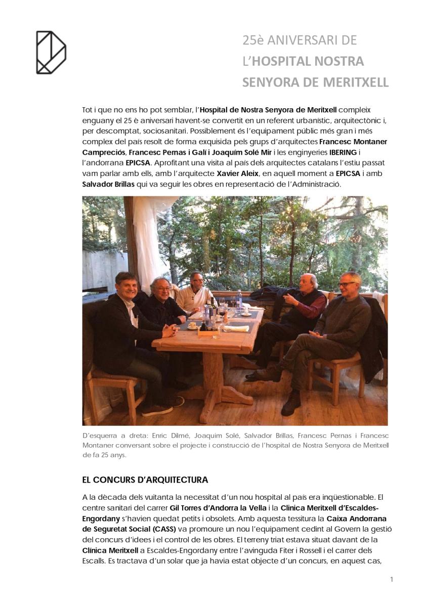 Tot i que no ens ho pot semblar, l’Hospital de Nostra Senyora de Meritxell compleix enguany el 25 è aniversari havent-se convertit en un referent urbanístic, arquitectònic i, per descomptat, sociosanitari.