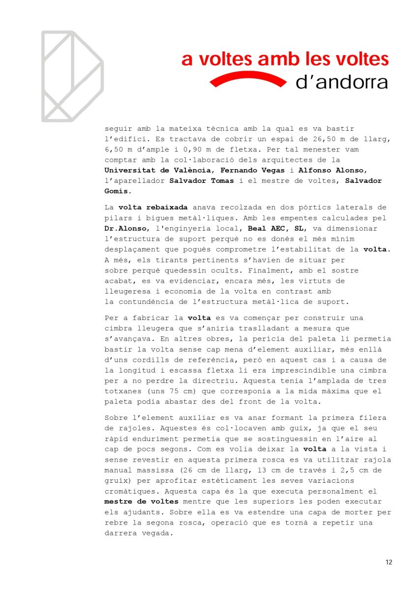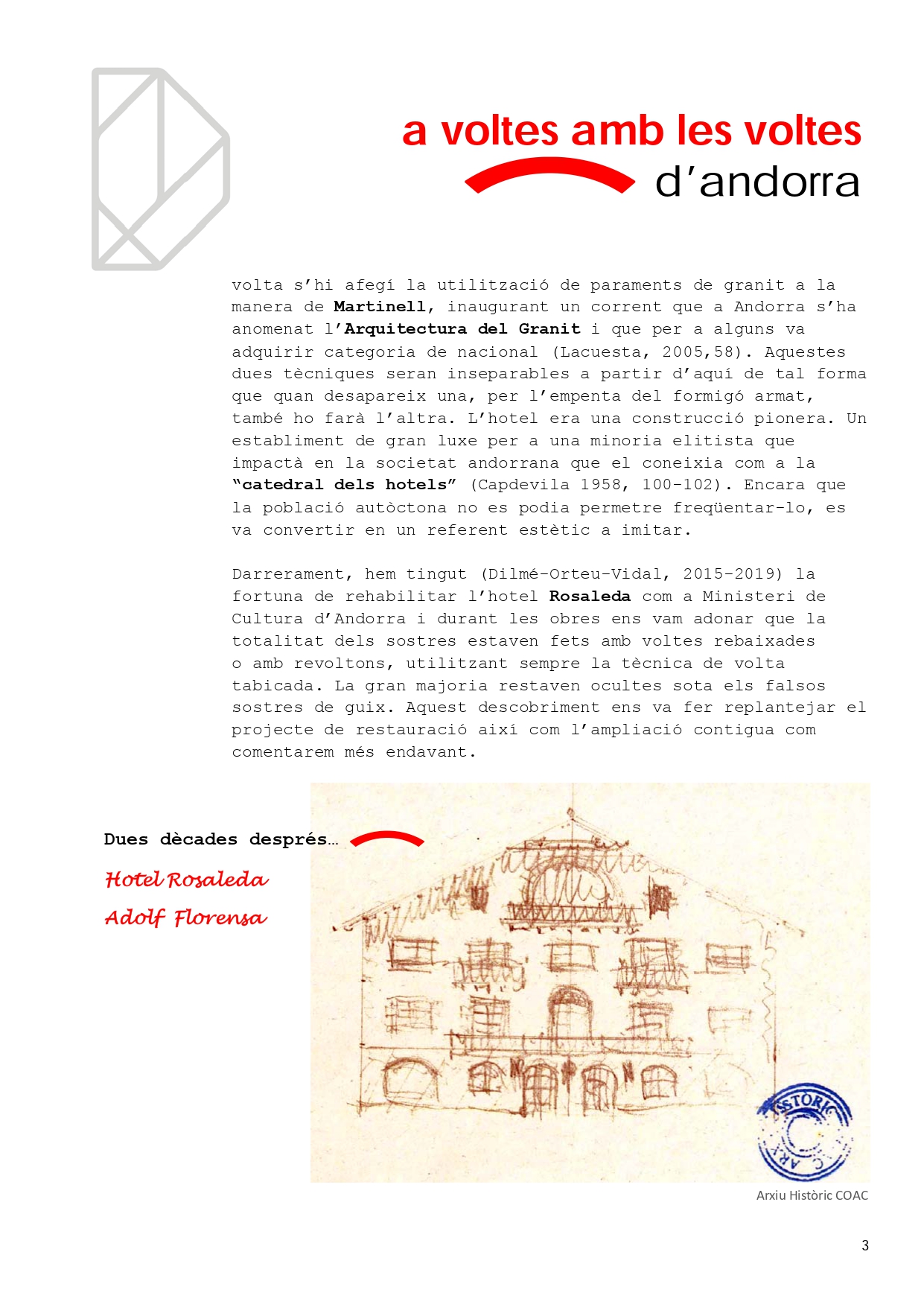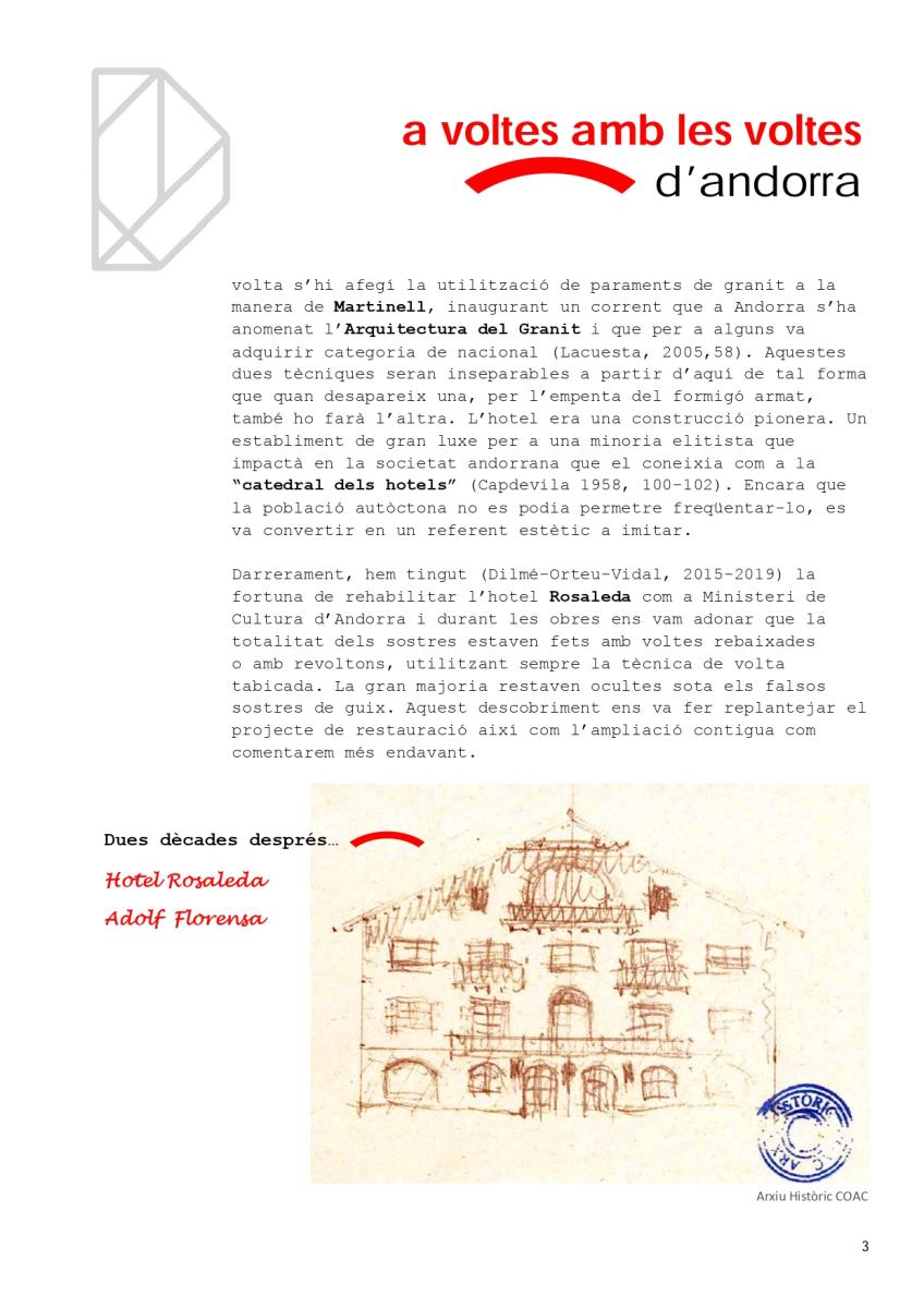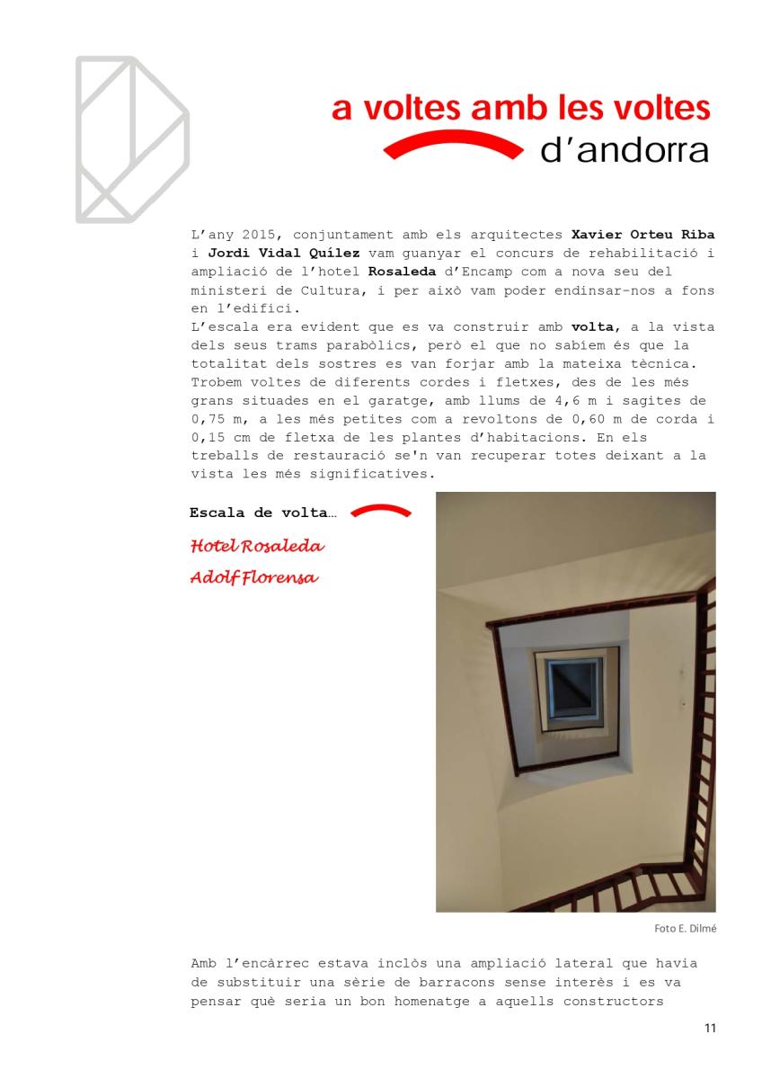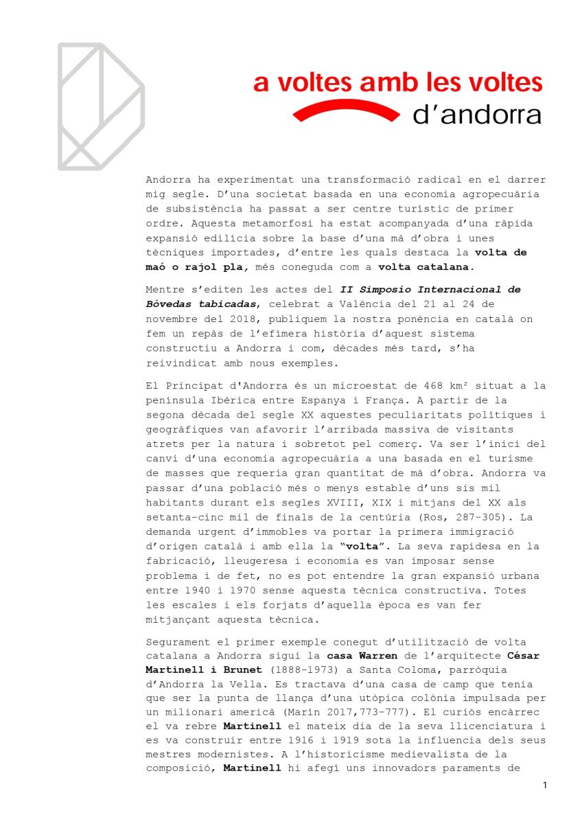 Mentre s’editen les actes del II Simposio Internacional de Bóvedas tabicadas, celebrat a València del 21 al 24 de novembre del 2018, publiquem la nostra ponència en català on fem un repàs de l’efímera història d’aquest sistema constructiu a Andorra i com, dècades més tard, s’ha reivindicat amb nous exemples.