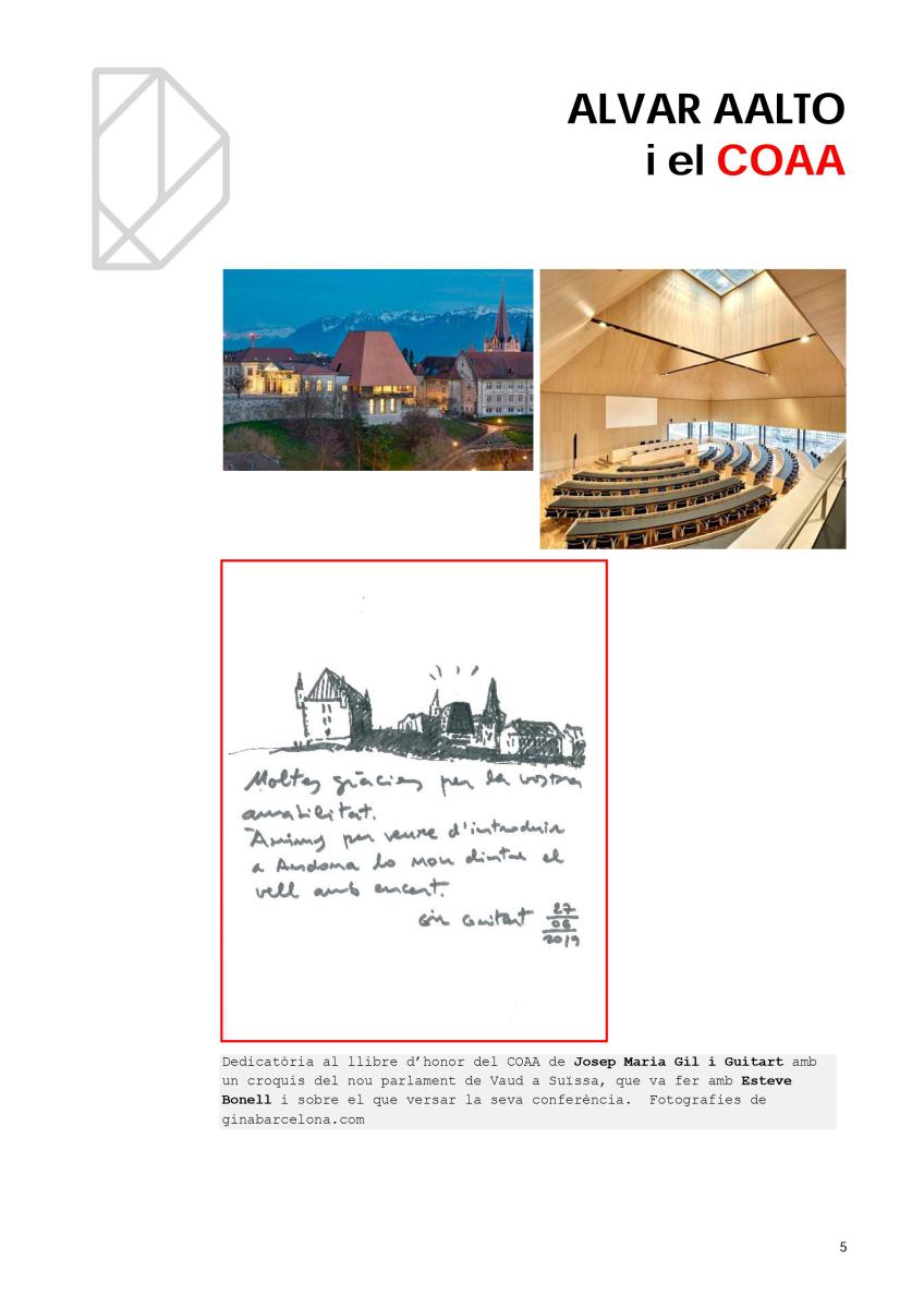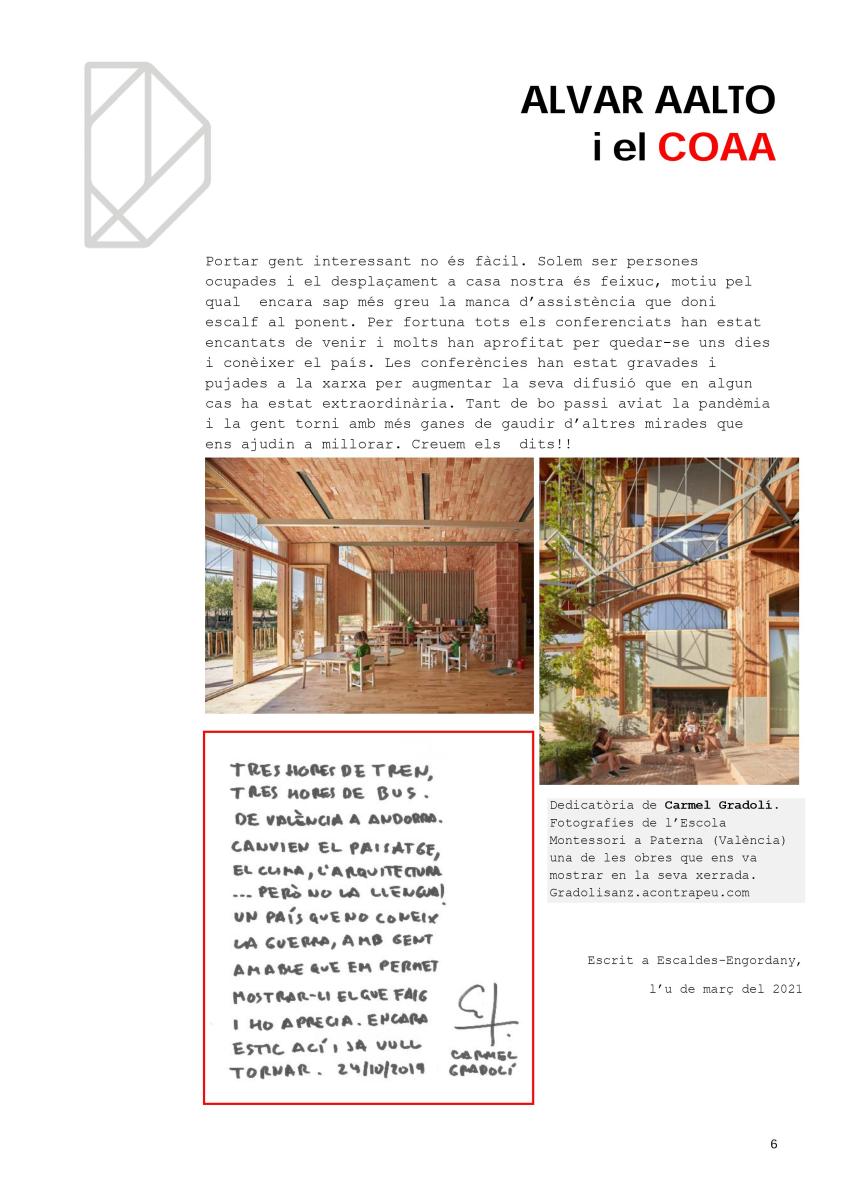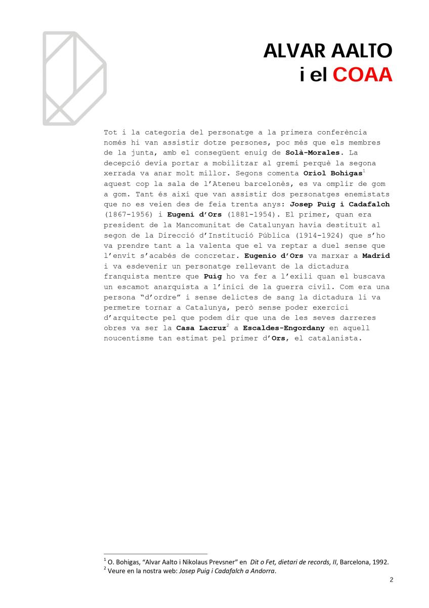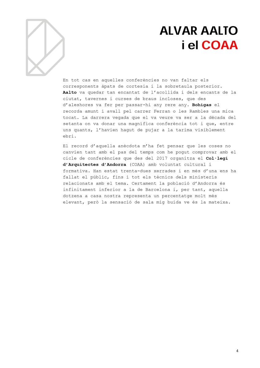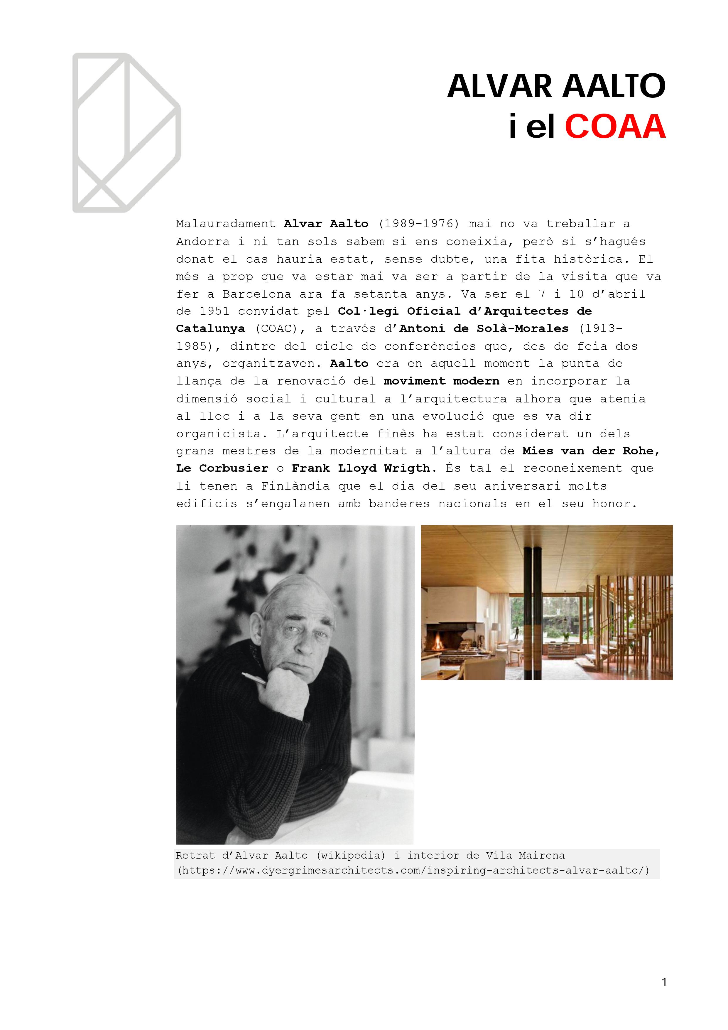 Malauradament Alvar Aalto (1989-1976) mai no va treballar a Andorra i ni tan sols sabem si ens coneixia, però si s’hagués donat el cas hauria estat, sense dubte, una fita històrica. El més a prop que va estar mai va ser a partir de la visita que va fer a Barcelona ara fa setanta anys.