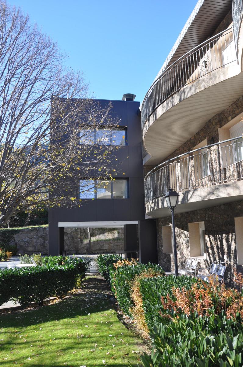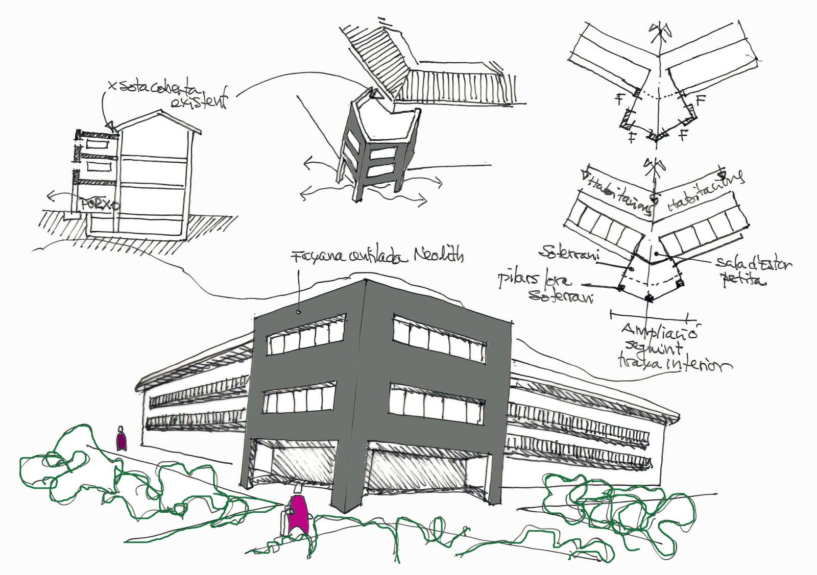 La idea és fer créixer aquest espai cap a l’exterior a través d’un volum que segueix les directrius generals de l’espai interior i de les façanes exteriors. Es tractaria d’un volum recolzat sobre pilars en planta baixa i tancat en planta primera i segona per rematar-se en una coberta planta. Els pilars en planta baixa ens permetrà conservar la sortida actual al jardí i la coberta planta inserir-se per sota del llosat actual.