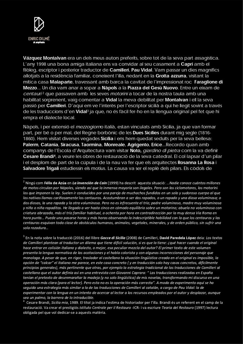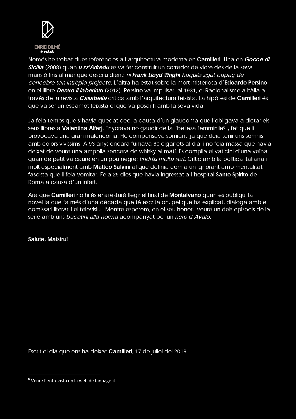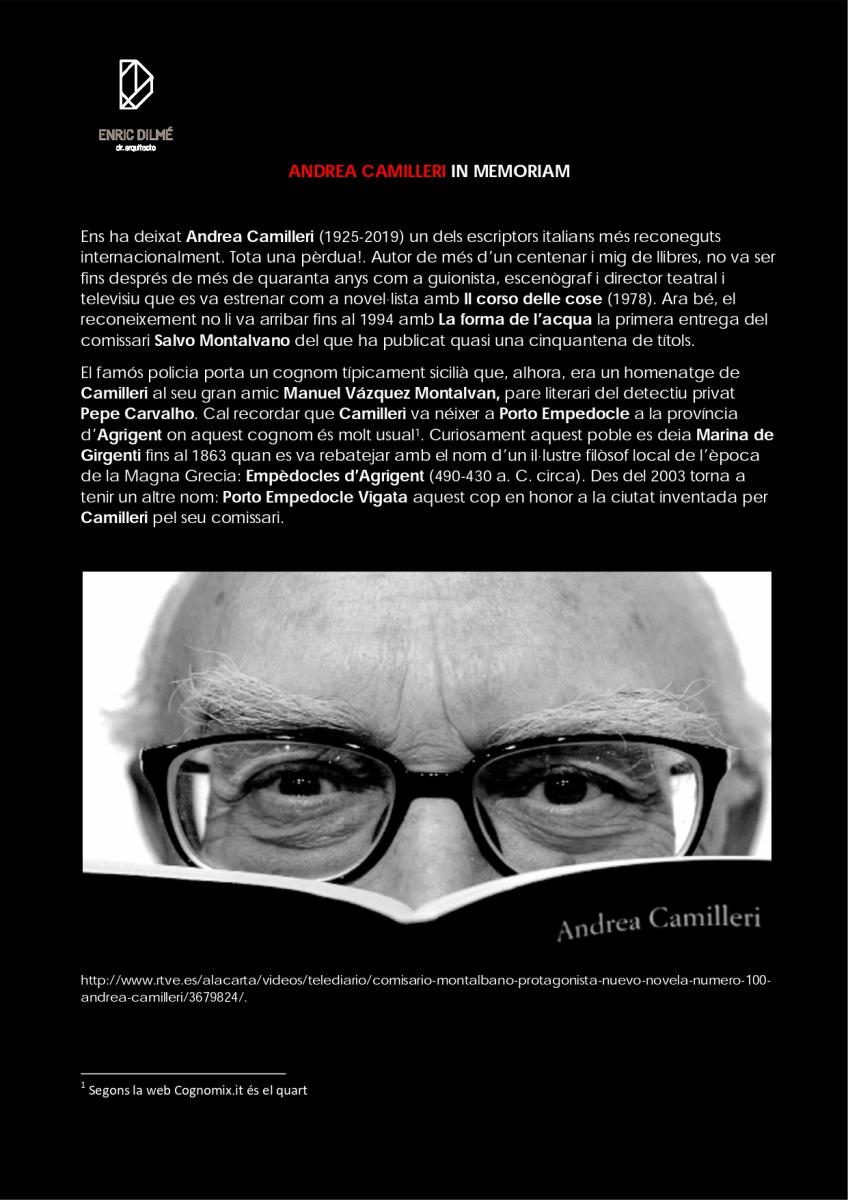 Ens ha deixat Andrea Camilleri (1925-2019) un dels escriptors italians més reconeguts internacionalment. Autor de quasi un centenar i mig de llibres, no va ser fins després de més de quaranta anys com a guionista, escenògraf i director teatral i televisiu que es va estrenar com a novel·lista amb Il corso delle cose (1978). Ara bé, el reconeixement no li va arribar fins al 1994 amb La forma de l’acqua la primera entrega del comissari Salvo Montalvano del que ha publicat quasi una cinquantena de títols.
