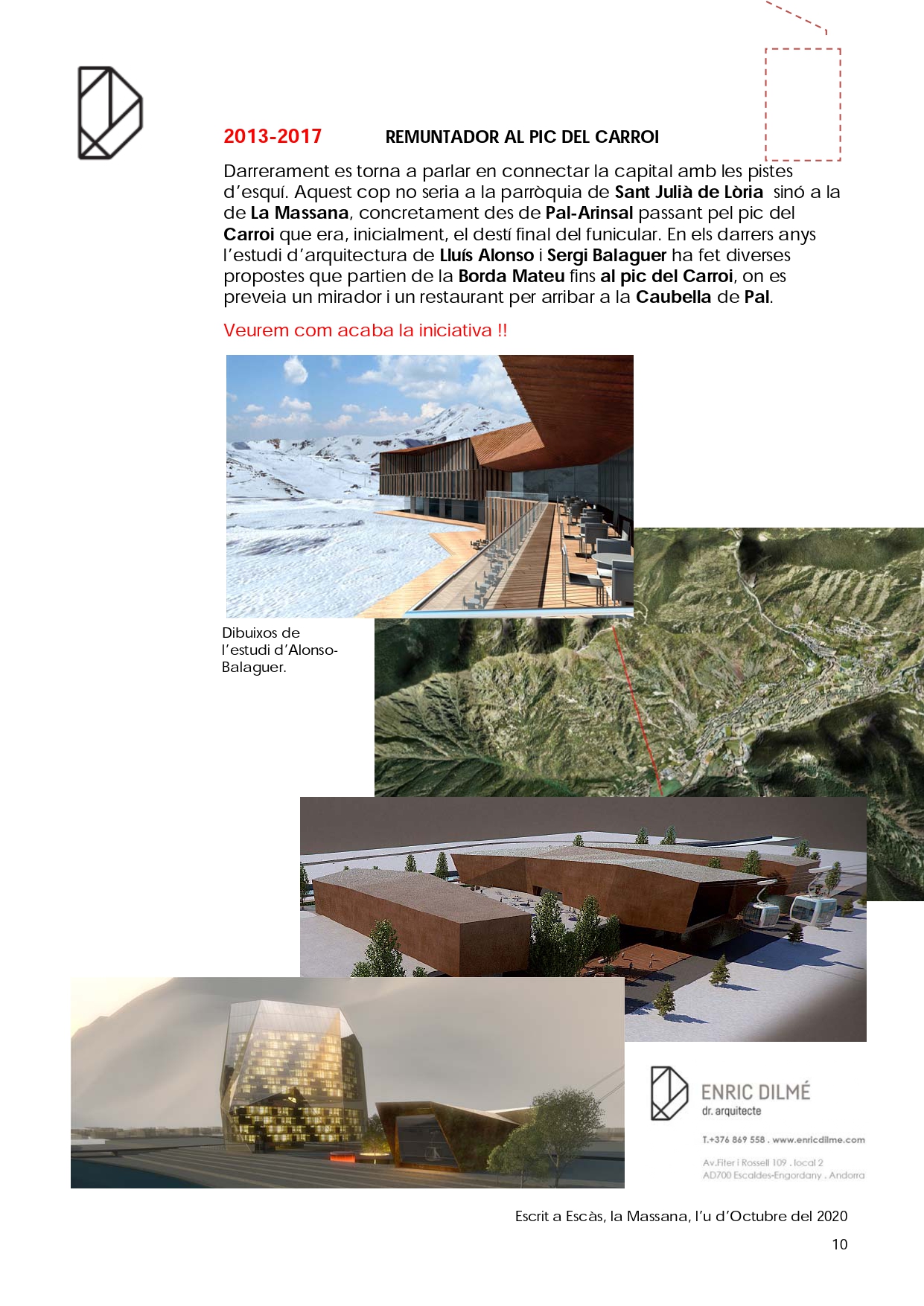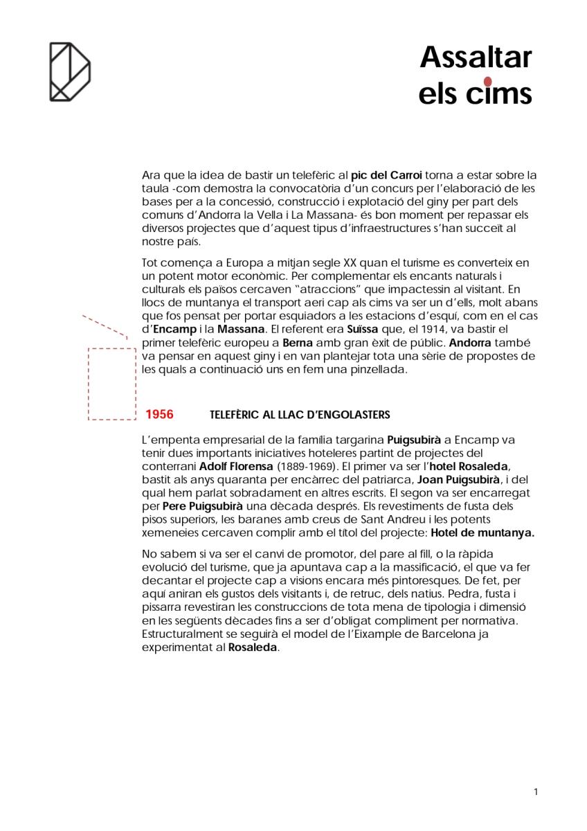 Ara que la idea de bastir un telefèric al pic del Carroi torna a estar sobre la taula -com demostra la convocatòria d’un concurs per l’elaboració de les bases per a la concessió, construcció i explotació del giny per part dels comuns d’Andorra la Vella i La Massana- és bon moment per repassar els diversos projectes que d’aquest tipus d’infraestructures s’han succeït al nostre país.