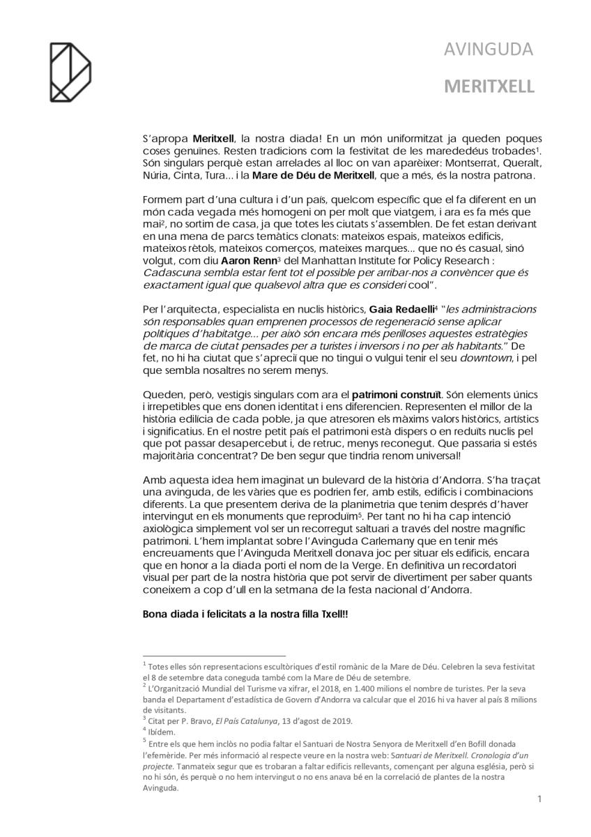 S’apropa Meritxell, la nostra diada! En un món uniformitzat ja queden poques coses genuïnes. Resten tradicions com la festivitat de les marededéus trobades. Són singulars perquè estan arrelades al lloc on van aparèixer: Montserrat, Queralt, Núria, Cinta, Tura... i la Mare de Déu de Meritxell, que a més, és la nostra patrona.