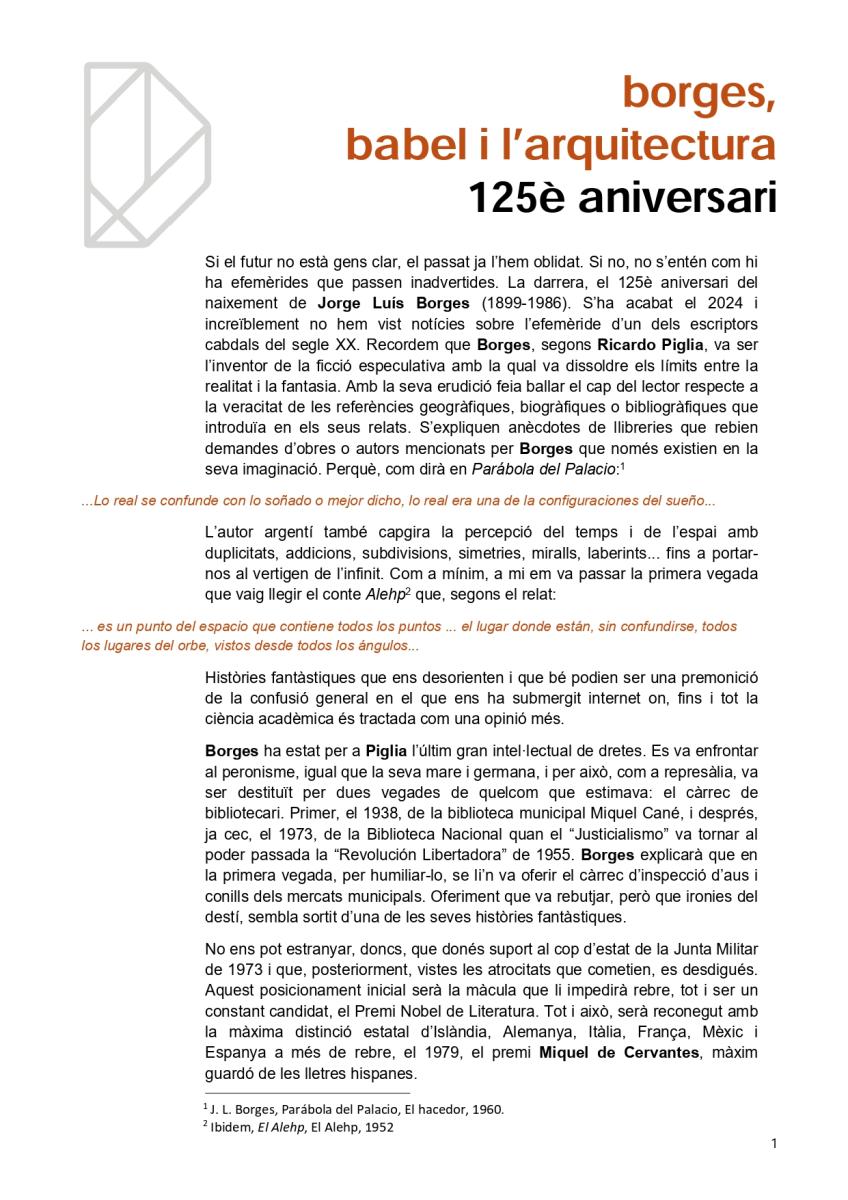 Si el futur no està gens clar, el passat ja l’hem oblidat. Si no, no s’entén com hi ha efemèrides que passen inadvertides. La darrera, el 125è aniversari del naixement de Jorge Luís Borges (1899-1986)