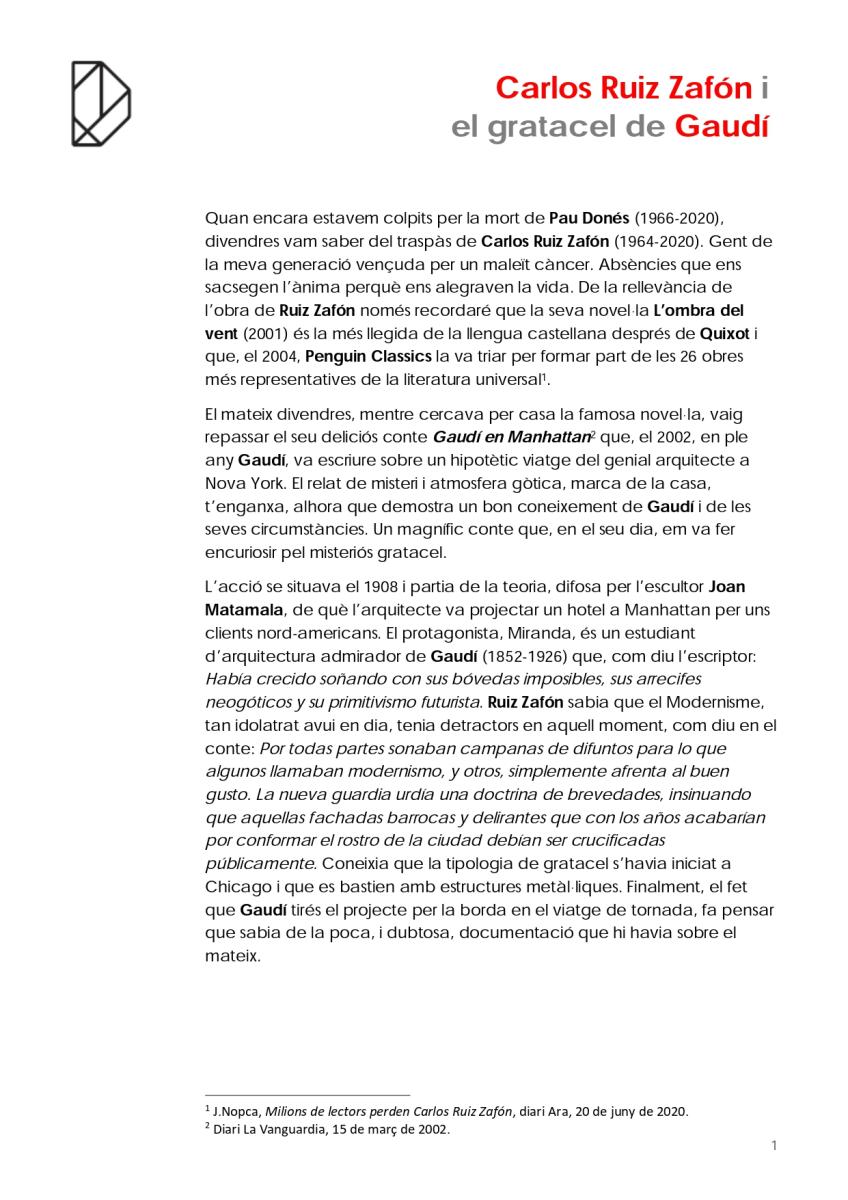Quan encara estavem colpits per la mort de Pau Donés (1966-2020), divendres vam saber del traspàs de Carlos Ruiz Zafón (1964-2020). Gent de la meva generació vençuda per un maleït càncer. Absències que ens sacsegen l’ànima perquè ens alegraven la vida.