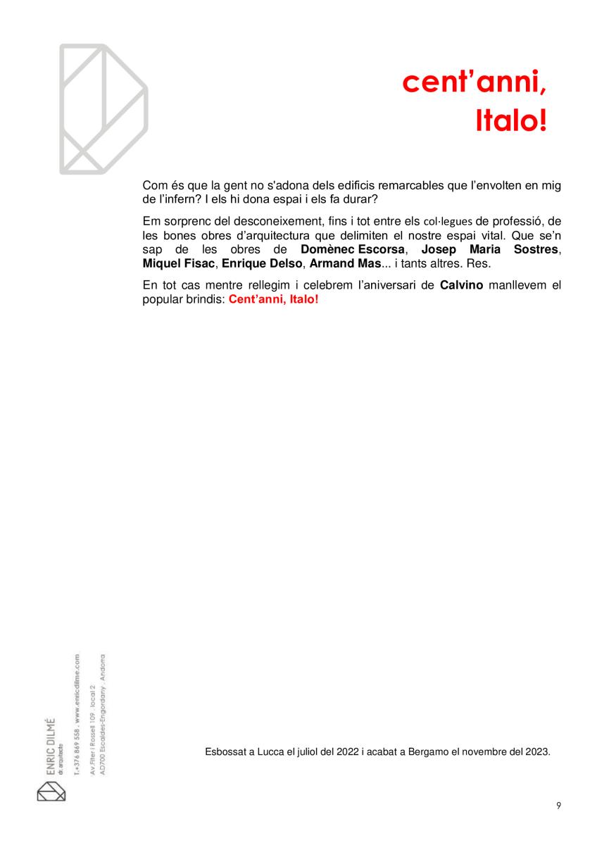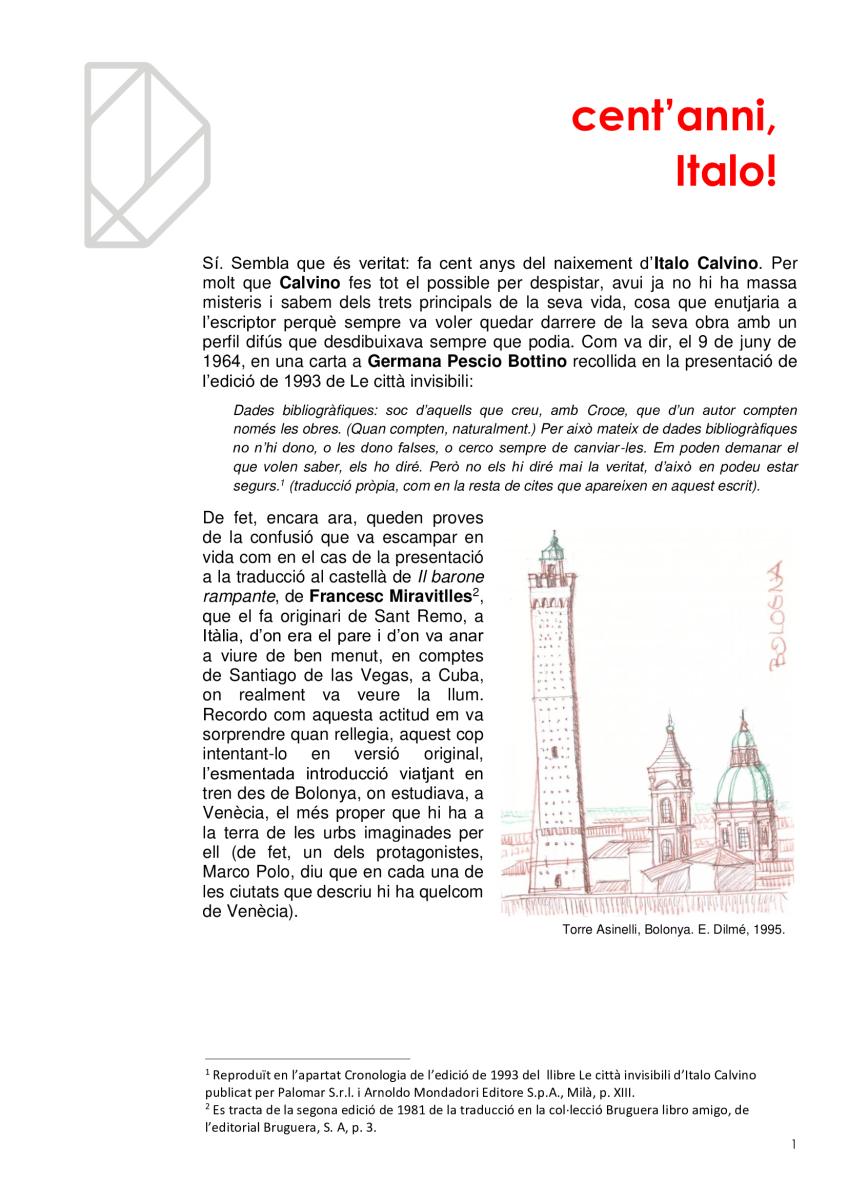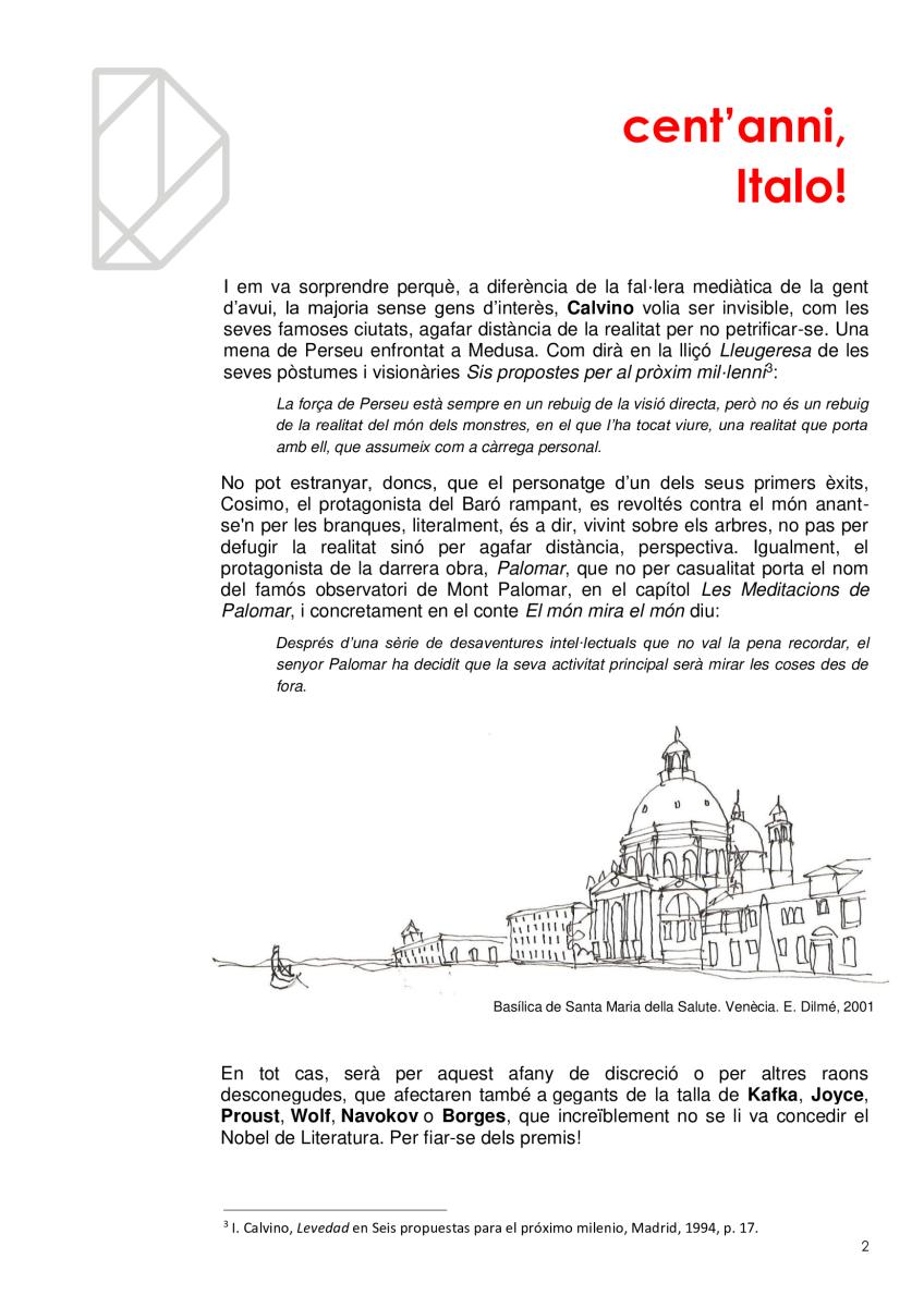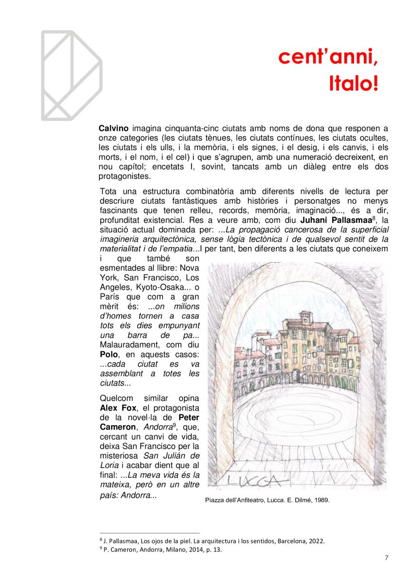Vivim en ciutats sense ser del tot conscients, com no ho som de què respirem. I igual que es promociona la qualitat de l’aire per què no es fa el mateix amb la qualitat de l'arquitectura? Quantes ciutats hi ha en la mateixa ciutat? Quantes visibles i quantes invisibles? Com és que la gent no s'adona dels edificis remarcables que l’envolten en mig de l’infern? I els hi dona espai i els fa durar? En l'efemèride dels cents anys del naixement d'Italo Calvino li volem retre un minúscul homenatge de qui va ser l'autor de Les ciutats invisibles (1973), potser la més famosa de les seves obres, considerada per molts una obra mestra del segle XX.
