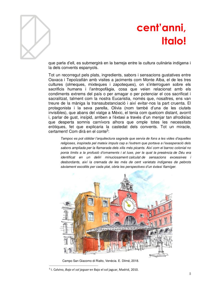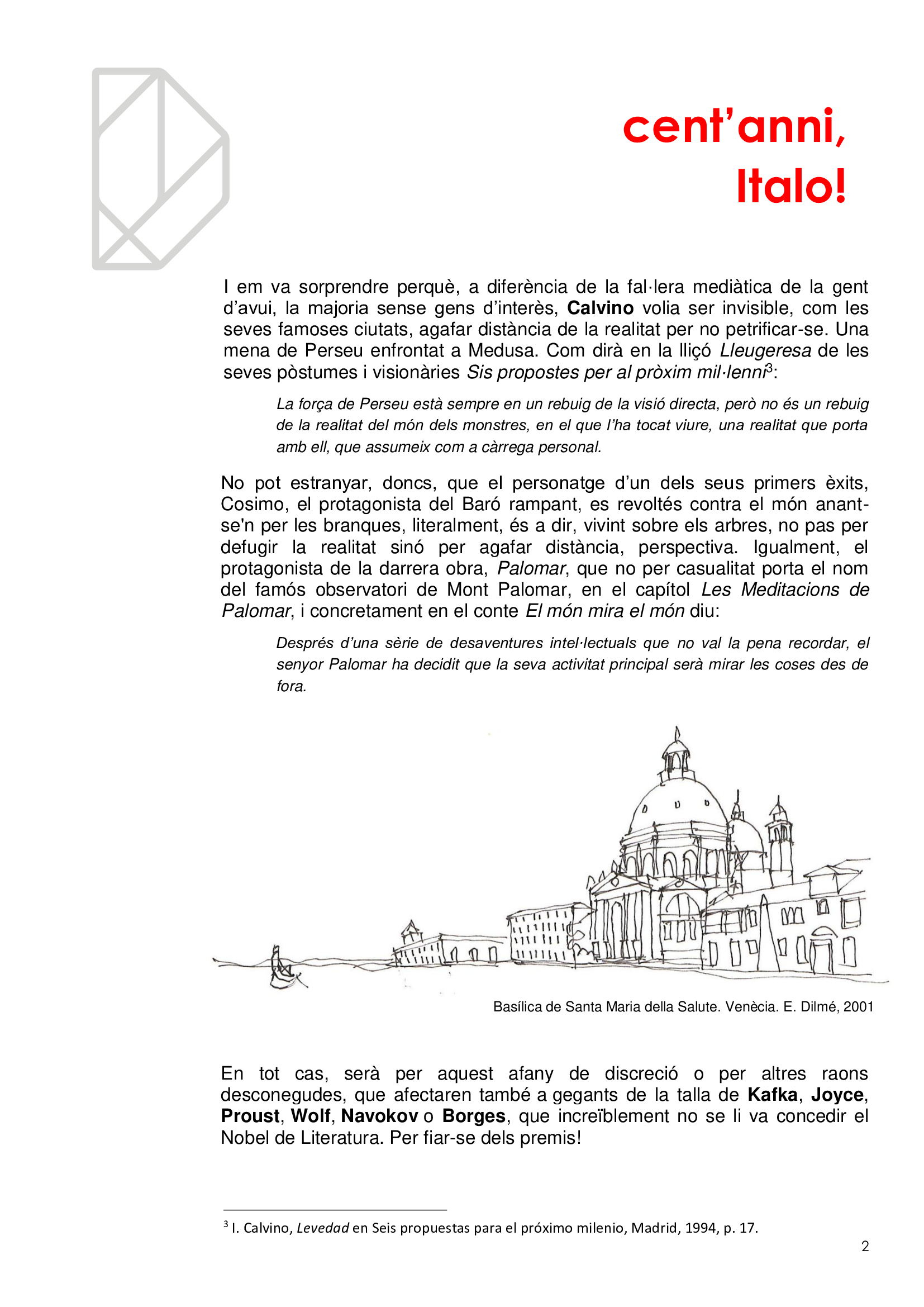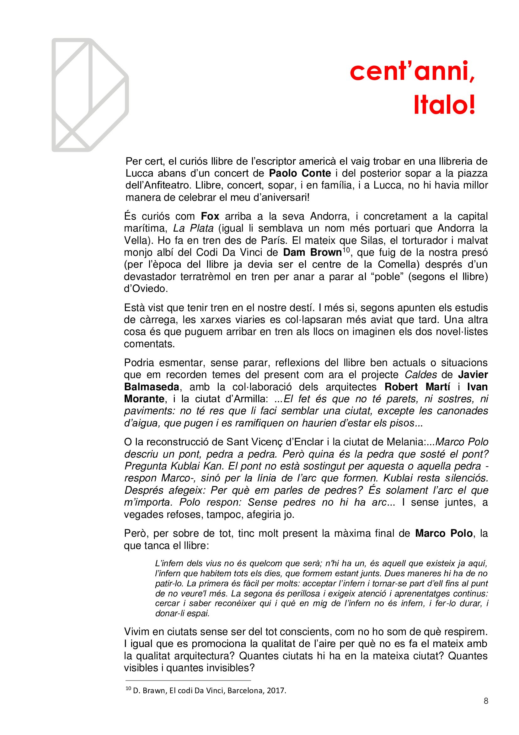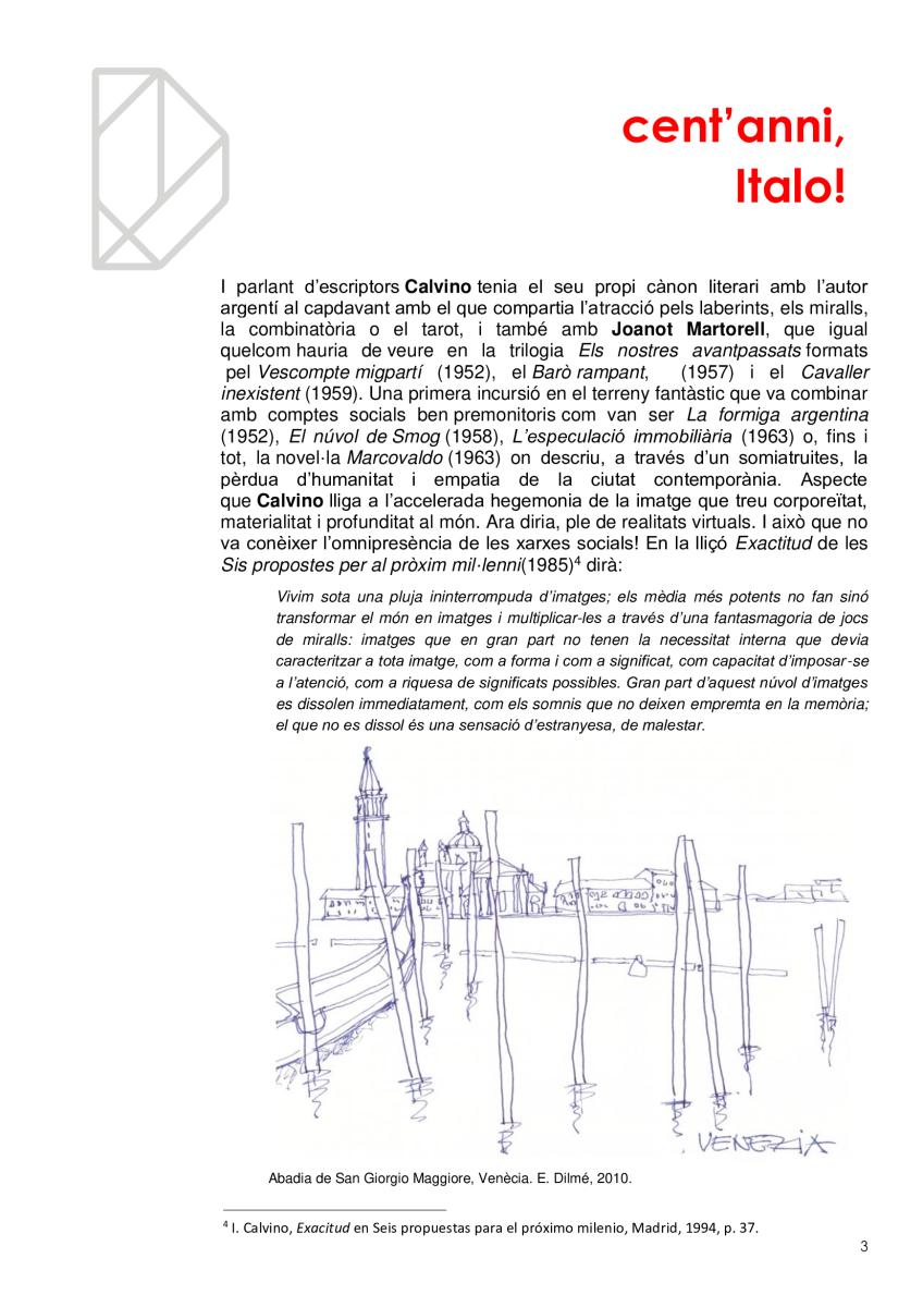 Vivim en ciutats sense ser del tot conscients, com no ho som de què respirem. I igual que es promociona la qualitat de l’aire per què no es fa el mateix amb la qualitat de l'arquitectura? Quantes ciutats hi ha en la mateixa ciutat? Quantes visibles i quantes invisibles? Com és que la gent no s'adona dels edificis remarcables que l’envolten en mig de l’infern? I els hi dona espai i els fa durar? En l'efemèride dels cents anys del naixement d'Italo Calvino li volem retre un minúscul homenatge de qui va ser l'autor de Les ciutats invisibles (1973), potser la més famosa de les seves obres, considerada per molts una obra mestra del segle XX.