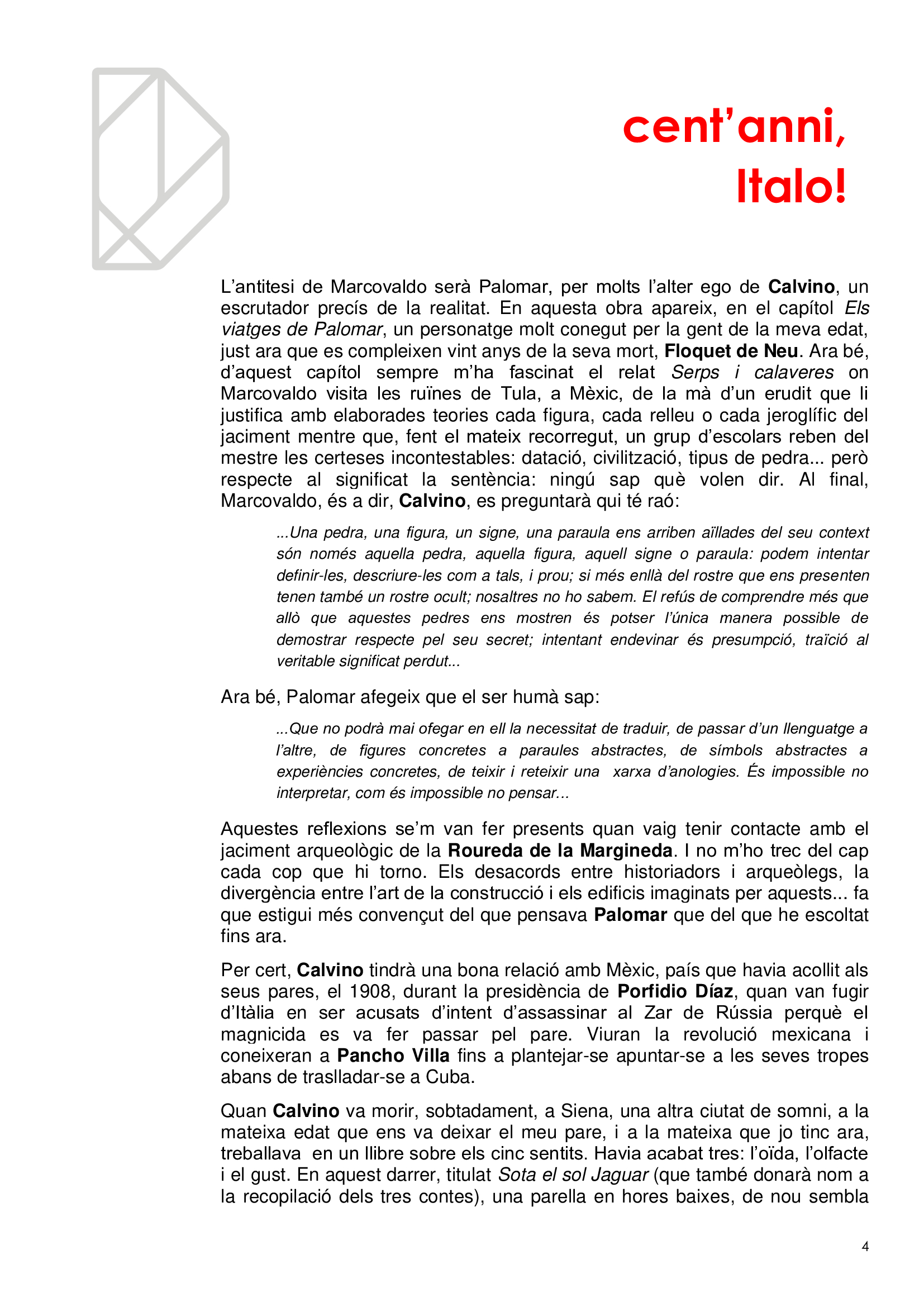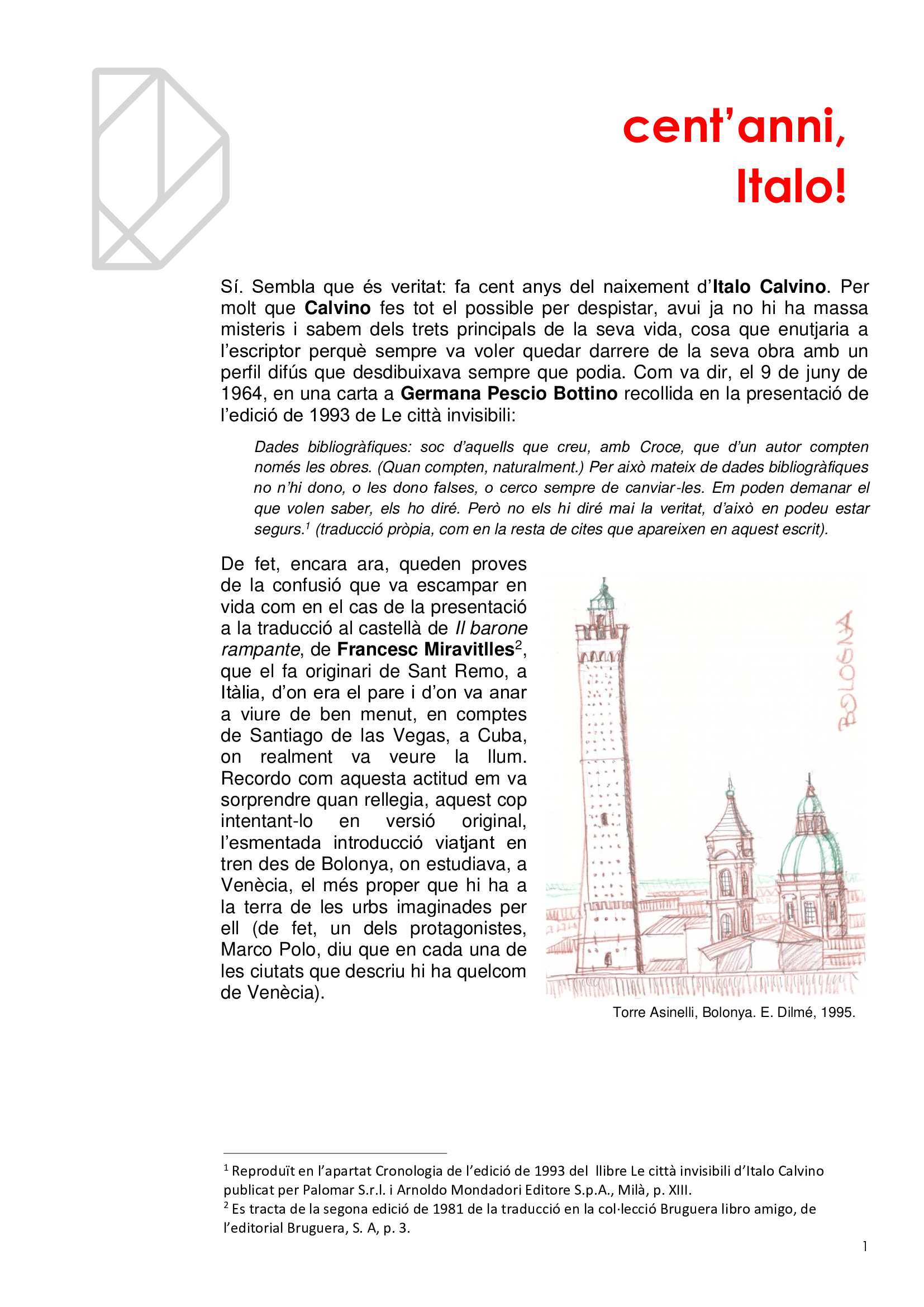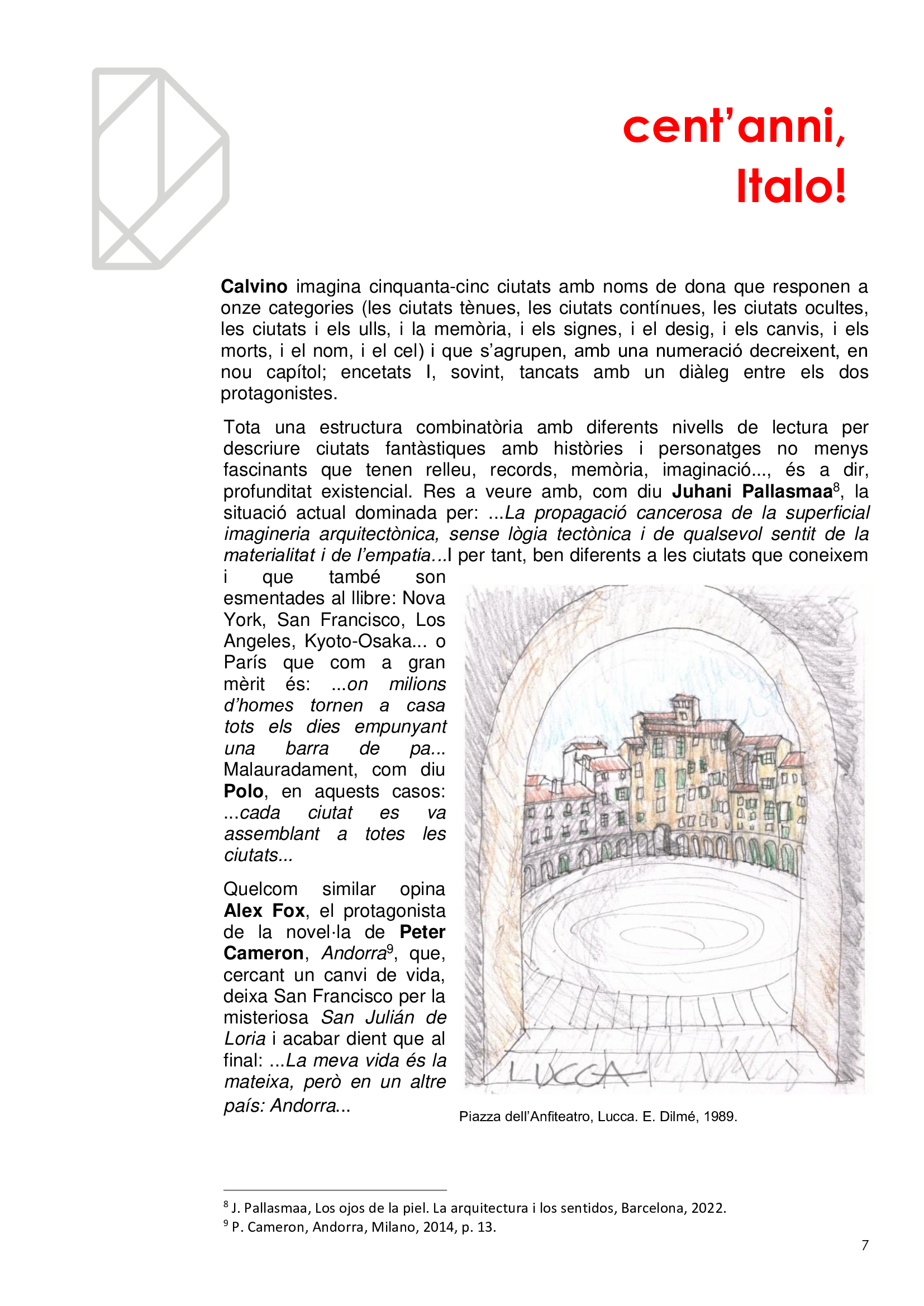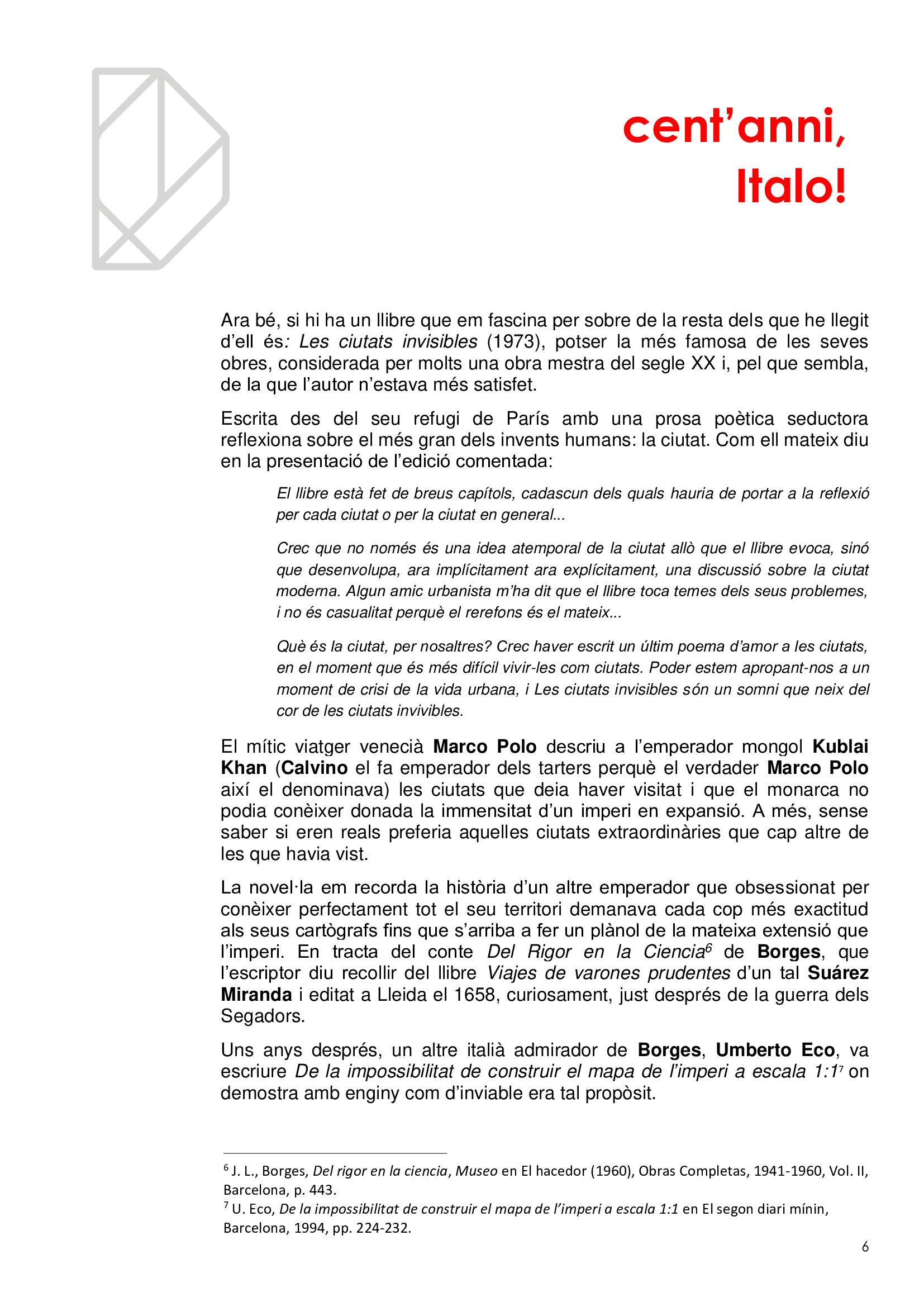 Vivim en ciutats sense ser del tot conscients, com no ho som de què respirem. I igual que es promociona la qualitat de l’aire per què no es fa el mateix amb la qualitat de l'arquitectura? Quantes ciutats hi ha en la mateixa ciutat? Quantes visibles i quantes invisibles? Com és que la gent no s'adona dels edificis remarcables que l’envolten en mig de l’infern? I els hi dona espai i els fa durar? En l'efemèride dels cents anys del naixement d'Italo Calvino li volem retre un minúscul homenatge de qui va ser l'autor de Les ciutats invisibles (1973), potser la més famosa de les seves obres, considerada per molts una obra mestra del segle XX.