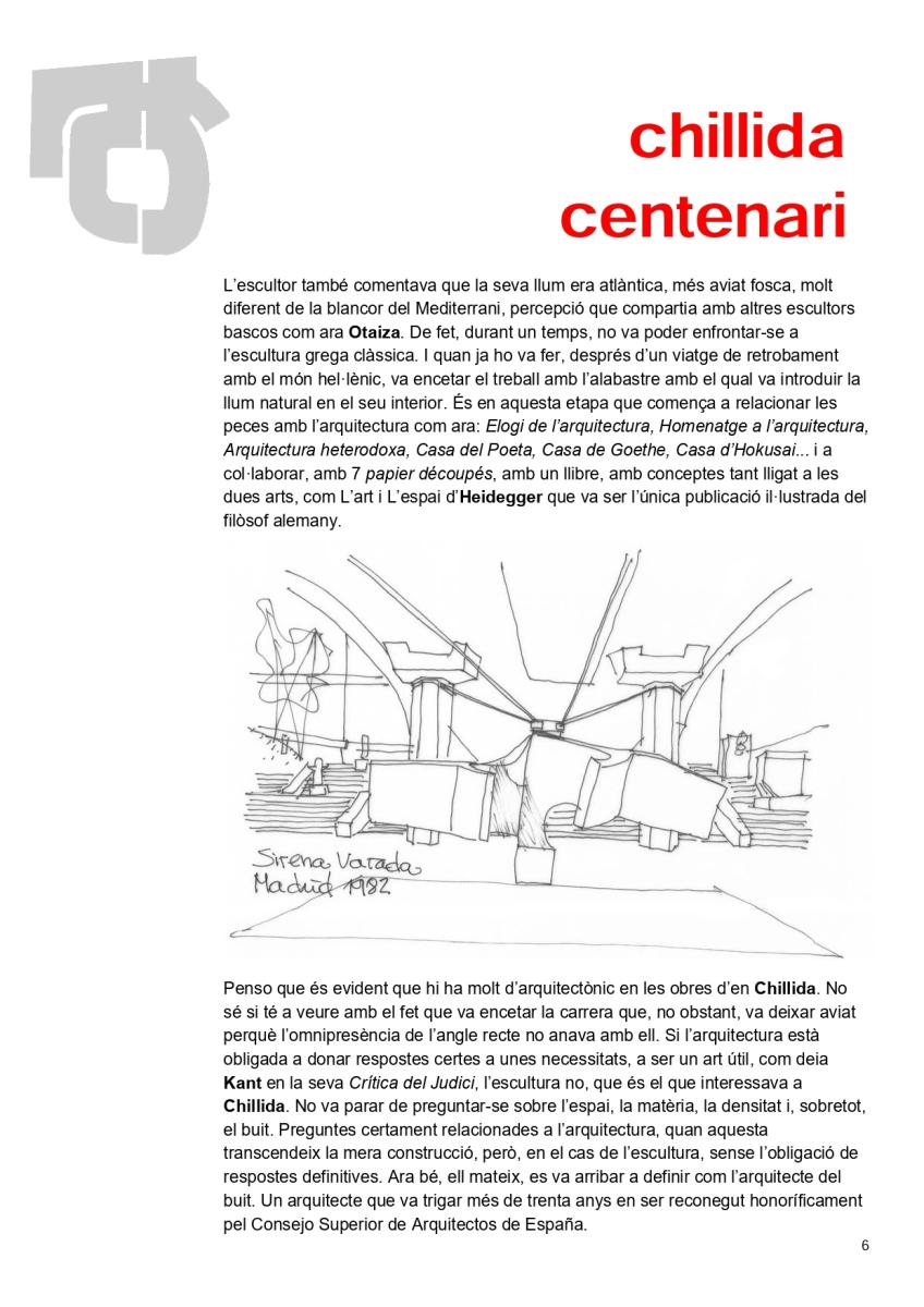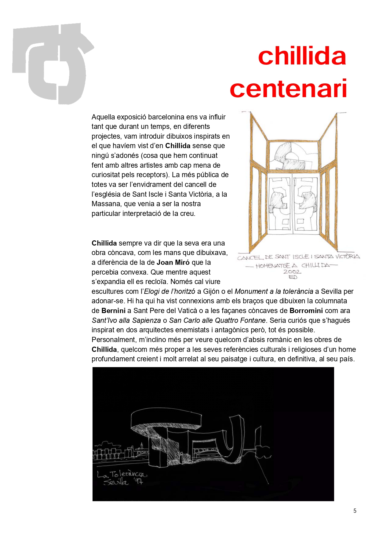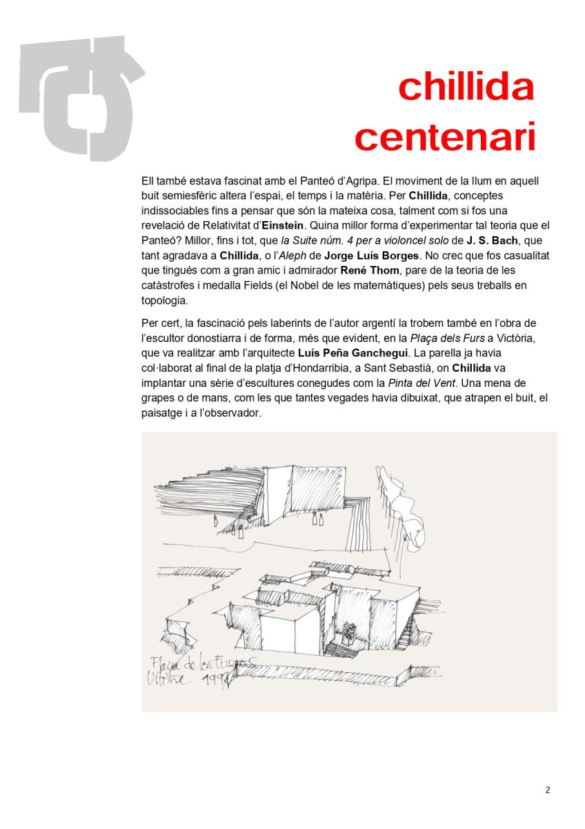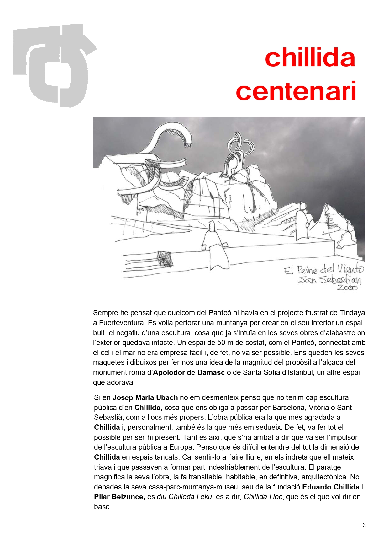L’escultor Eduardo Chillida, del que enguany es compleix el centenari del seu naixement, atrapa per la rotunditat de les seves peces monumentals, bàsicament de les que desenvolupa amb formigó armat, a voltes suspeses dramàticament en l’aire. Chillida no va parar de preguntar-se sobre l’espai, la matèria, la densitat i, sobretot, el buit. Preguntes certament relacionades a l’arquitectura quan aquesta transcendeix la mera construcció però sense l’obligació de respostes definitives en l’escultura. Ell mateix, es va arribar a definir com l’arquitecte del buit.