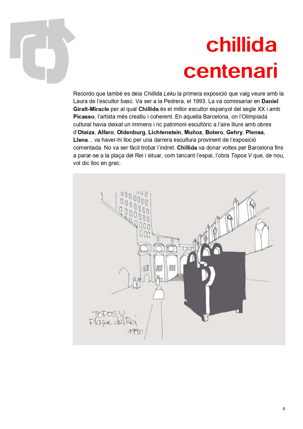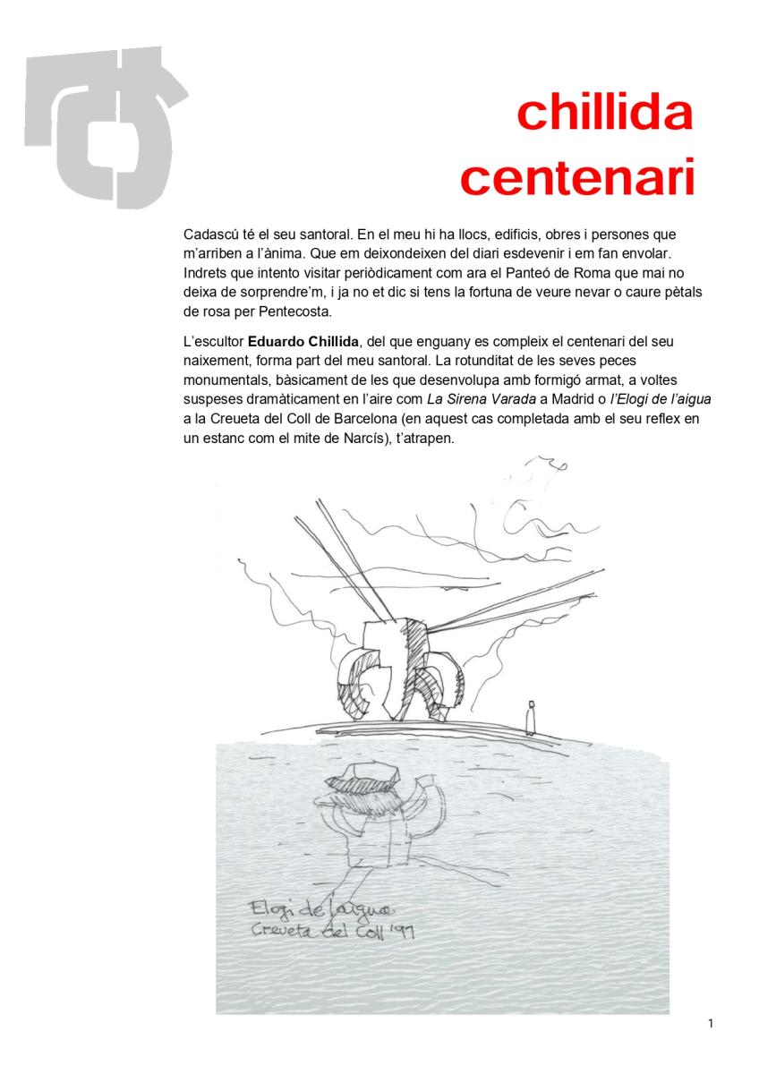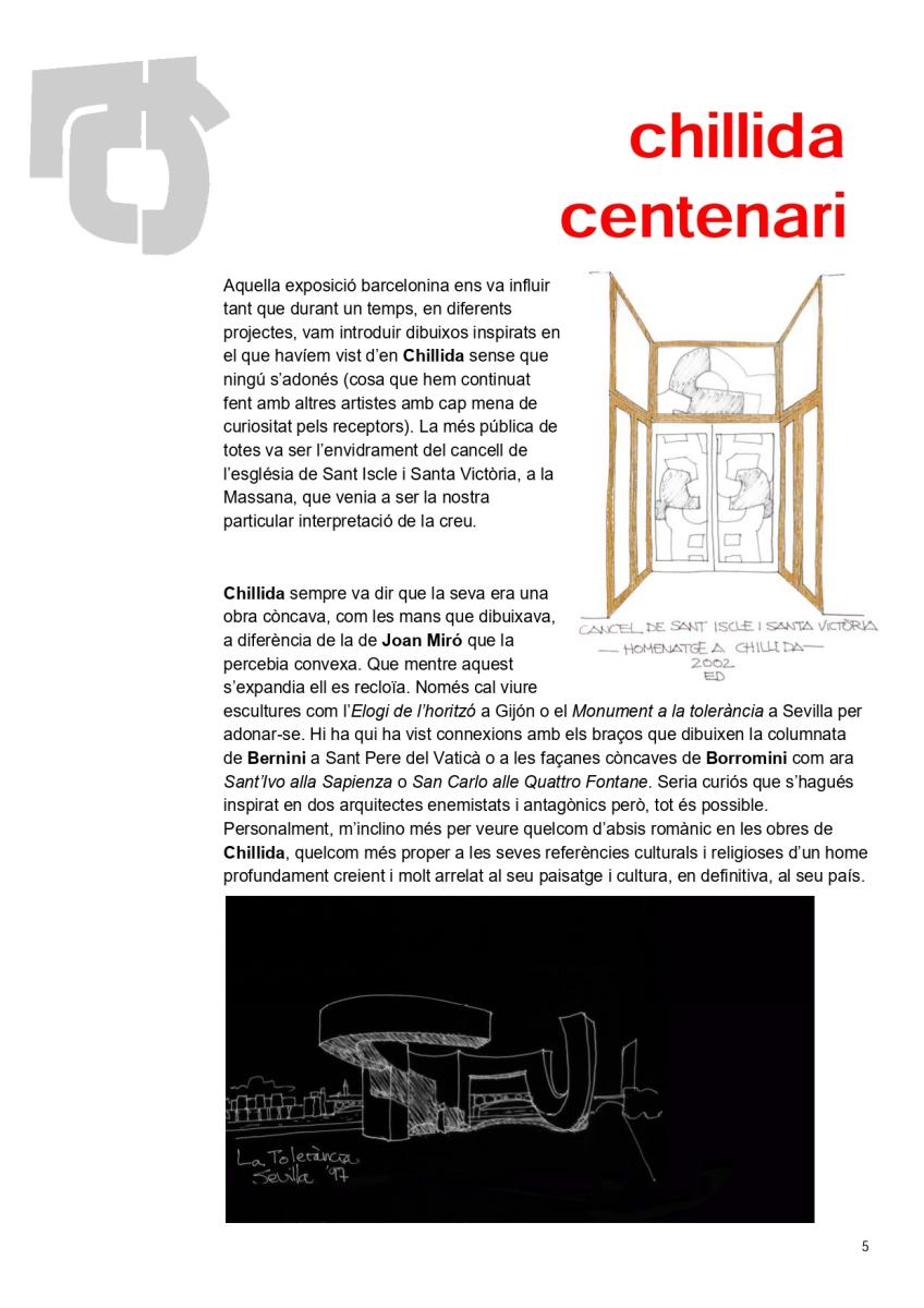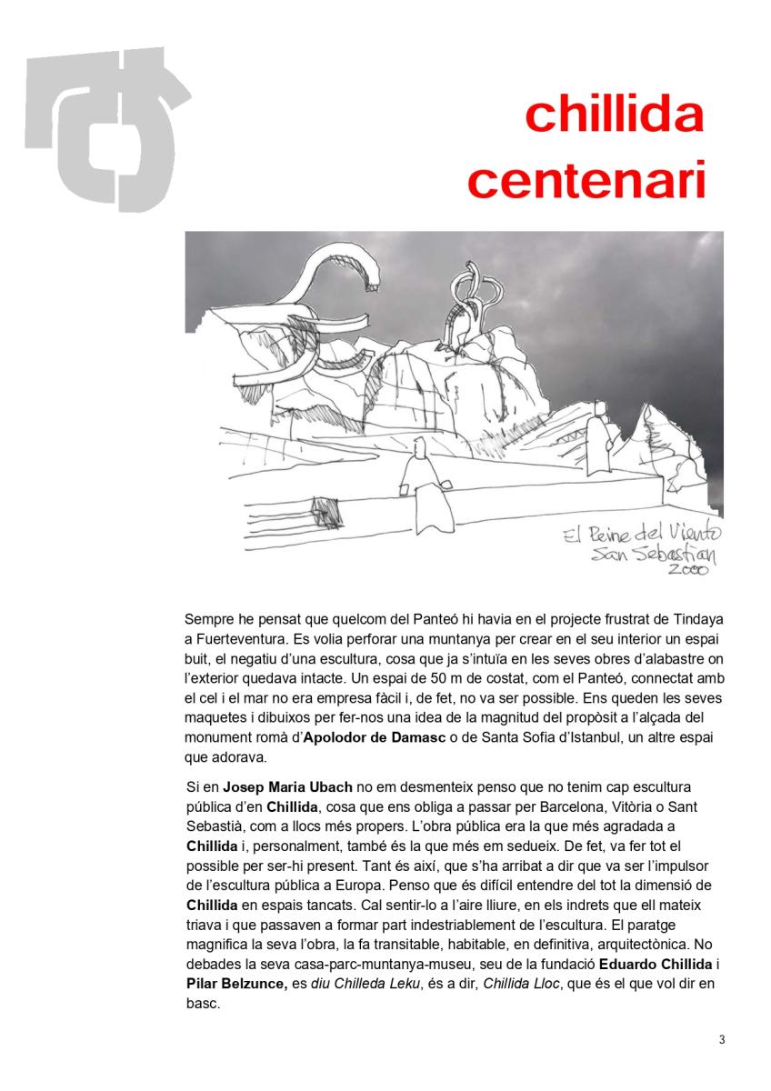 L’escultor Eduardo Chillida, del que enguany es compleix el centenari del seu naixement, atrapa per la rotunditat de les seves peces monumentals, bàsicament de les que desenvolupa amb formigó armat, a voltes suspeses dramàticament en l’aire. Chillida no va parar de preguntar-se sobre l’espai, la matèria, la densitat i, sobretot, el buit. Preguntes certament relacionades a l’arquitectura quan aquesta transcendeix la mera construcció però sense l’obligació de respostes definitives en l’escultura. Ell mateix, es va arribar a definir com l’arquitecte del buit.