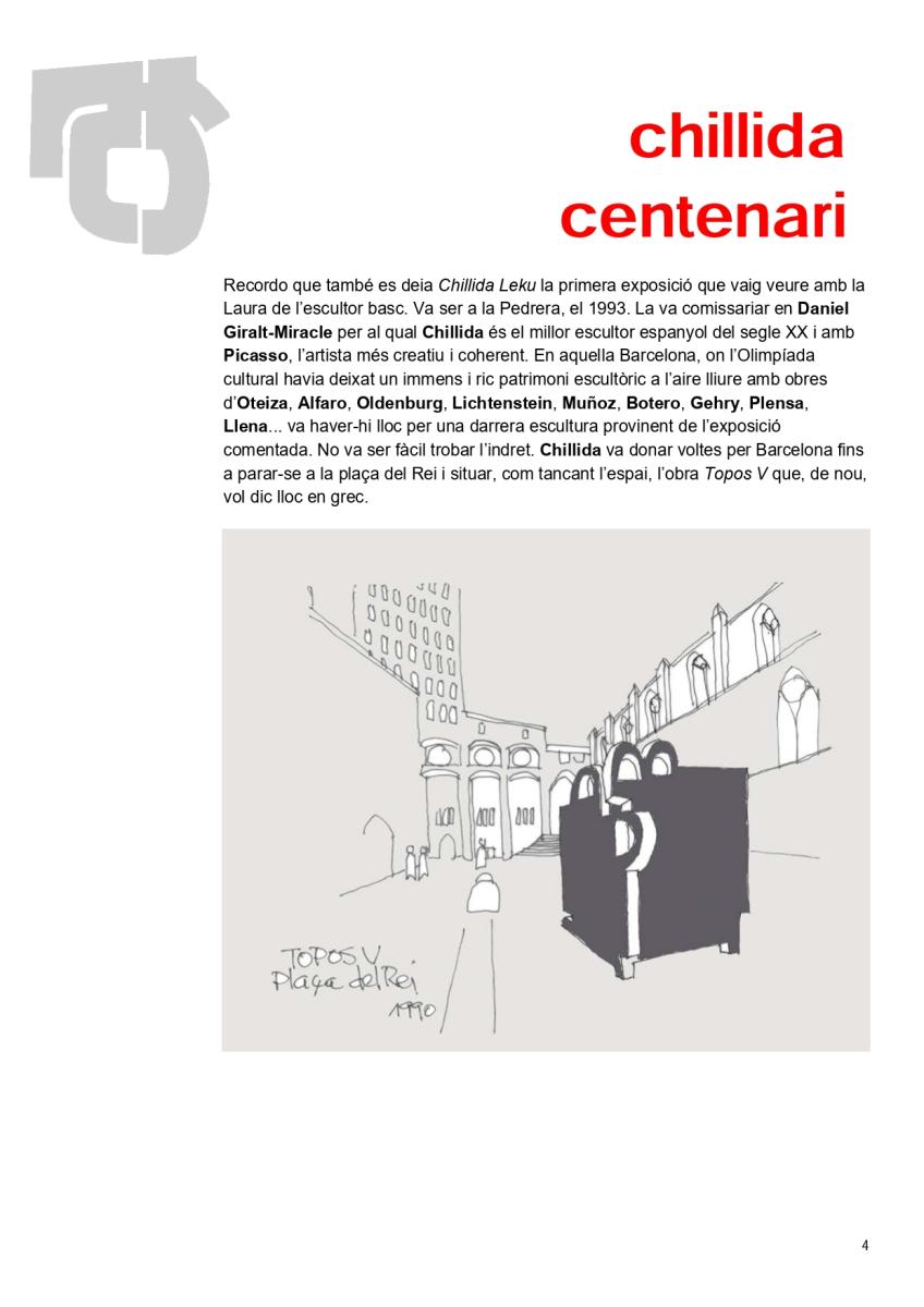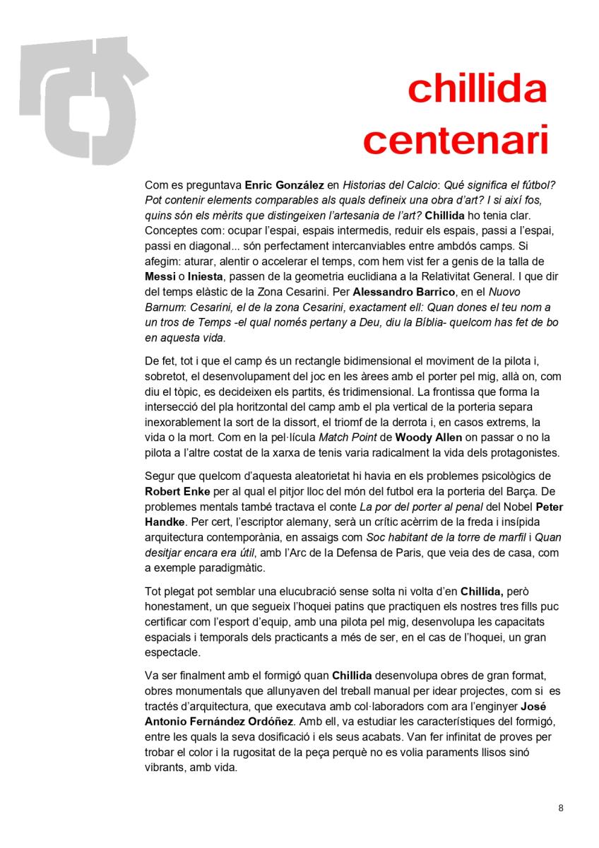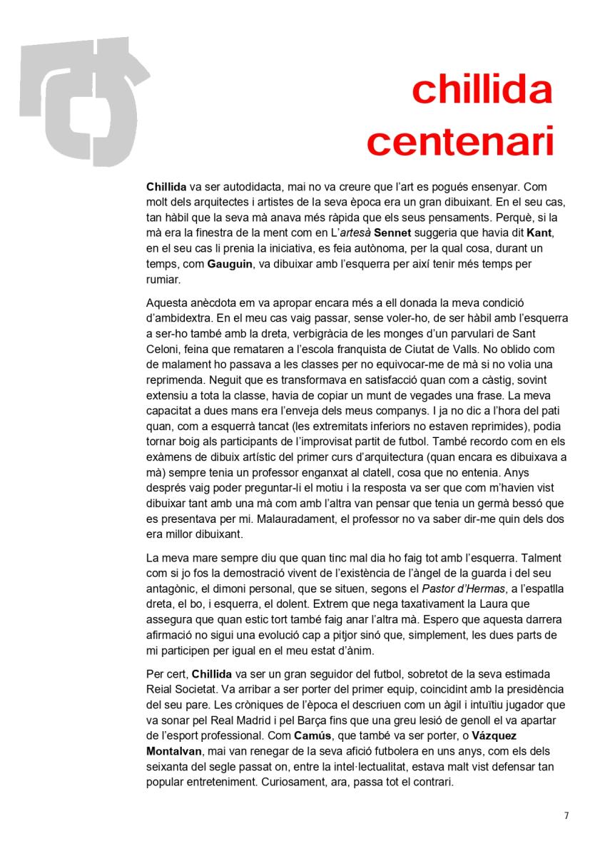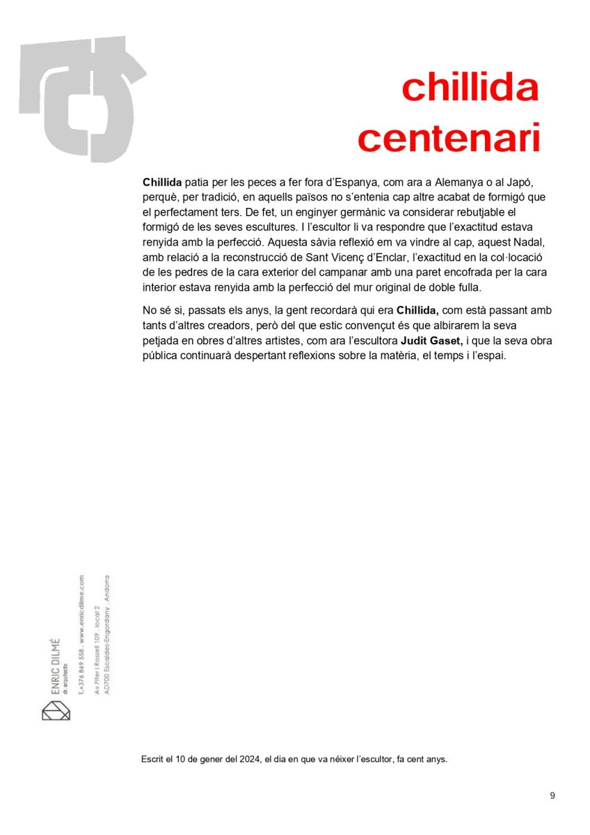 L’escultor Eduardo Chillida, del que enguany es compleix el centenari del seu naixement, atrapa per la rotunditat de les seves peces monumentals, bàsicament de les que desenvolupa amb formigó armat, a voltes suspeses dramàticament en l’aire. Chillida no va parar de preguntar-se sobre l’espai, la matèria, la densitat i, sobretot, el buit. Preguntes certament relacionades a l’arquitectura quan aquesta transcendeix la mera construcció però sense l’obligació de respostes definitives en l’escultura. Ell mateix, es va arribar a definir com l’arquitecte del buit.