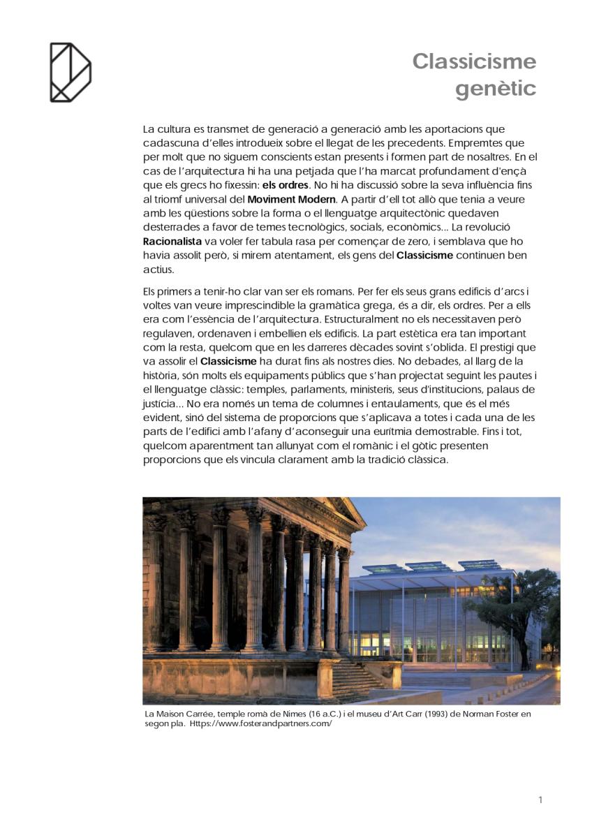 La cultura es transmet de generació a generació amb les aportacions que cadascuna d’elles introdueix sobre el llegat de les precedents. Empremtes que per molt que no siguem conscients estan presents i formen part de nosaltres. En el cas de l’arquitectura hi ha una petjada que l’ha marcat profundament d'ençà que els grecs ho fixessin: els ordres.