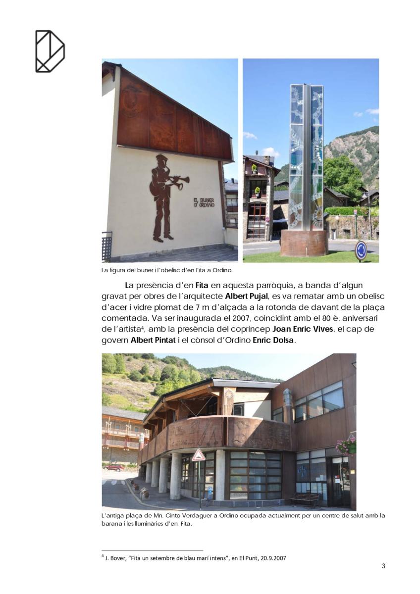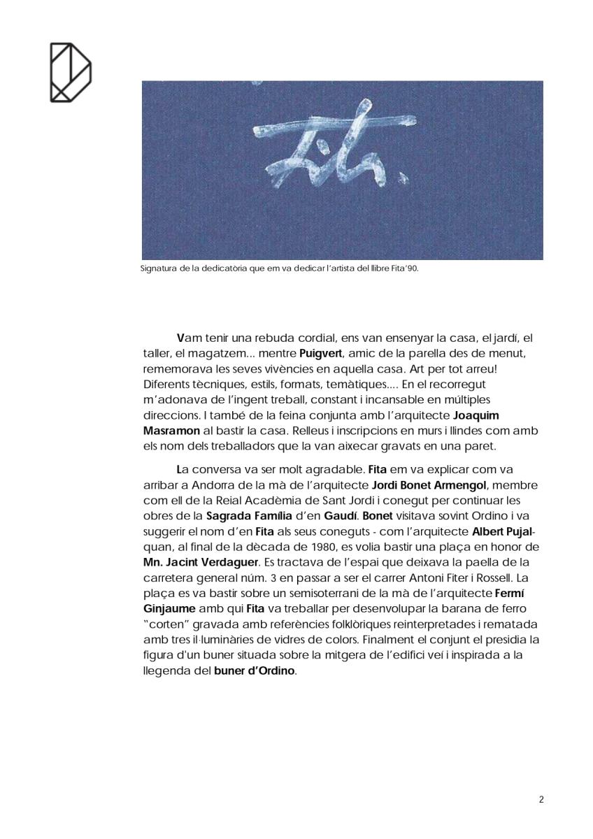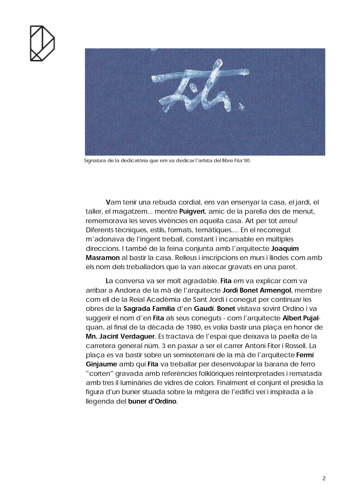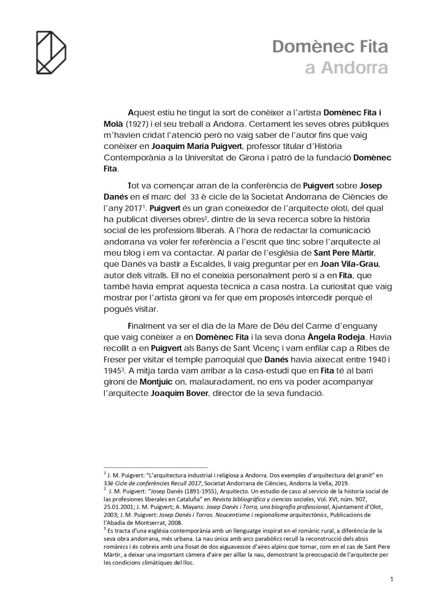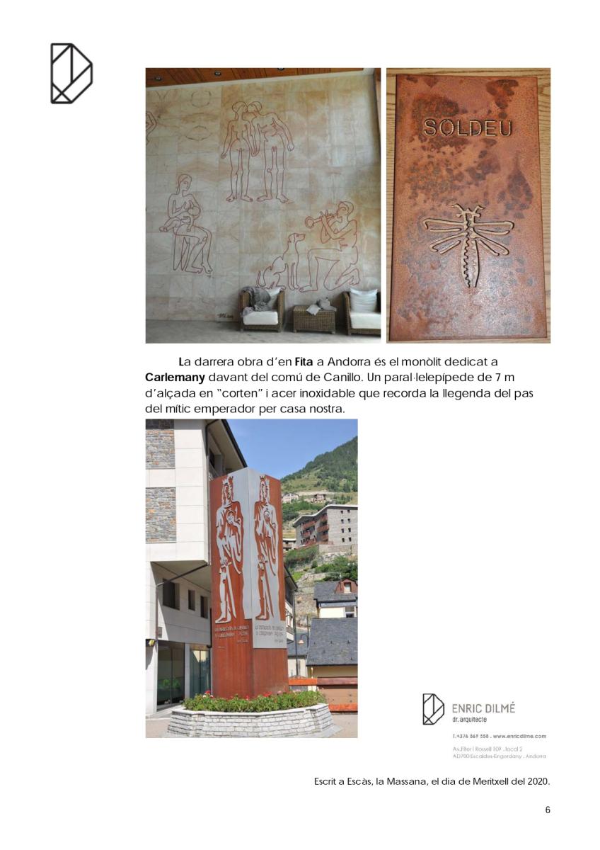 Aquest estiu he tingut la sort de conèixer a l’artista Domènec Fita i Molà (1927) i el seu treball a Andorra. Certament les seves obres públiques m’havien cridat l’atenció però no vaig saber de l’autor fins que vaig conèixer en Joaquim Maria Puigvert, professor titular d’Història Contemporània a la Universitat de Girona i patró de la fundació Domènec Fita.