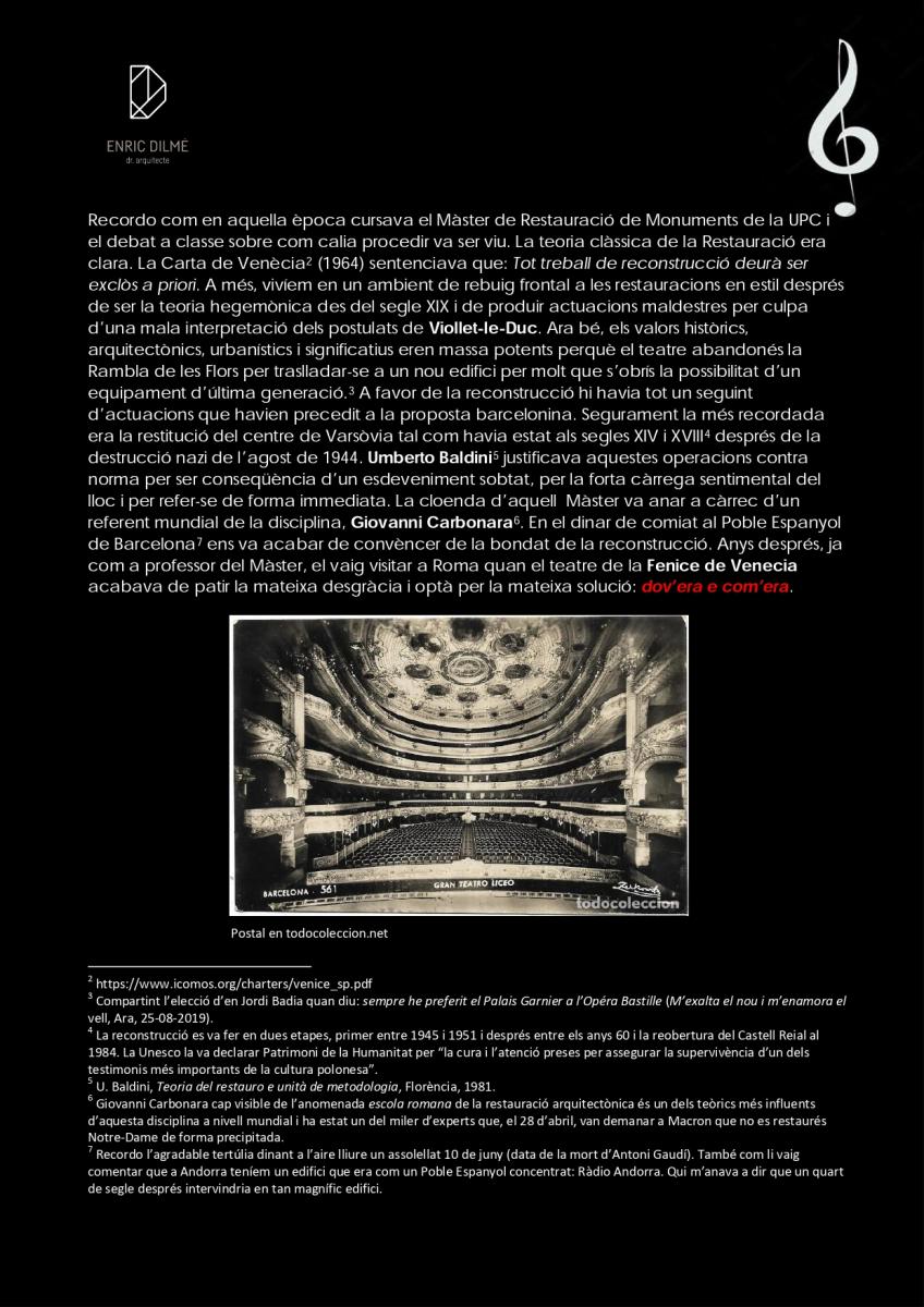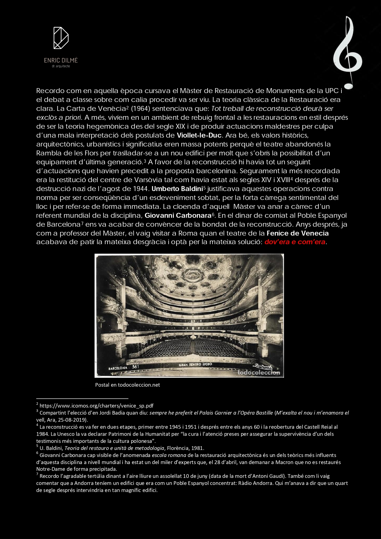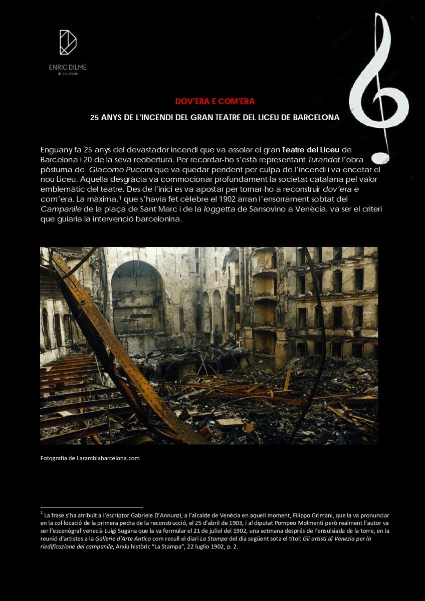 Enguany fa 25 anys del devastador incendi que va assolar el gran Teatre del Liceu de Barcelona i 20 de la seva reobertura. Per recordar-ho s’està representant Turandot l’obra pòstuma de Giacomo Puccini que va quedar pendent per culpa de l’incendi i va encetar el nou Liceu. Aquella desgràcia va commocionar profundament la societat catalana pel valor emblemàtic del teatre. Des de l’inici es va apostar per tornar-ho a reconstruir dov’era e com’era.