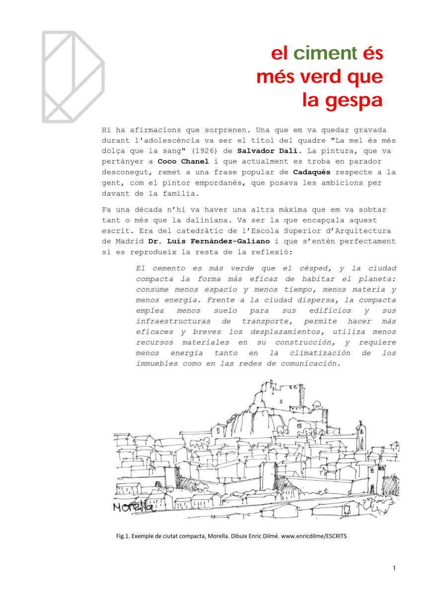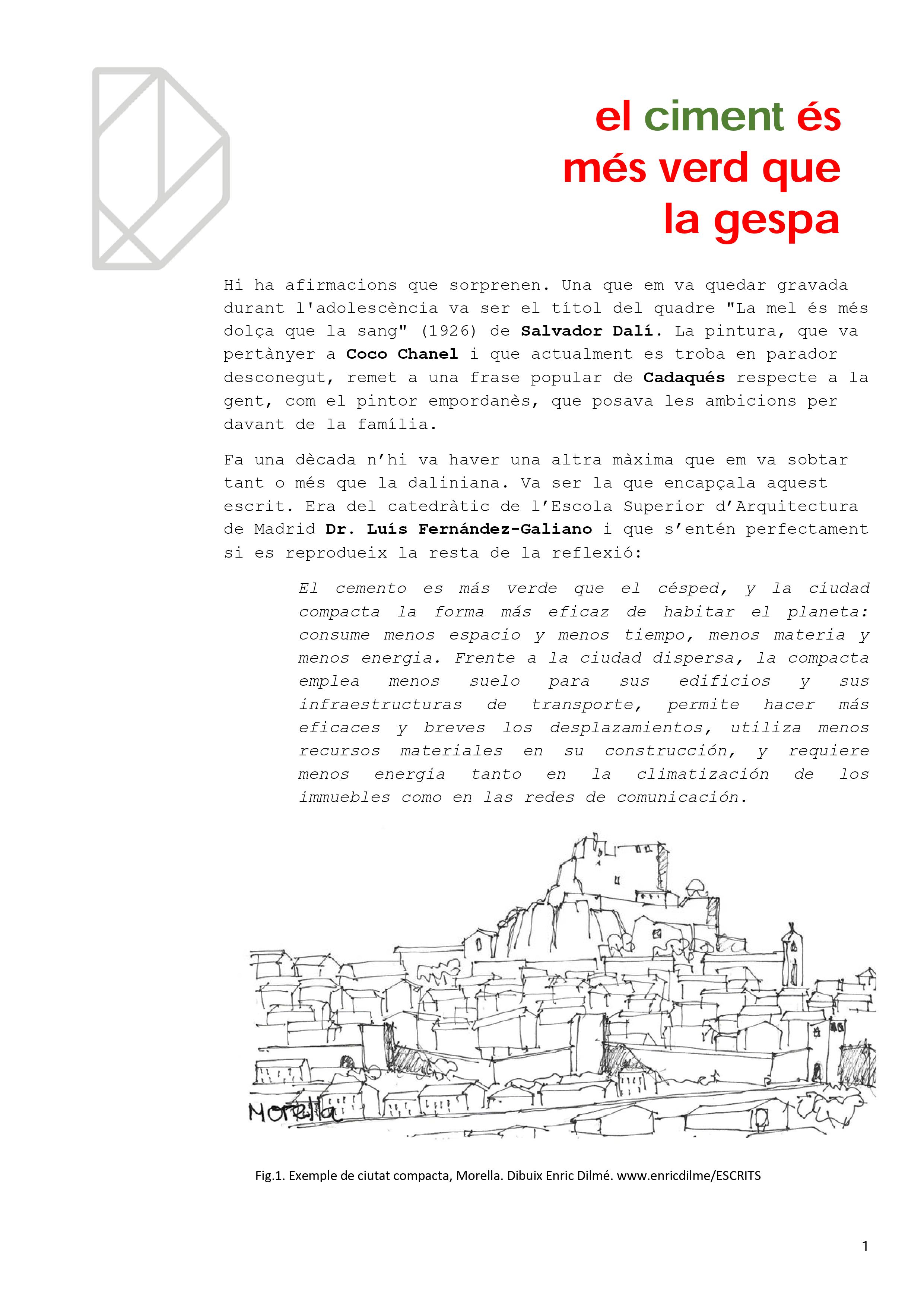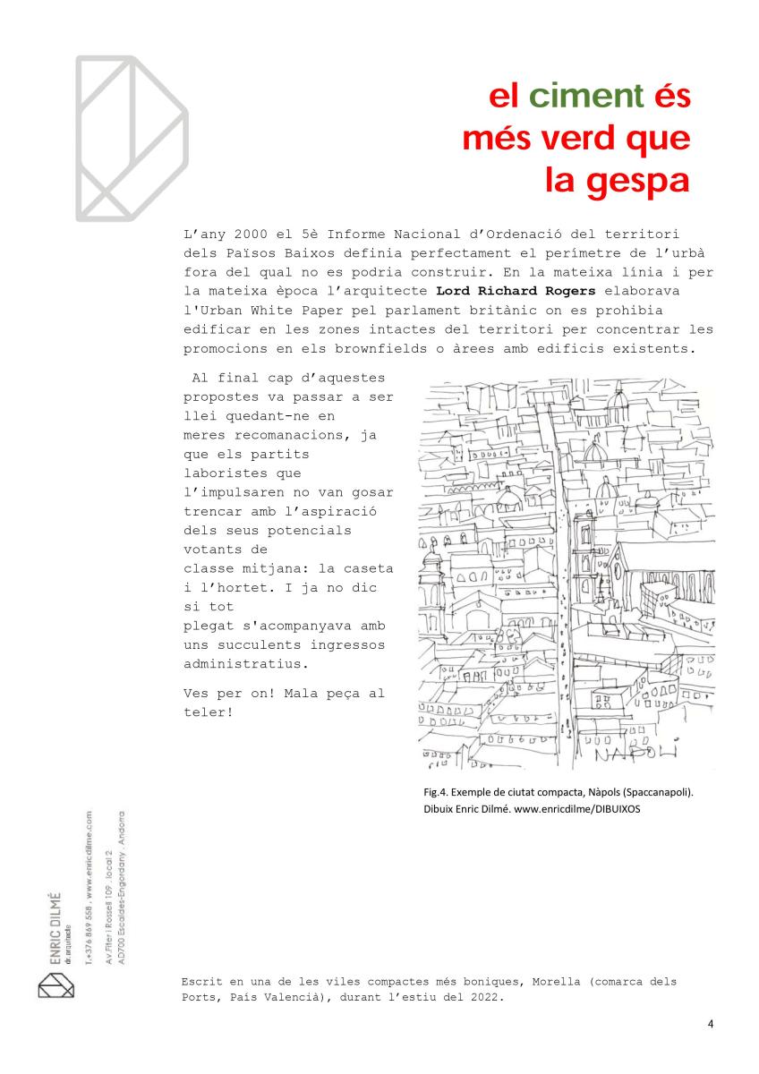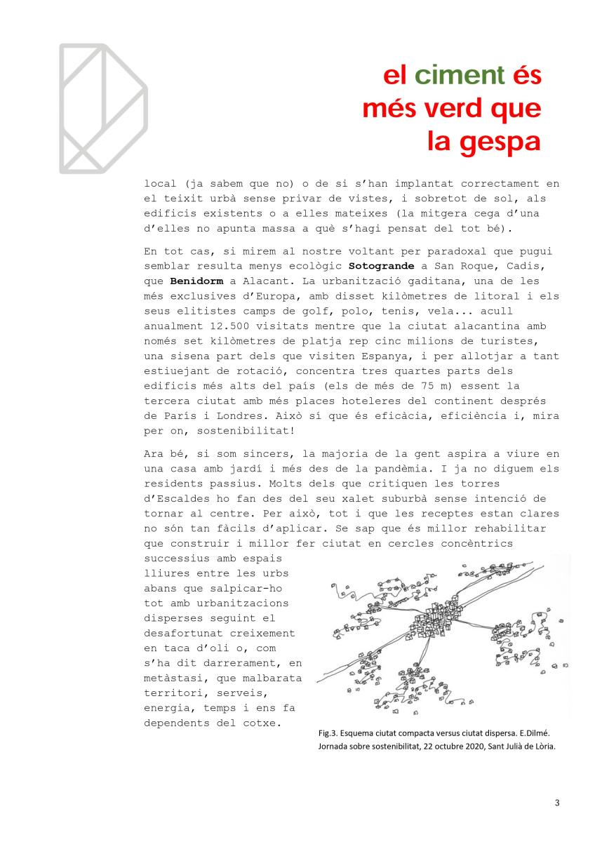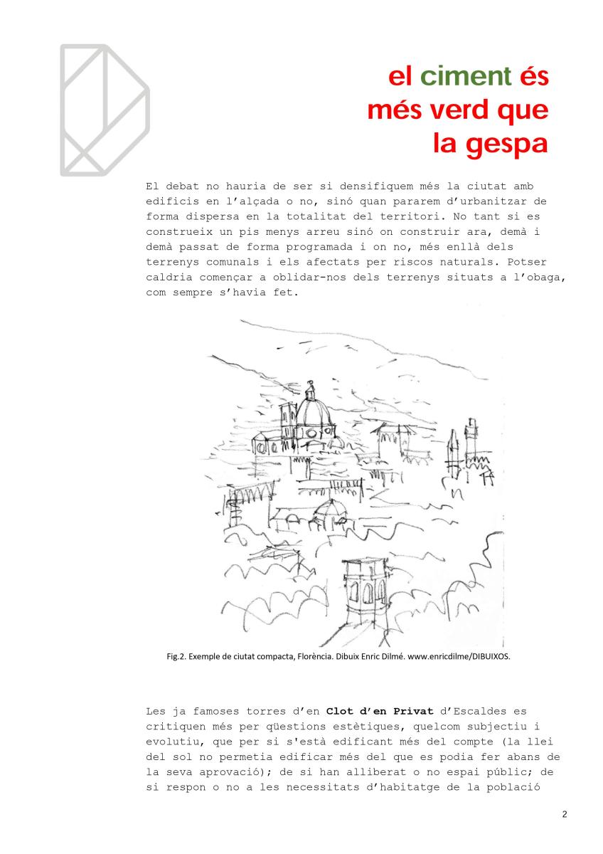 El debat no hauria de ser si densifiquem més la ciutat amb edificis en l’alçada o no, sinó quan pararem d’urbanitzar de forma dispersa en la totalitat del territori. No tant si es construeix un pis menys arreu sinó on construir ara, demà i demà passat de forma programada i on no, més enllà dels terrenys comunals i els afectats per riscos naturals.