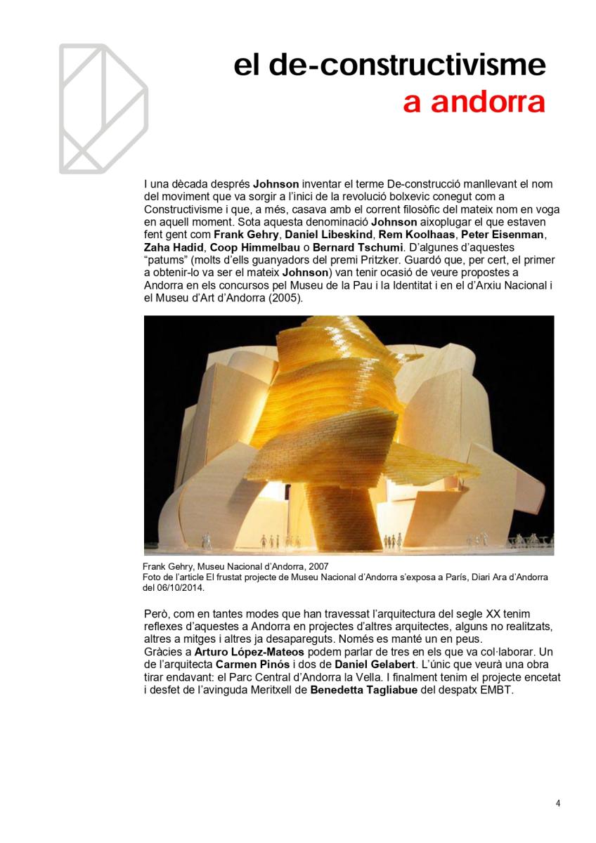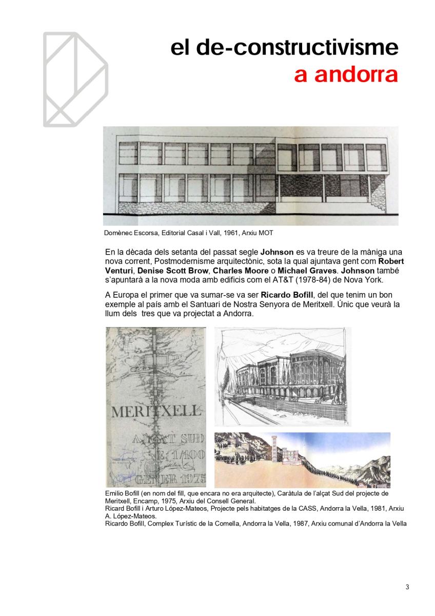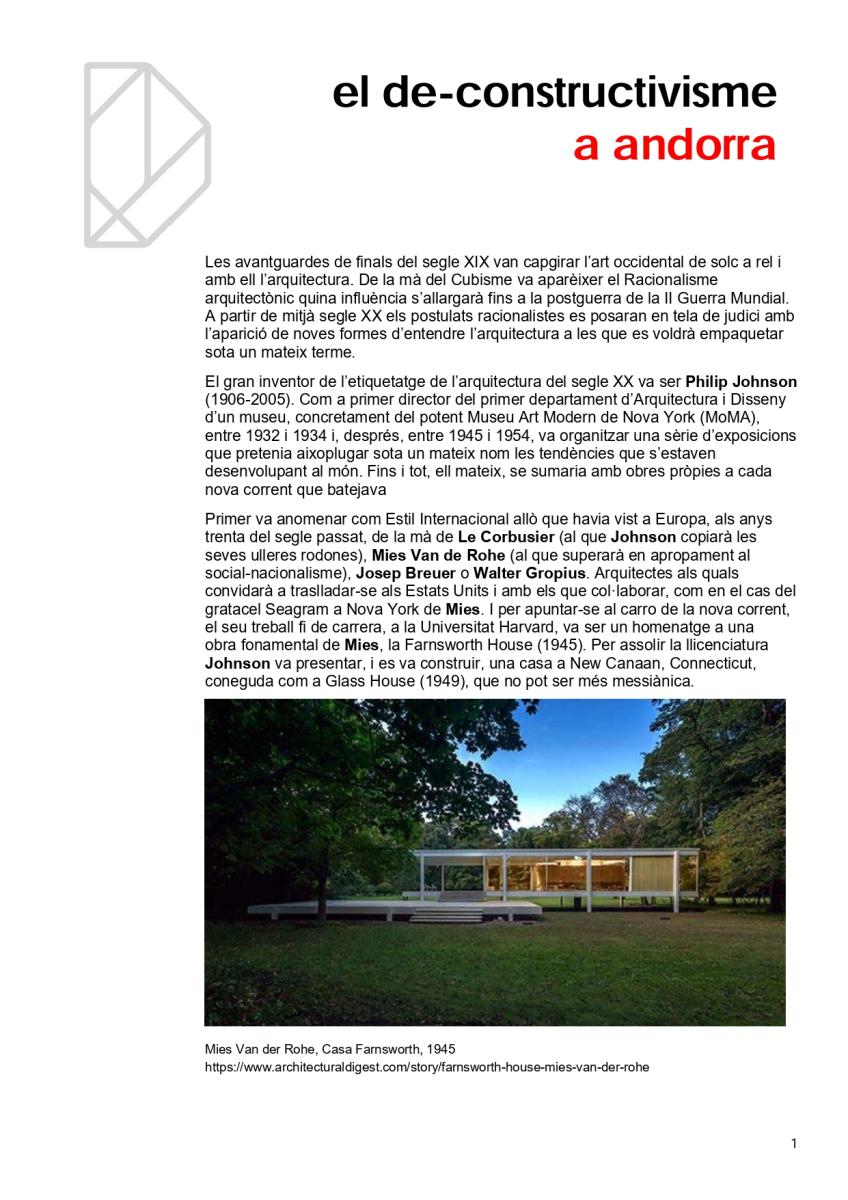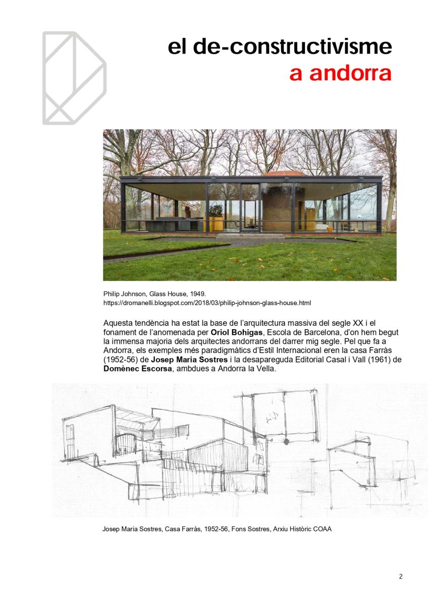 El gran inventor de l’etiquetatge de l’arquitectura del segle XX va ser Philip Johnson (1906-2005). Primer va anomenar com Estil Internacional allò que havia vist a Europa, als anys trenta del segle passat, de la mà de Le Corbusier (al que Johnson copiarà les seves ulleres rodones), Mies Van de Rohe (al que superarà en apropament al social-nacionalisme), Josep Breuer o Walter Gropius. Aquesta tendència ha estat la base de l’arquitectura massiva del segle XX i el fonament de l’anomenada per Oriol Bohigas, Escola de Barcelona, d’on hem begut la immensa majoria dels arquitectes andorrans del darrer mig segle.