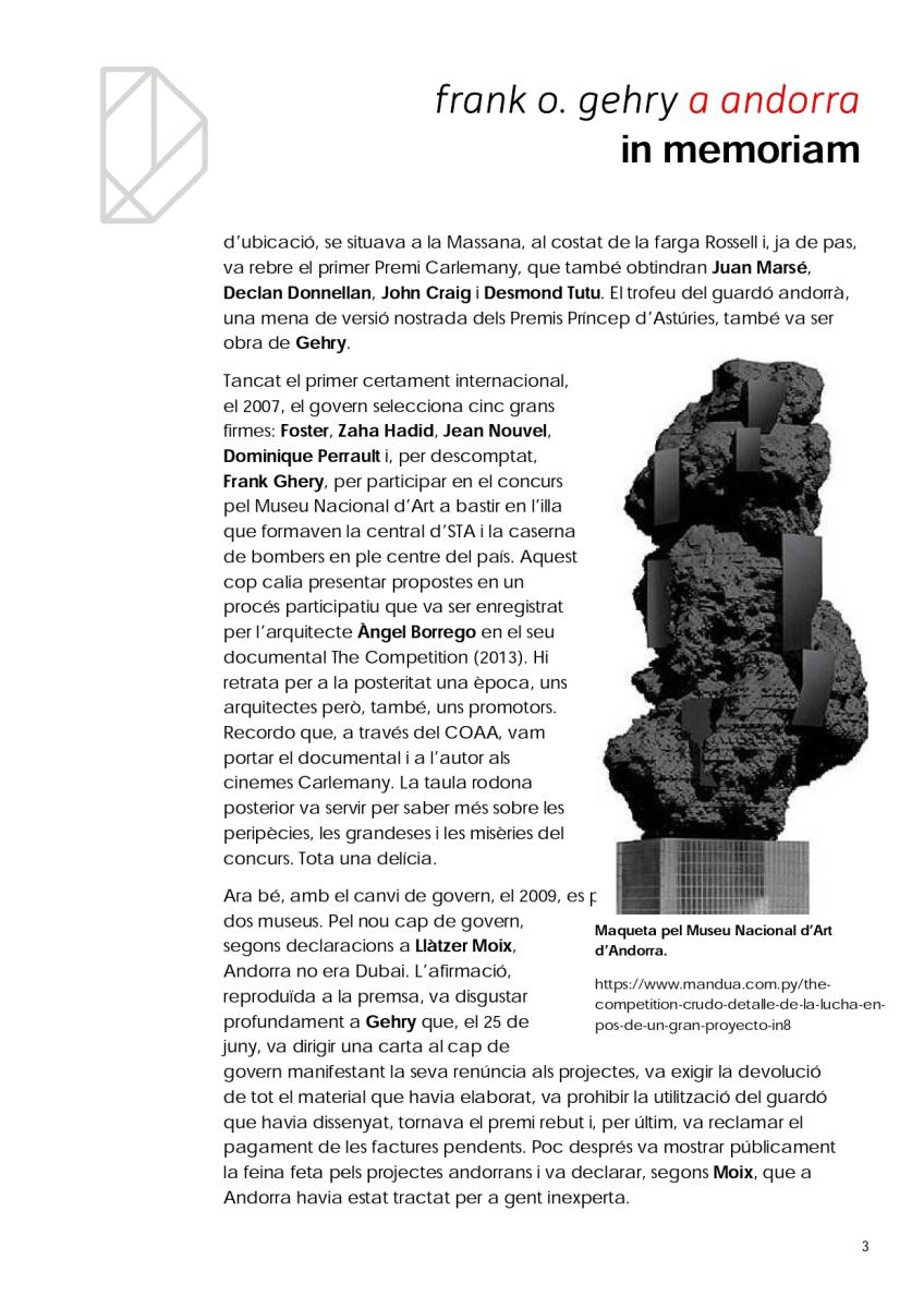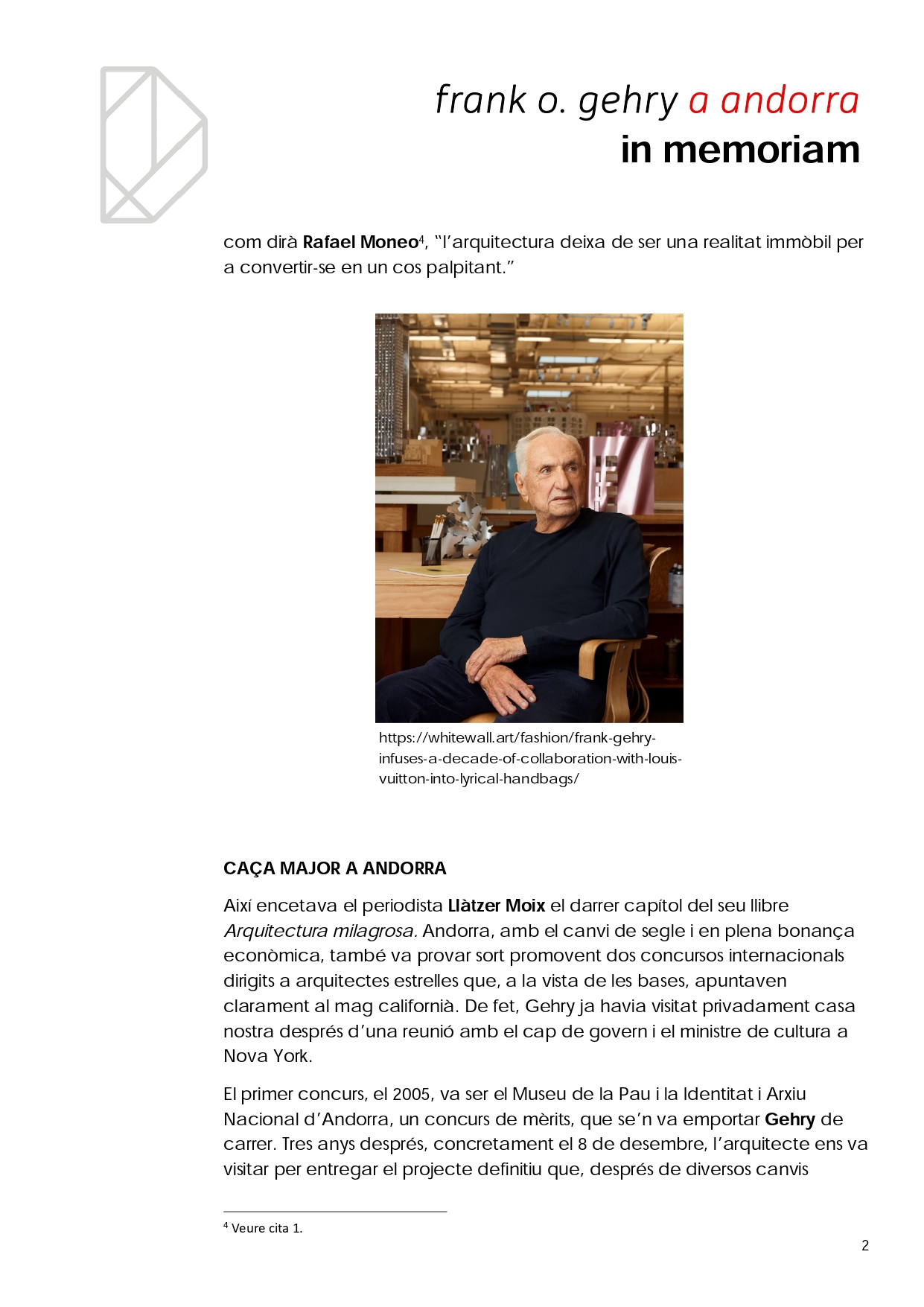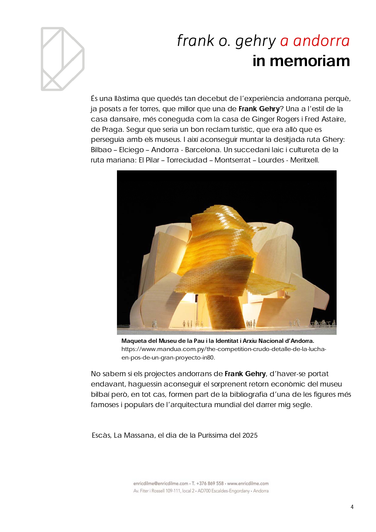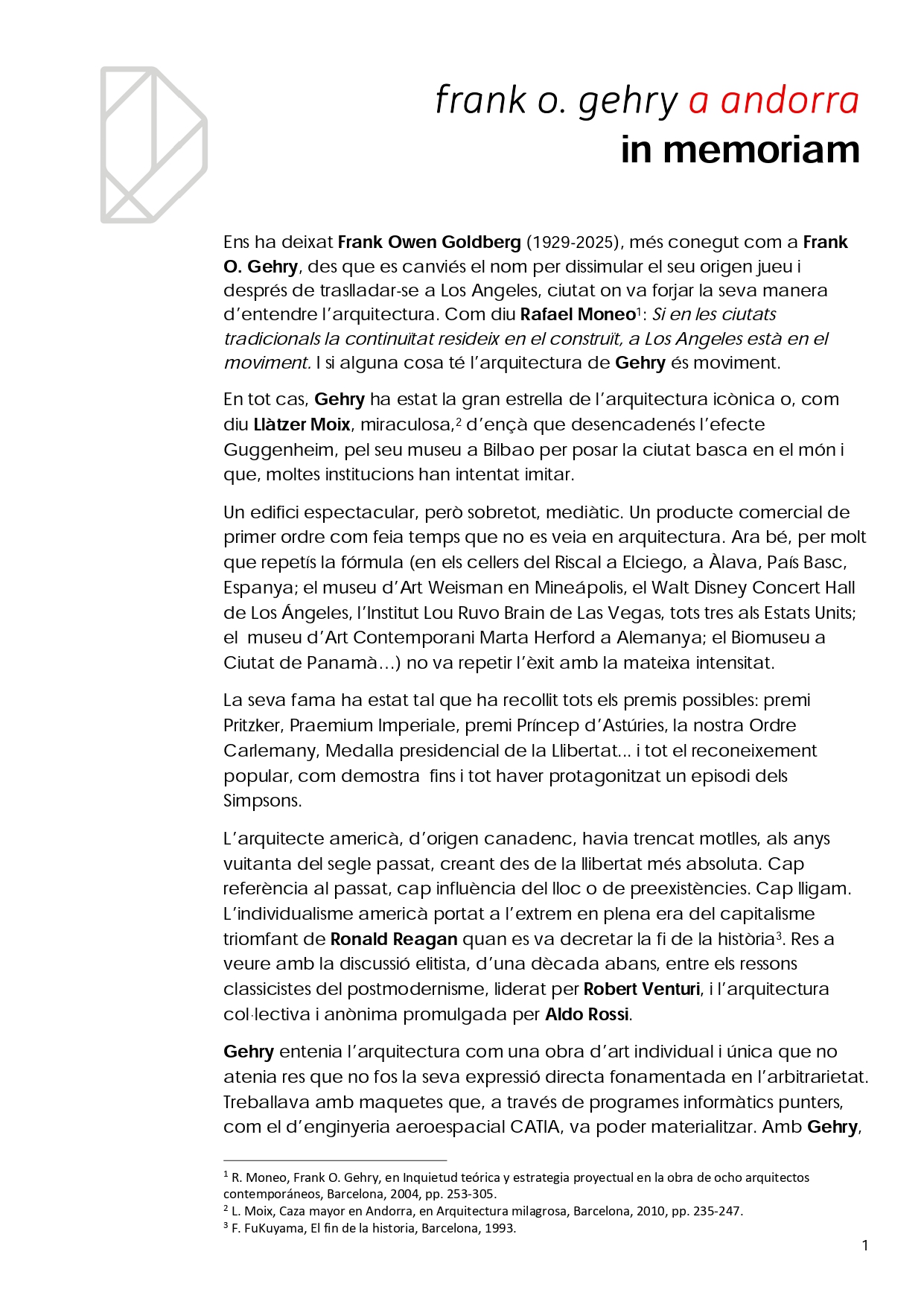 Ens ha deixat Frank Owen Goldberg (1929-2025), més conegut com a Frank O. Gehry. Gehry entenia l’arquitectura com una obra d’art individual i única que no atenia res que no fos la seva expressió directa fonamentada en l’arbitrarietat.