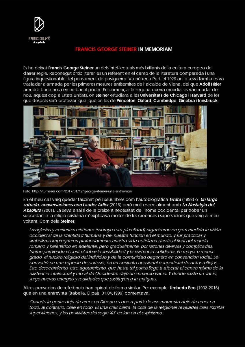 Es ha deixat Francis George Steiner un dels intel·lectuals més brillants de la cultura europea del darrer segle. Reconegut crític literari és un referent en el camp de la literatura comparada i una figura inqüestionable del pensament de postguerra.