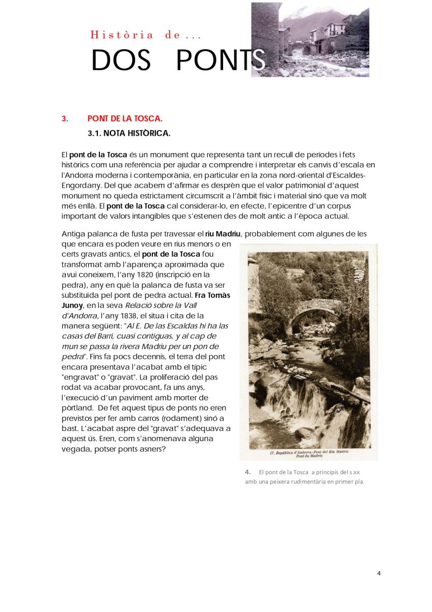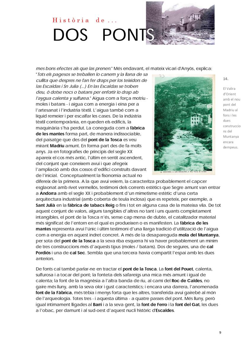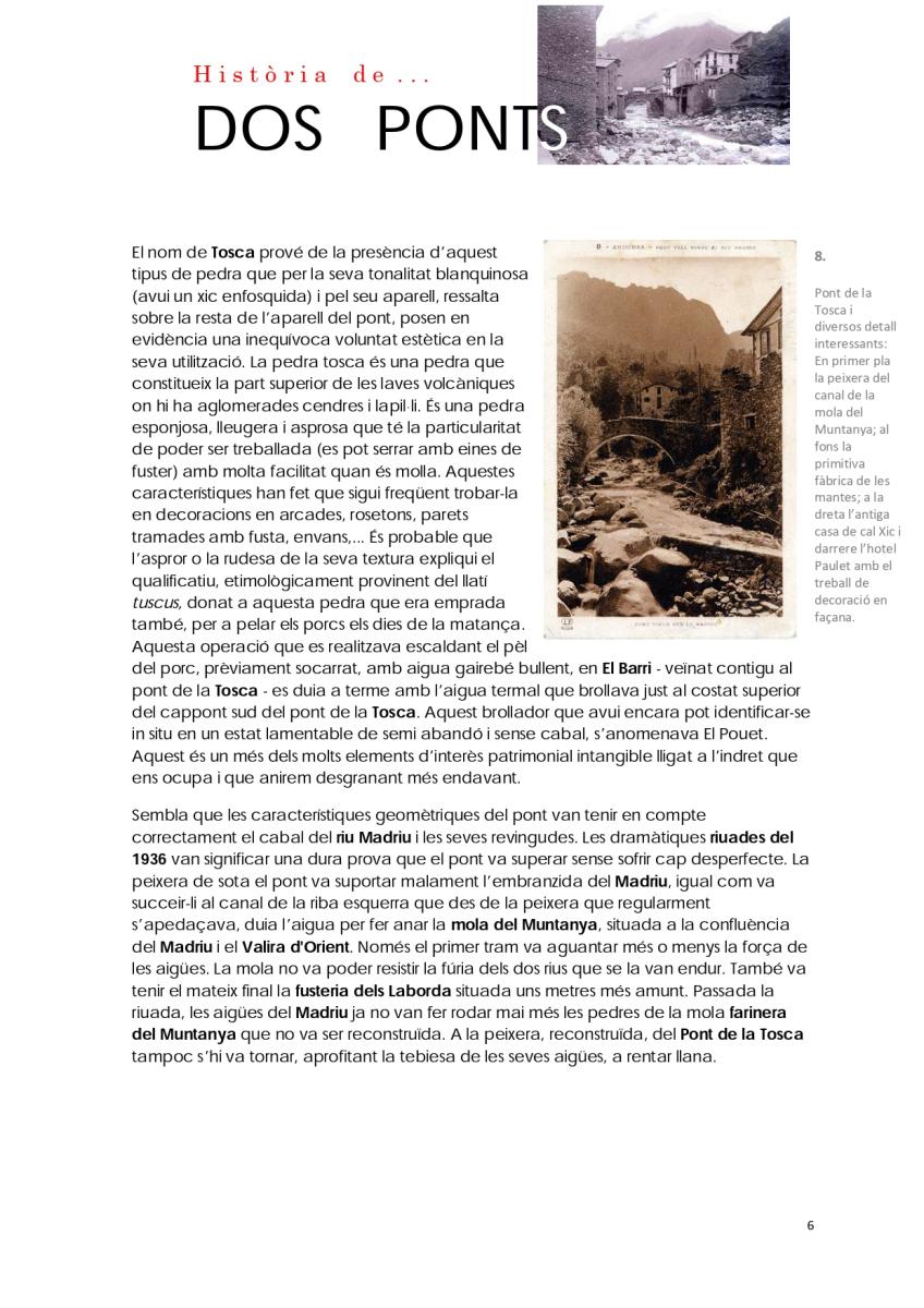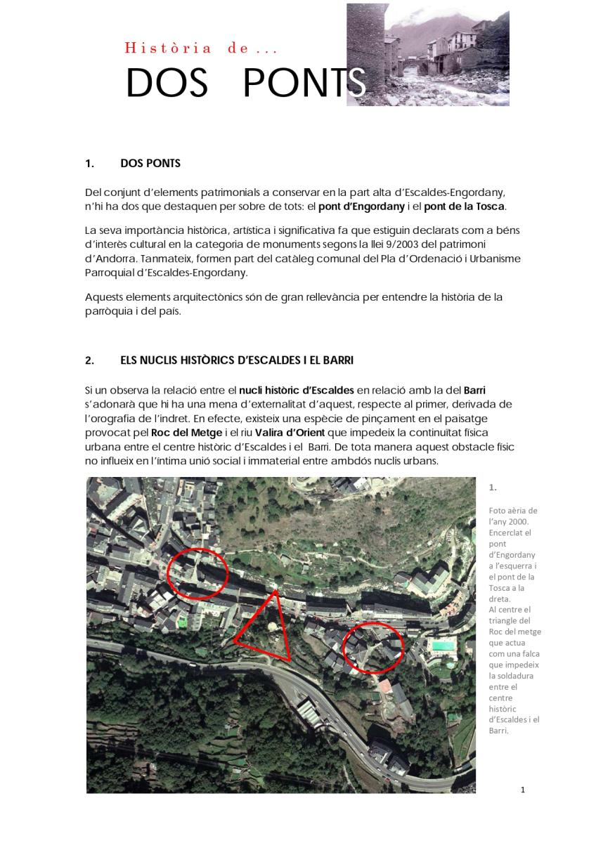 Del conjunt d'elements patrimonials a conservar en la part alta d'Escaldes-Engordany, n'hi ha dos que destaquen per sobre de tots: el pont d'Engordany i el pont de la Tosca.