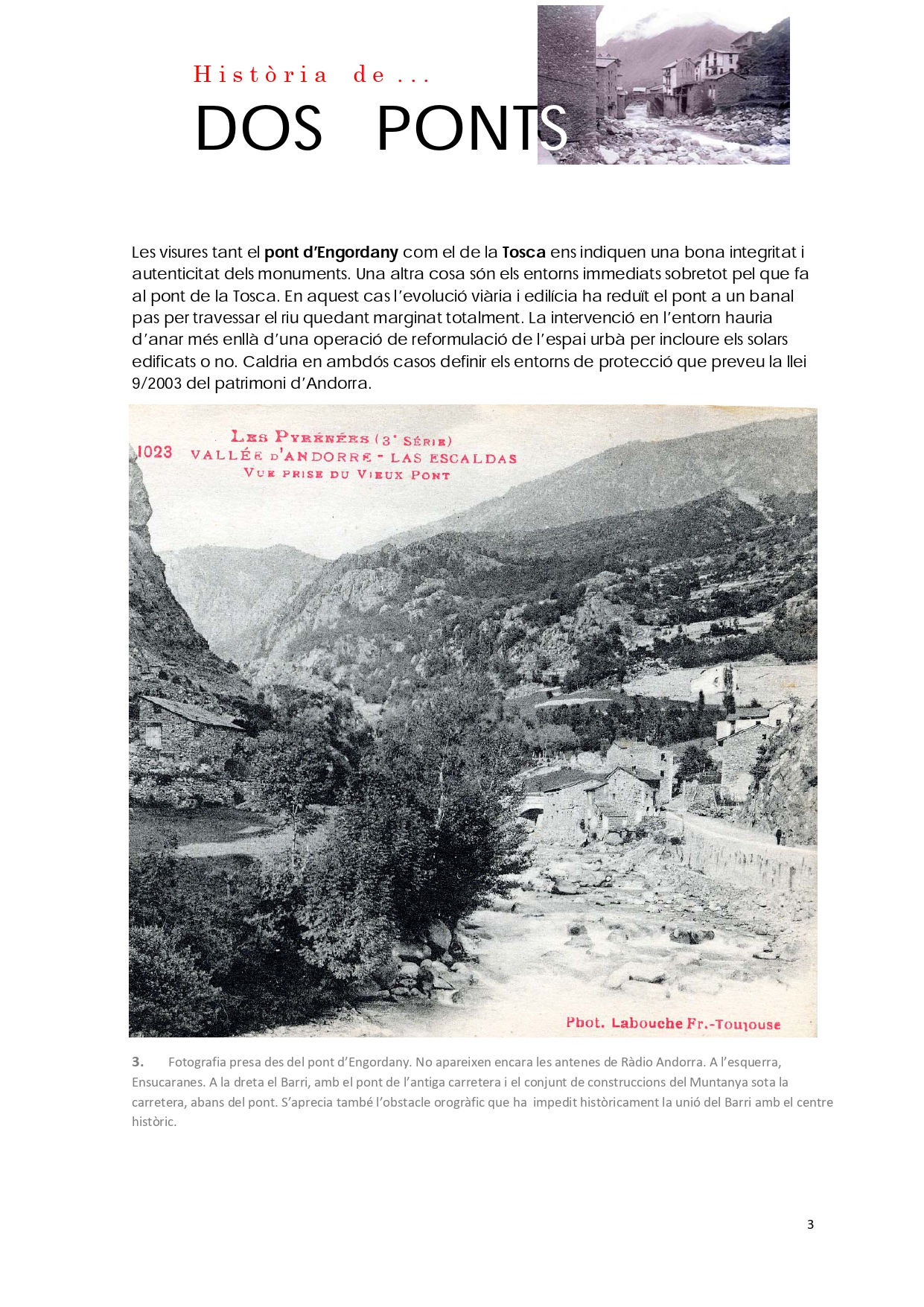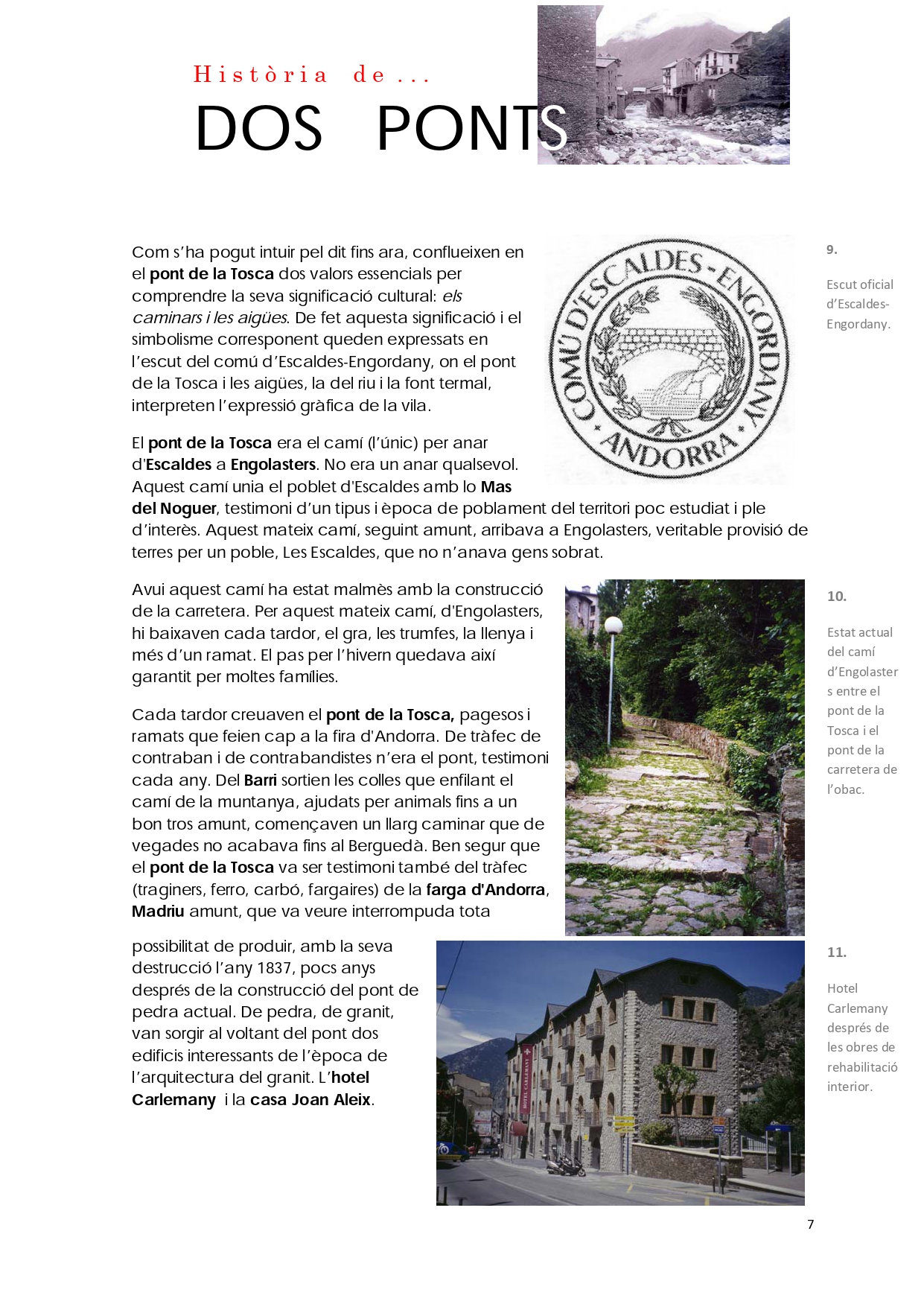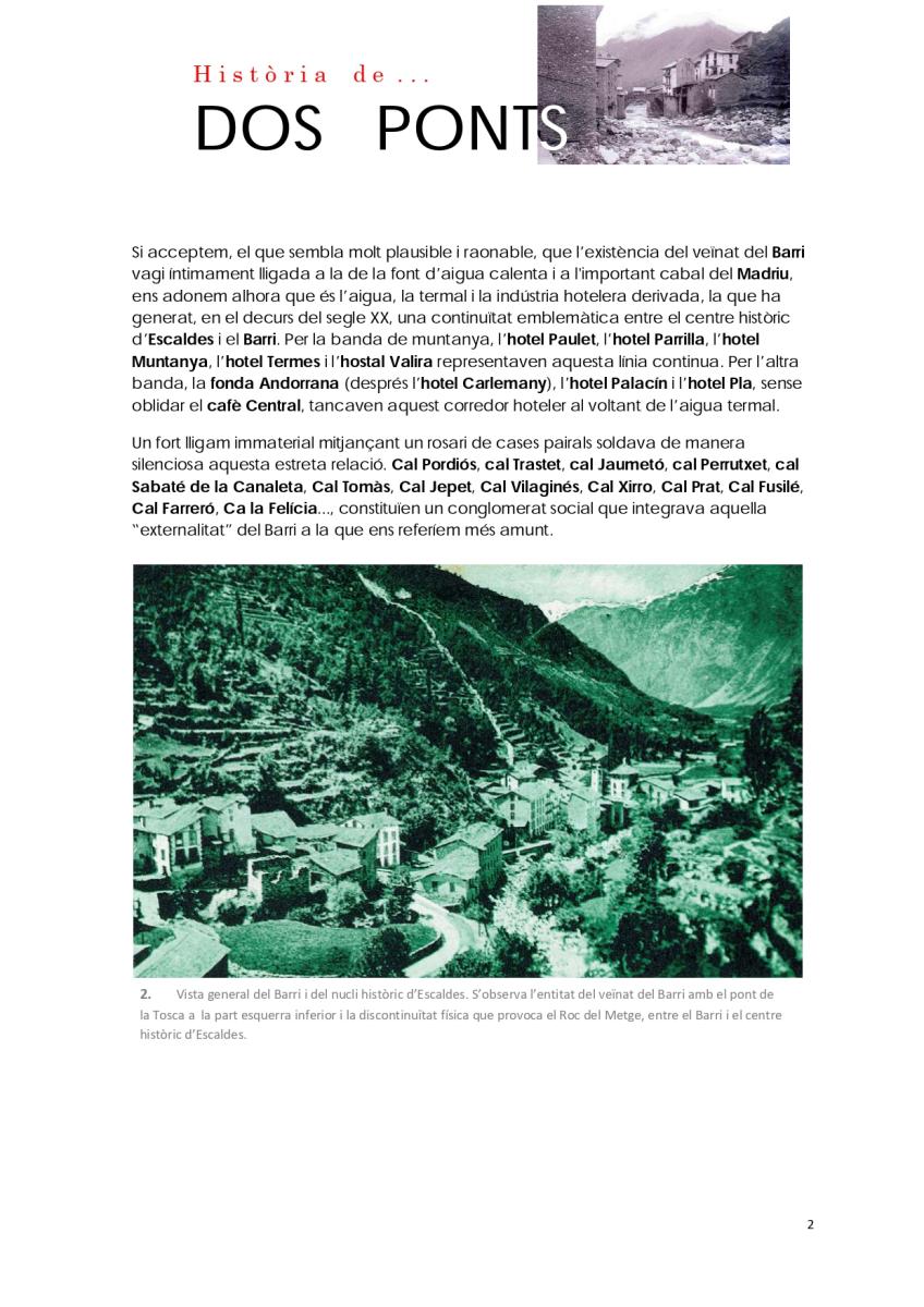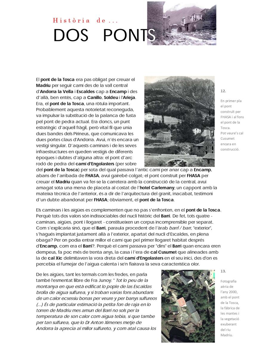 Del conjunt d'elements patrimonials a conservar en la part alta d'Escaldes-Engordany, n'hi ha dos que destaquen per sobre de tots: el pont d'Engordany i el pont de la Tosca.