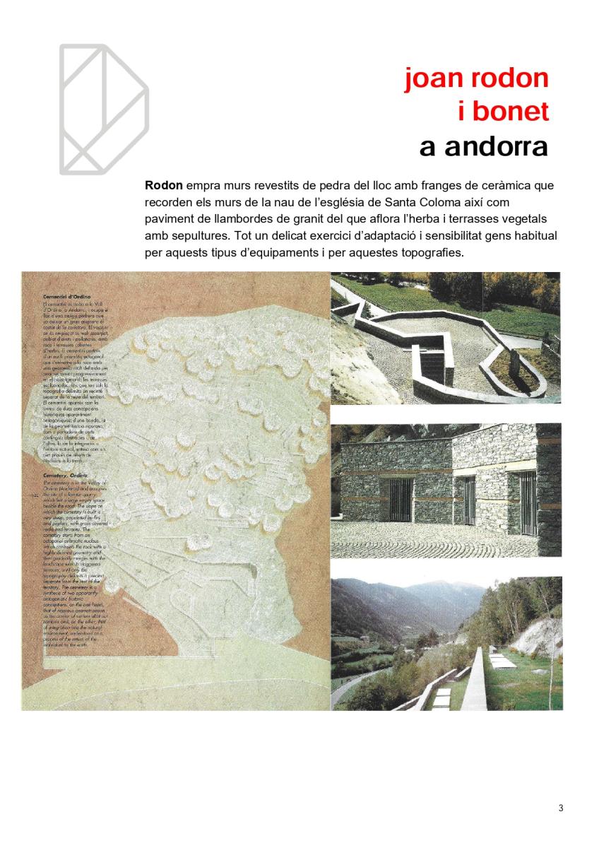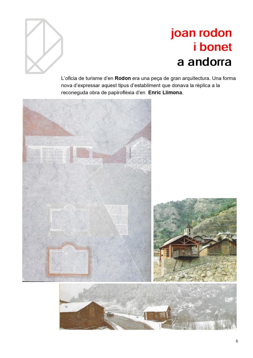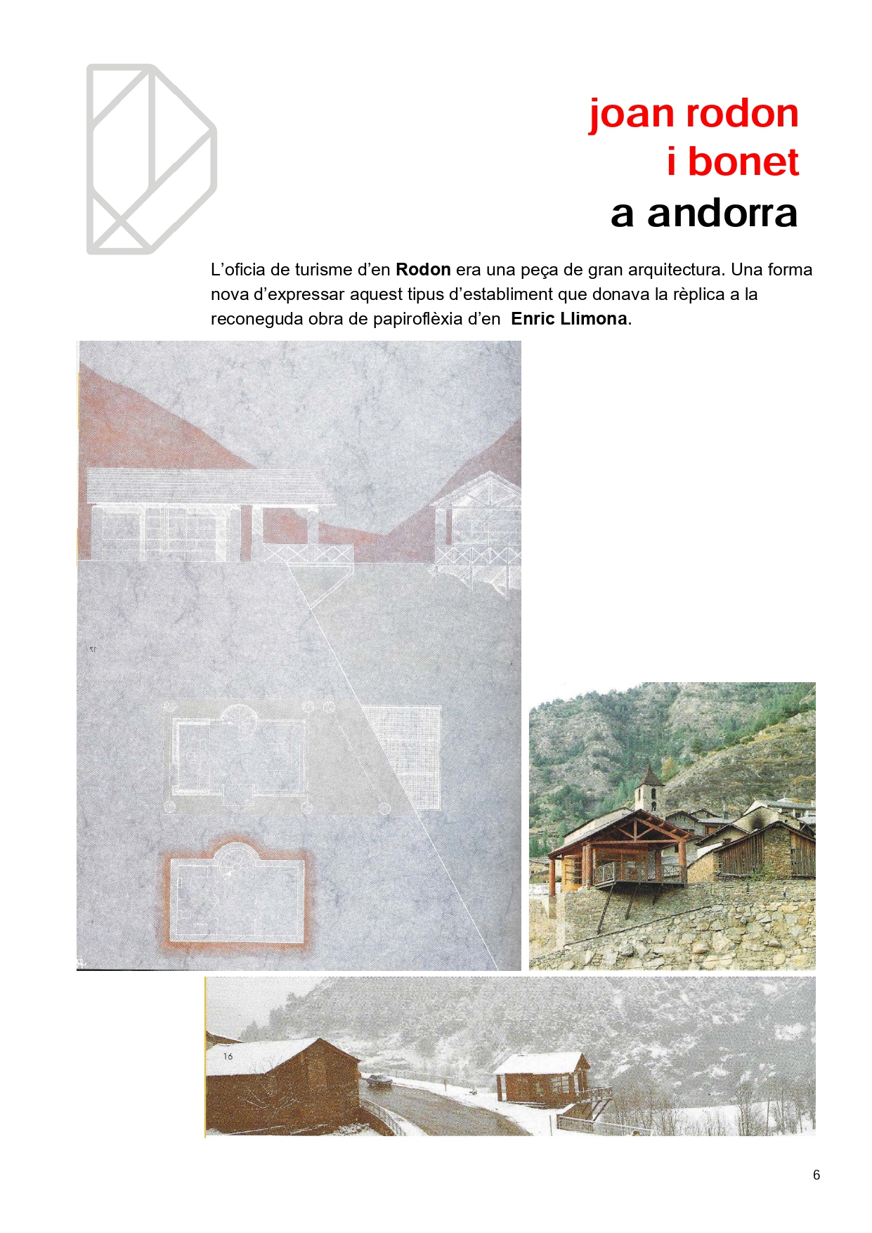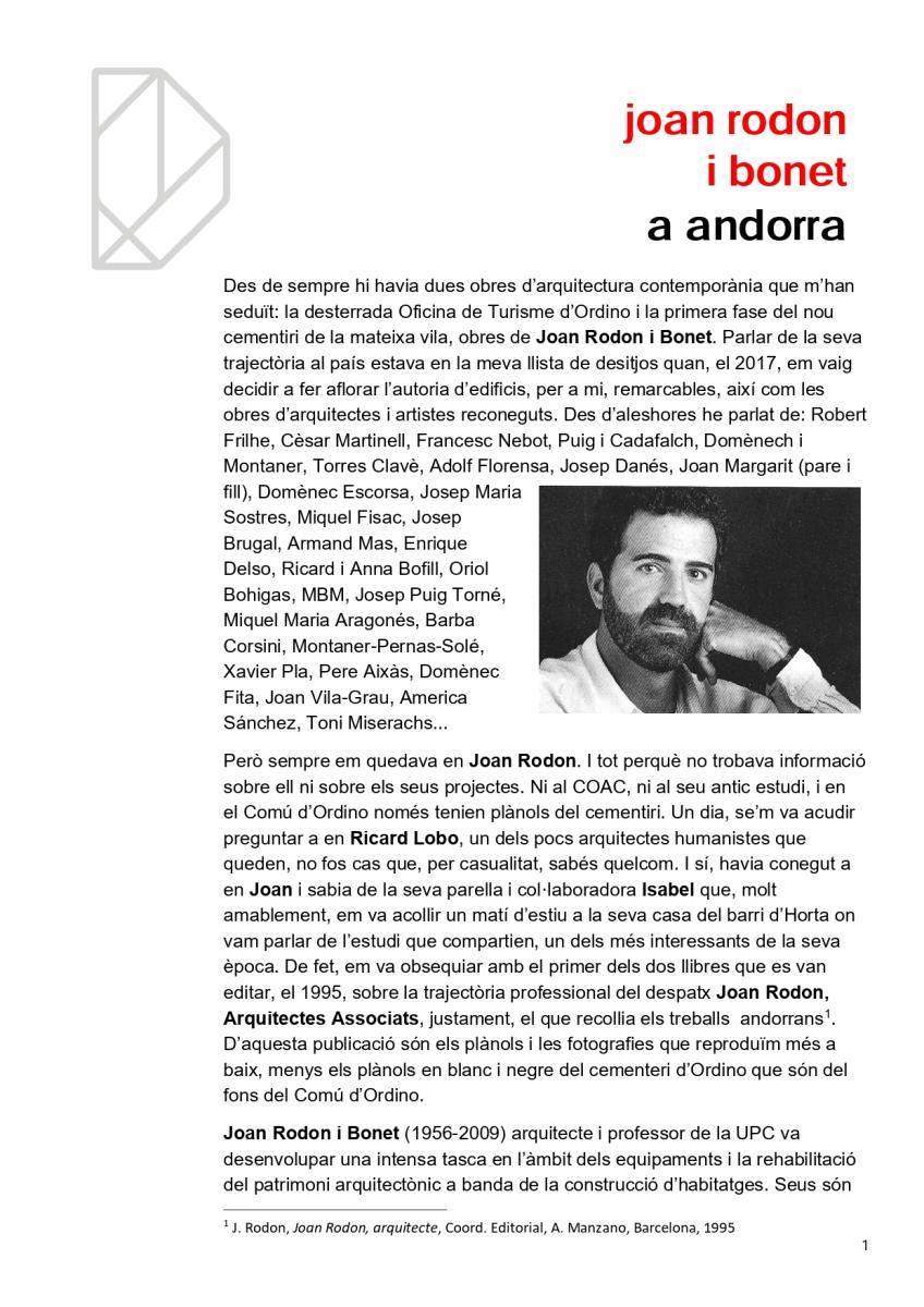 Des de sempre hi havia dues obres d’arquitectura contemporània que m’han seduït: la desterrada Oficina de Turisme d’Ordino i la primera fase del nou cementiri de la mateixa vila, obres de Joan Rodon i Bonet. Parlar de la seva trajectòria al país estava en la meva llista de desitjos quan, el 2017, em vaig decidir a fer aflorar l’autoria d’edificis, per a mi, remarcables, així com les obres d’arquitectes i artistes reconeguts.