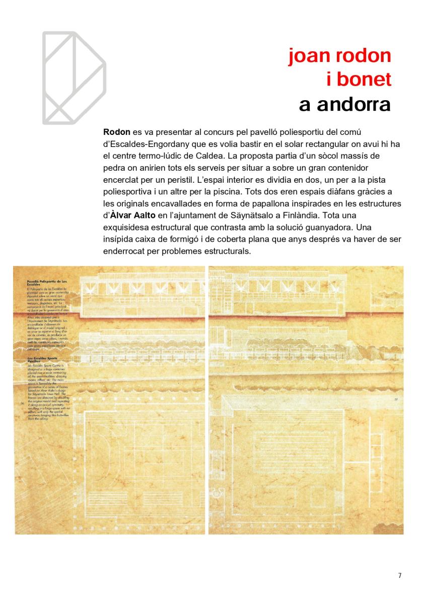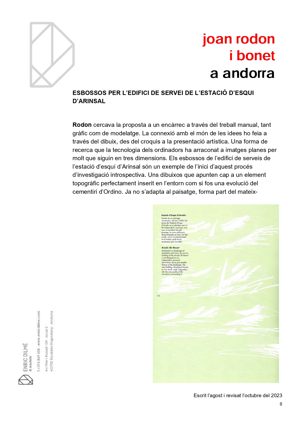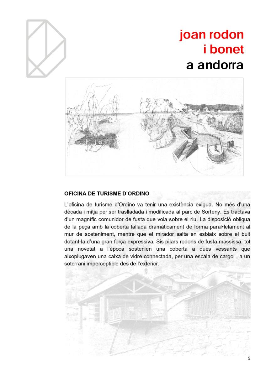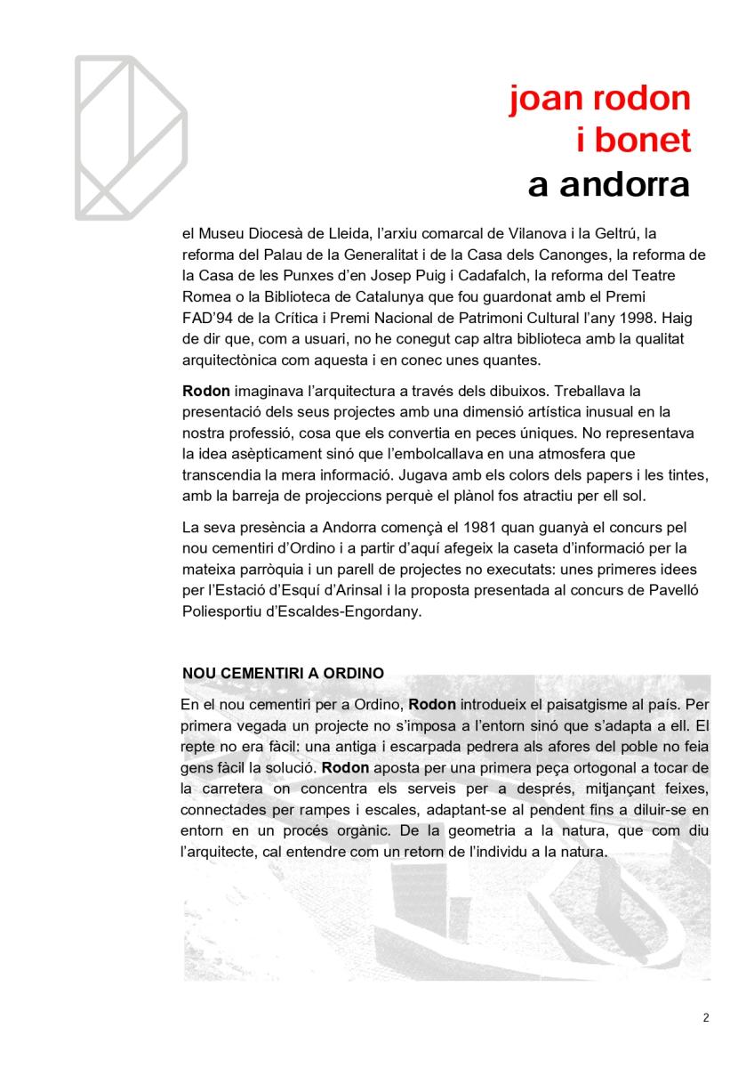 Des de sempre hi havia dues obres d’arquitectura contemporània que m’han seduït: la desterrada Oficina de Turisme d’Ordino i la primera fase del nou cementiri de la mateixa vila, obres de Joan Rodon i Bonet. Parlar de la seva trajectòria al país estava en la meva llista de desitjos quan, el 2017, em vaig decidir a fer aflorar l’autoria d’edificis, per a mi, remarcables, així com les obres d’arquitectes i artistes reconeguts.