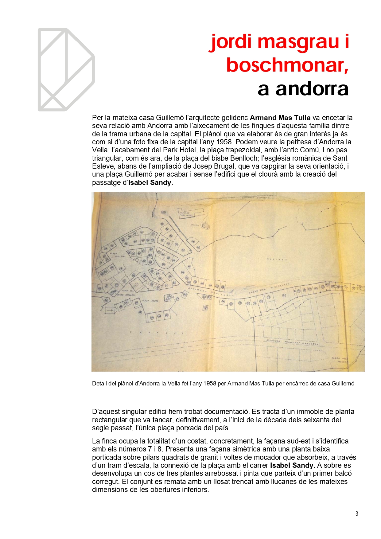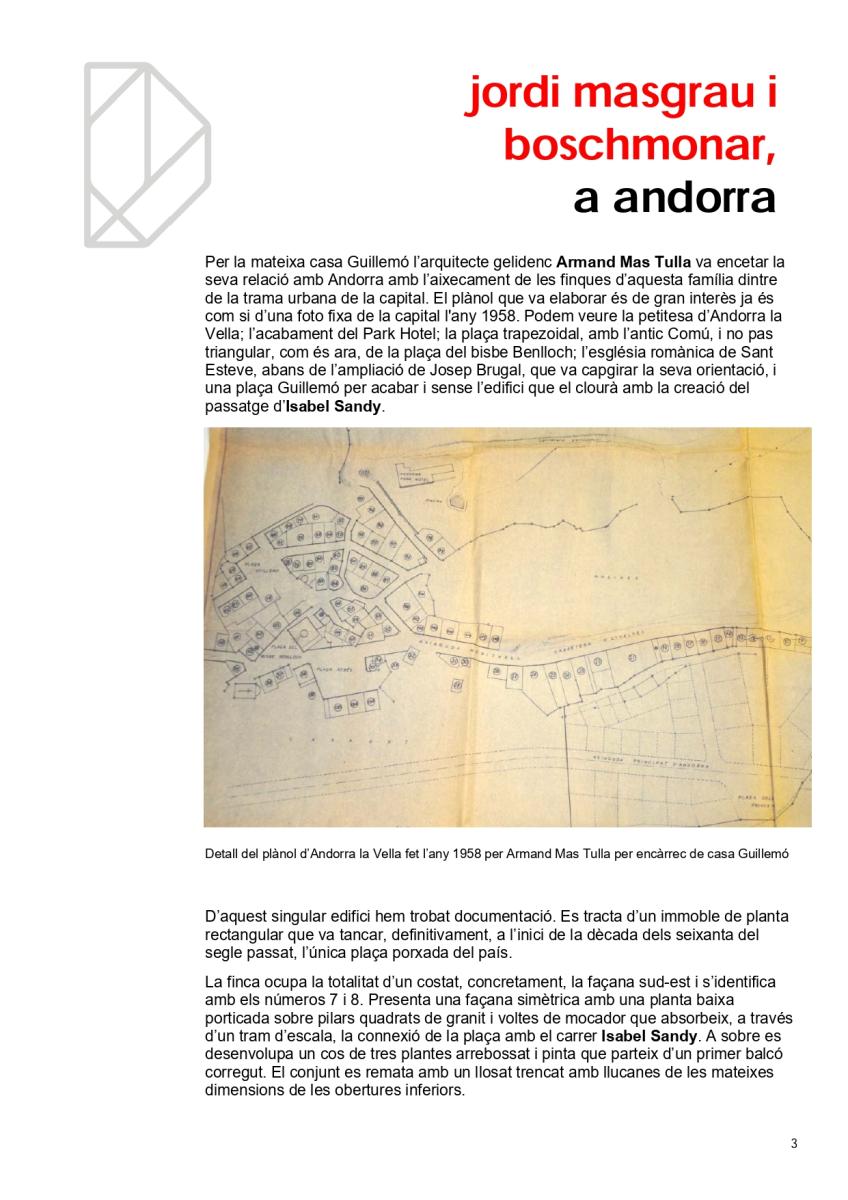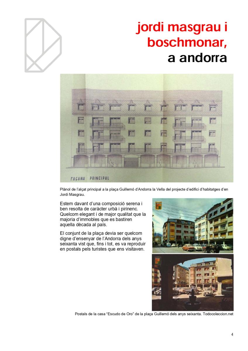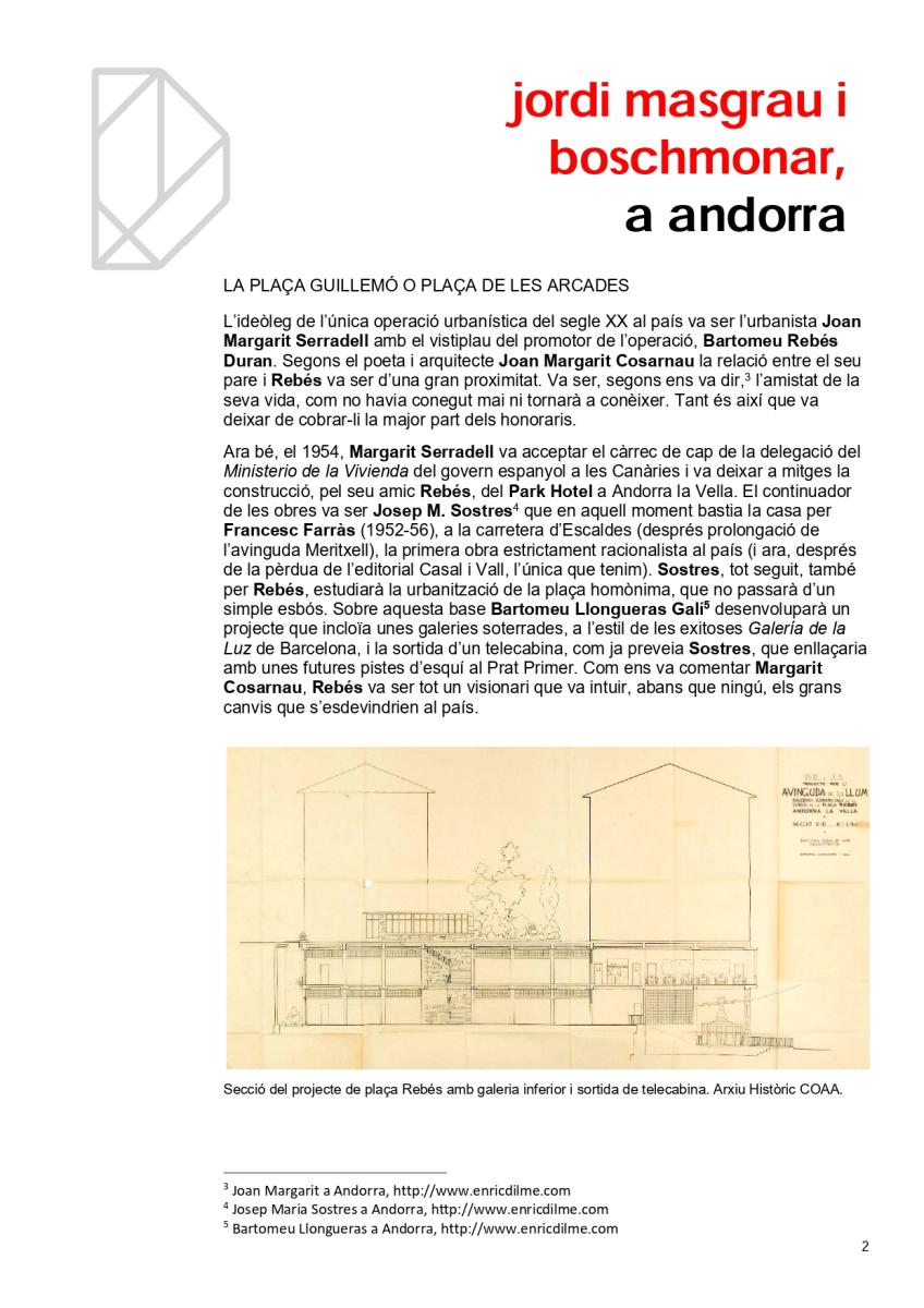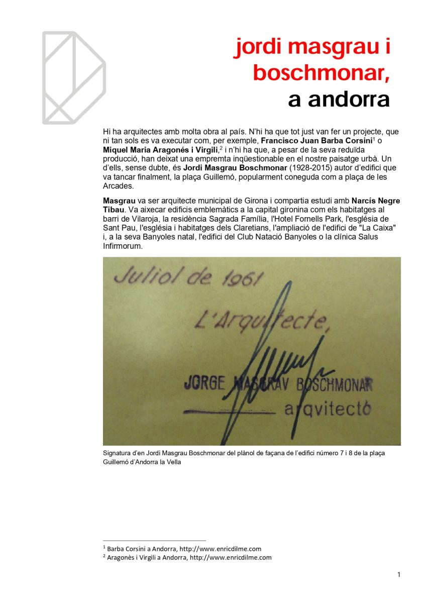 Hi ha arquitectes amb molta obra al país. N’hi ha que tot just van fer un projecte, que ni tan sols es va executar i n’hi ha que, a pesar de la seva reduïda producció, han deixat una empremta inqüestionable en el nostre paisatge urbà. Un d’ells, sense dubte, és Jordi Masgrau Boschmonar (1928-2015) autor d’edifici que va tancar finalment, la plaça Guillemó, popularment coneguda com a plaça de les Arcades.