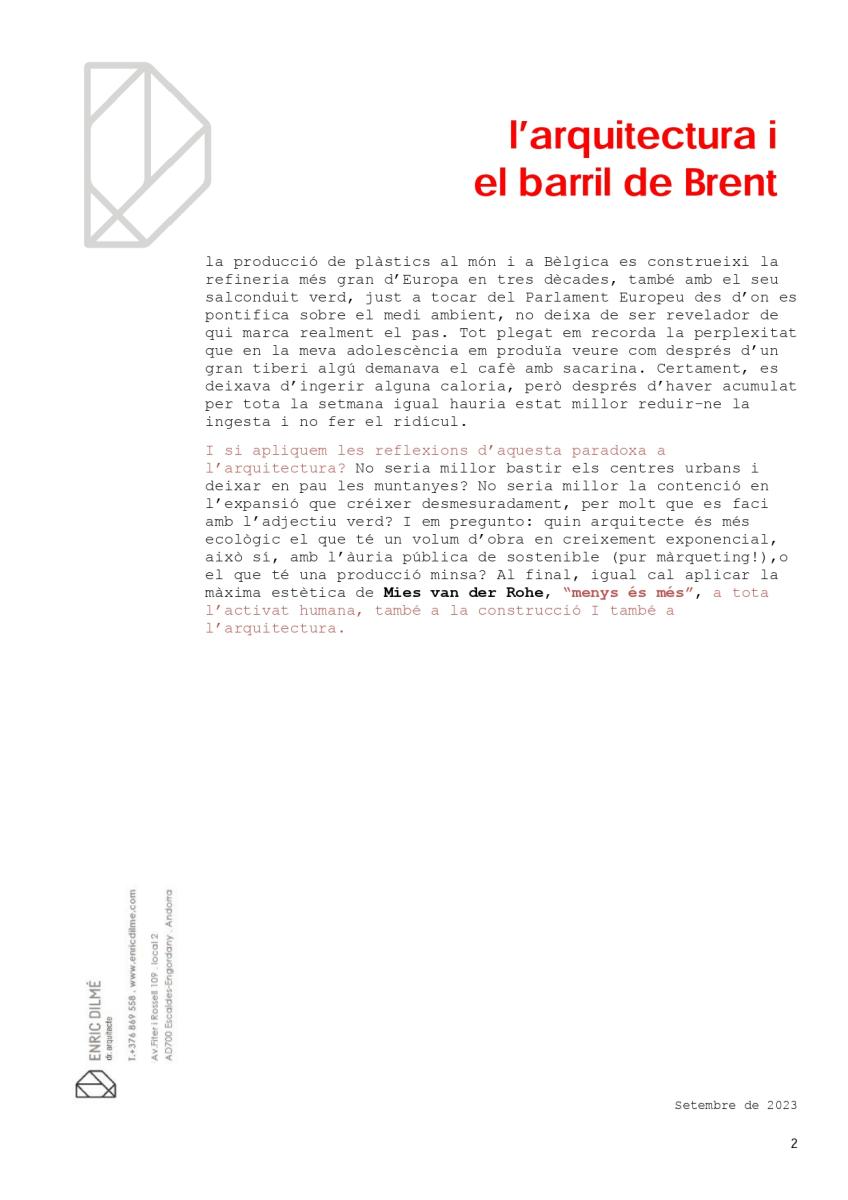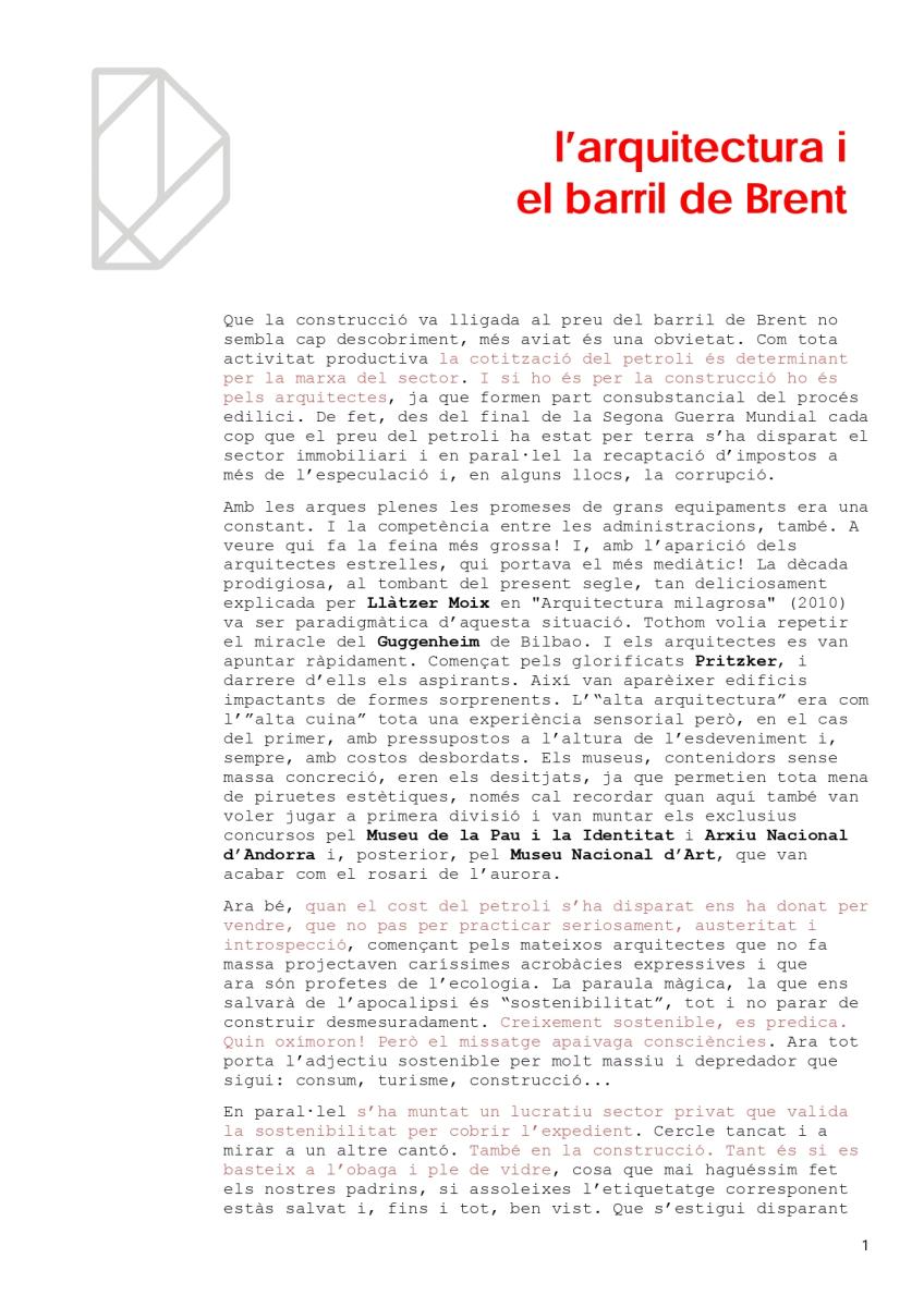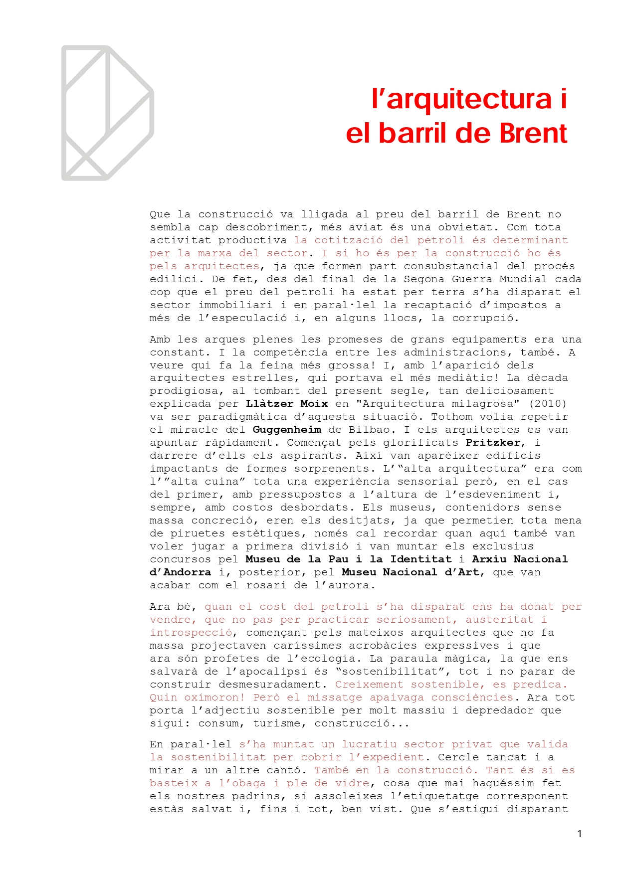La cotització del petroli és determinant per la marxa del sector. I si ho és per la construcicó ho és pels arquitectes. Quan el cost del petroli es dispara, ens dona per vendre, no pas per practicar seriosament, austeritat i introspecció. Hi ha una paraula que diuen que ens salvarà de l'apocalipsi, parlem de "sostenibilitat"... Creixement sostenible, es predica. Quin oxímoron! Però el missatge apaivaga conciències. Ara tot porta l'adjectiu sostenible per molt massiu i depredador que sigui: consum, turisme, construcció...No seria millor bastir els centres urbans i deixar en pau les muntanyes?. No seria millor la contenció en l'expansió que crèixer desmesuradament, per molt que es faci amb l'adjectiu verd?.