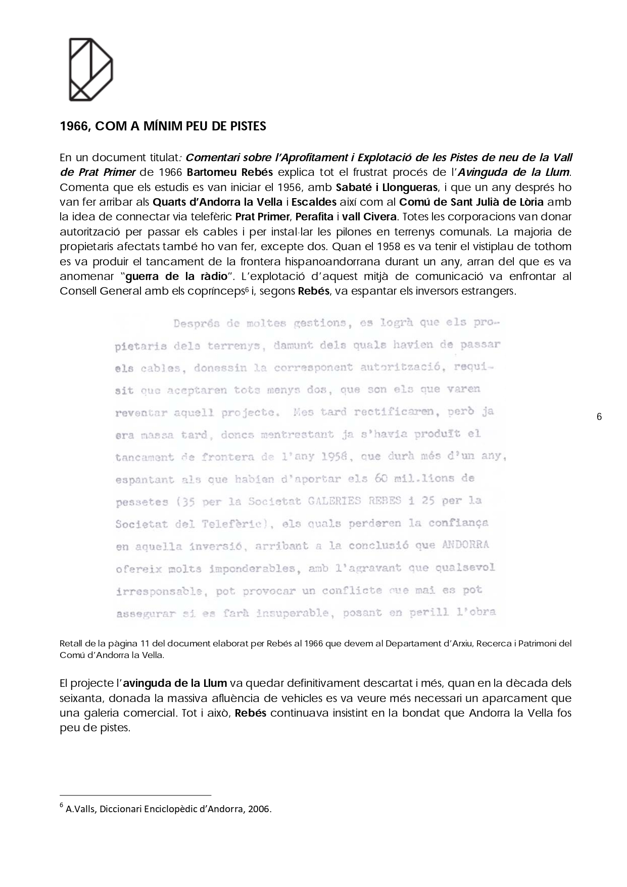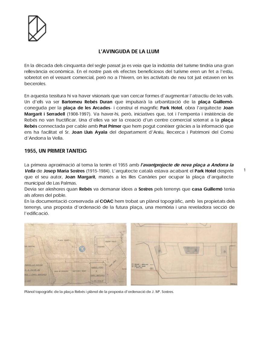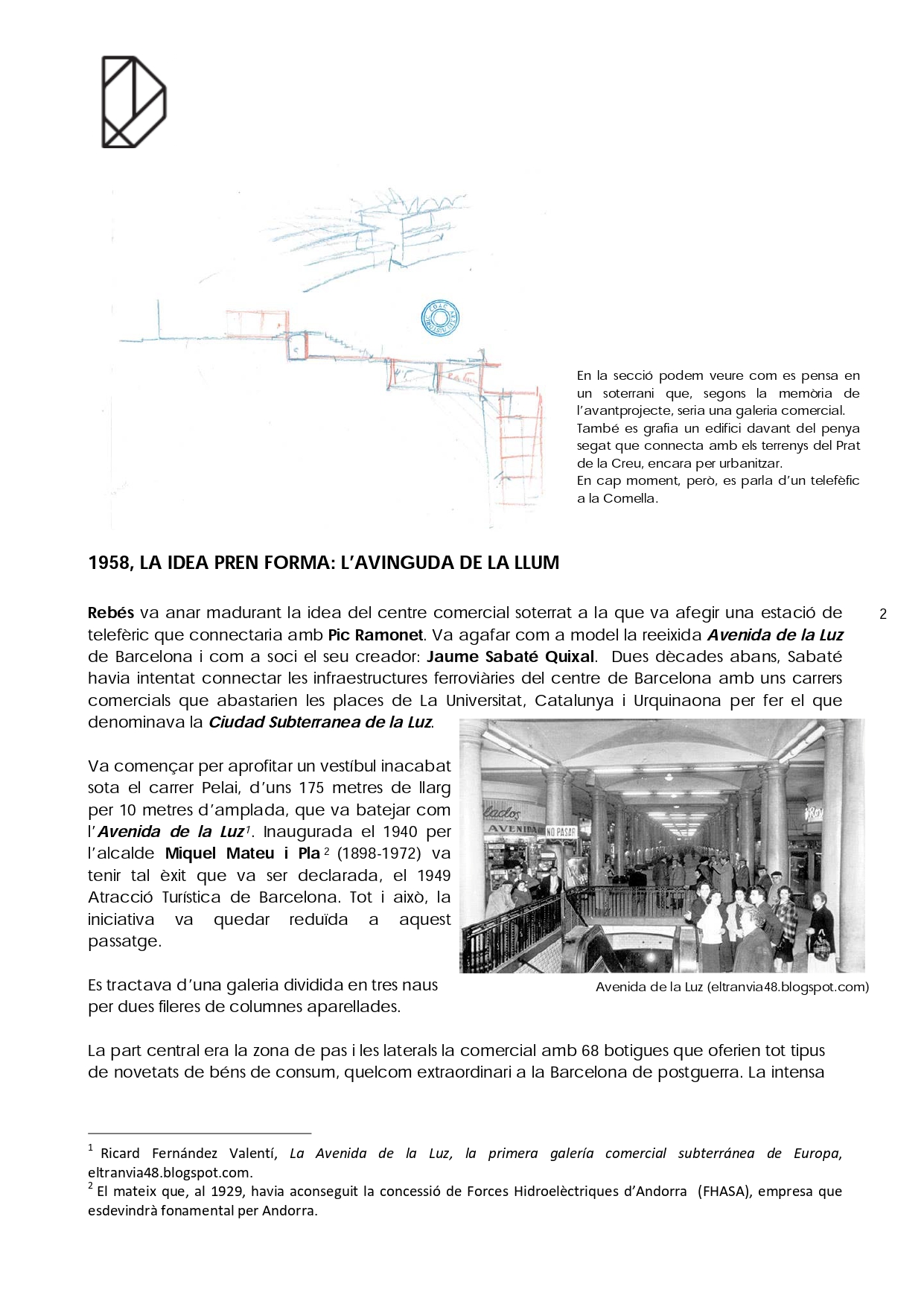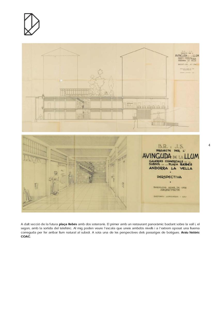 En aquesta tessitura hi va haver visionaris que van cercar formes d’augmentar l’atractiu de les valls. Un d’ells va ser Bartomeu Rebés Duran que impulsarà la urbanització de la plaça Guillemó-coneguda per la plaça de les Arcades- i construí el magnífic Park Hotel, obra l’arquitecte Joan Margarit i Serradell (1908-1997). Va haver-hi, però, iniciatives que, tot i l’empenta i insistència de Rebés no van fructificar. Una d’elles va ser la creació d’un centre comercial soterrat a la plaça Rebés connectada per cable amb Prat Primer que hem pogut conèixer gràcies a la informació que ens ha facilitat el Sr. Joan Lluís Ayala del departament d’Arxiu, Recerca i Patrimoni del Comú d’Andorra la Vella.