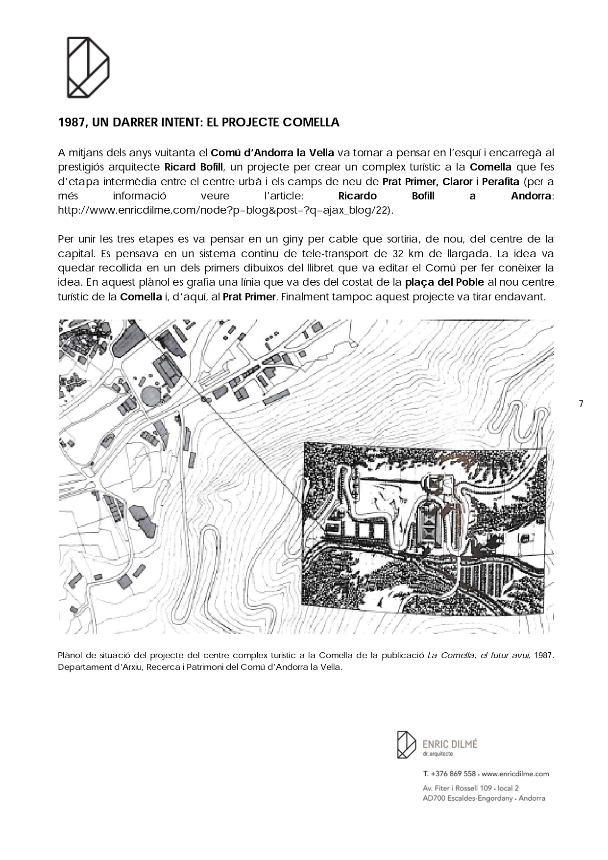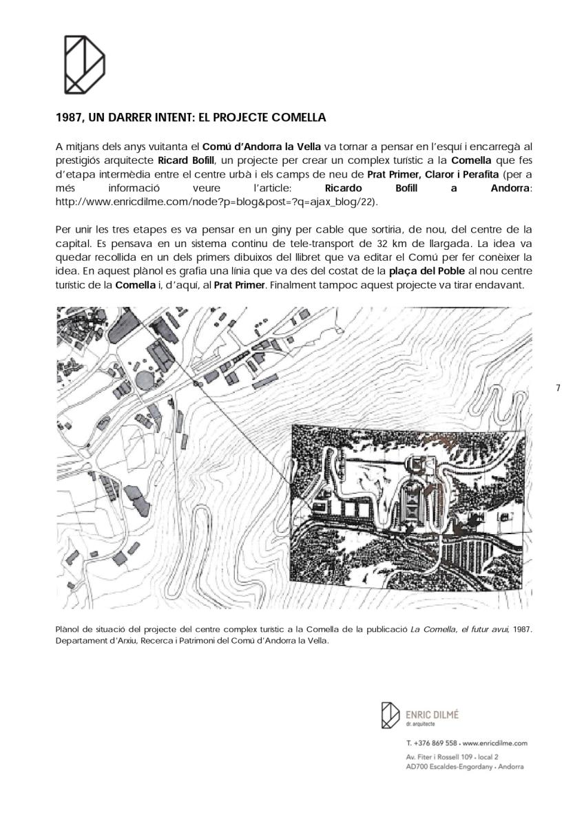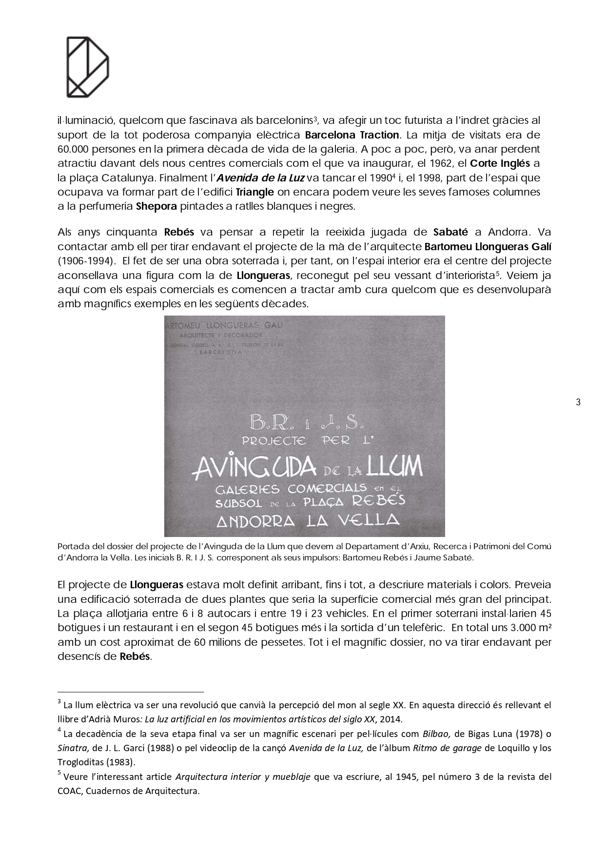 En aquesta tessitura hi va haver visionaris que van cercar formes d’augmentar l’atractiu de les valls. Un d’ells va ser Bartomeu Rebés Duran que impulsarà la urbanització de la plaça Guillemó-coneguda per la plaça de les Arcades- i construí el magnífic Park Hotel, obra l’arquitecte Joan Margarit i Serradell (1908-1997). Va haver-hi, però, iniciatives que, tot i l’empenta i insistència de Rebés no van fructificar. Una d’elles va ser la creació d’un centre comercial soterrat a la plaça Rebés connectada per cable amb Prat Primer que hem pogut conèixer gràcies a la informació que ens ha facilitat el Sr. Joan Lluís Ayala del departament d’Arxiu, Recerca i Patrimoni del Comú d’Andorra la Vella.