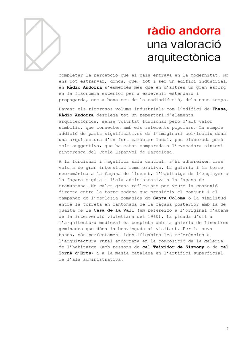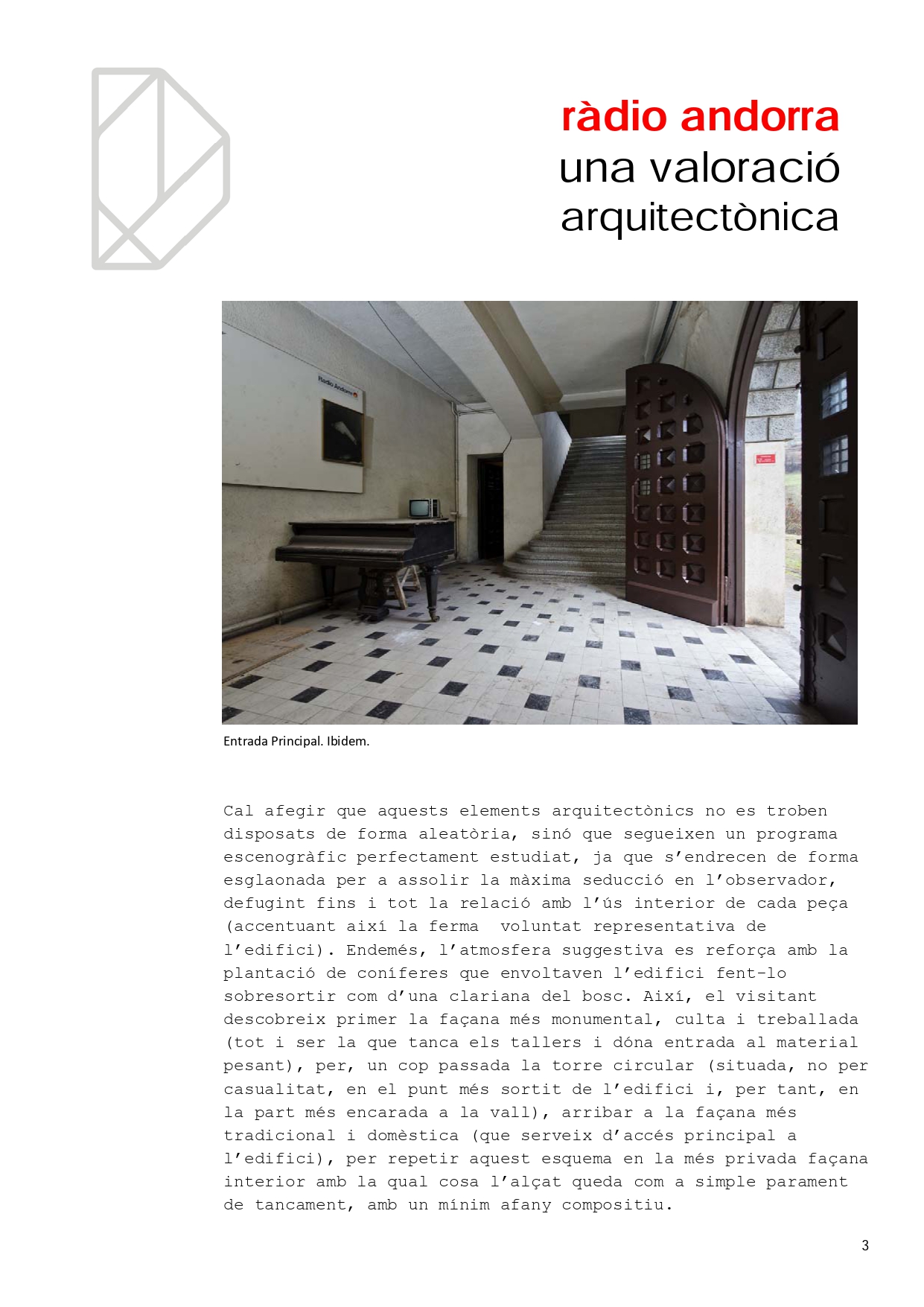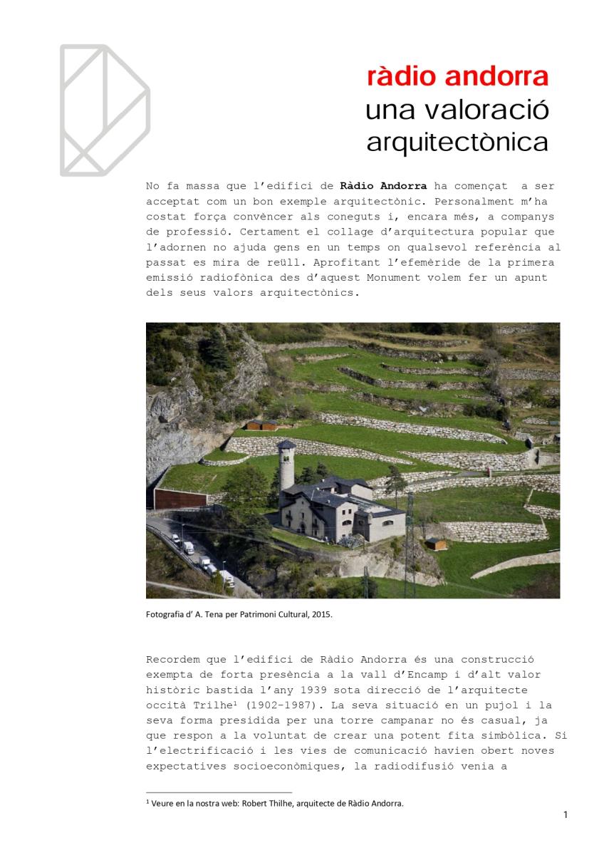 No fa massa que l’edifici de Ràdio Andorra ha començat a ser acceptat com un bon exemple arquitectònic. Personalment m’ha costat força convèncer als coneguts i, encara més, a companys de professió. Certament el collage d’arquitectura popular que l’adornen no ajuda gens en un temps on qualsevol referència al passat es mira de reüll. Aprofitant l’efemèride de la primera emissió radiofònica des d’aquest Monument volem fer un apunt dels seus valors arquitectònics.