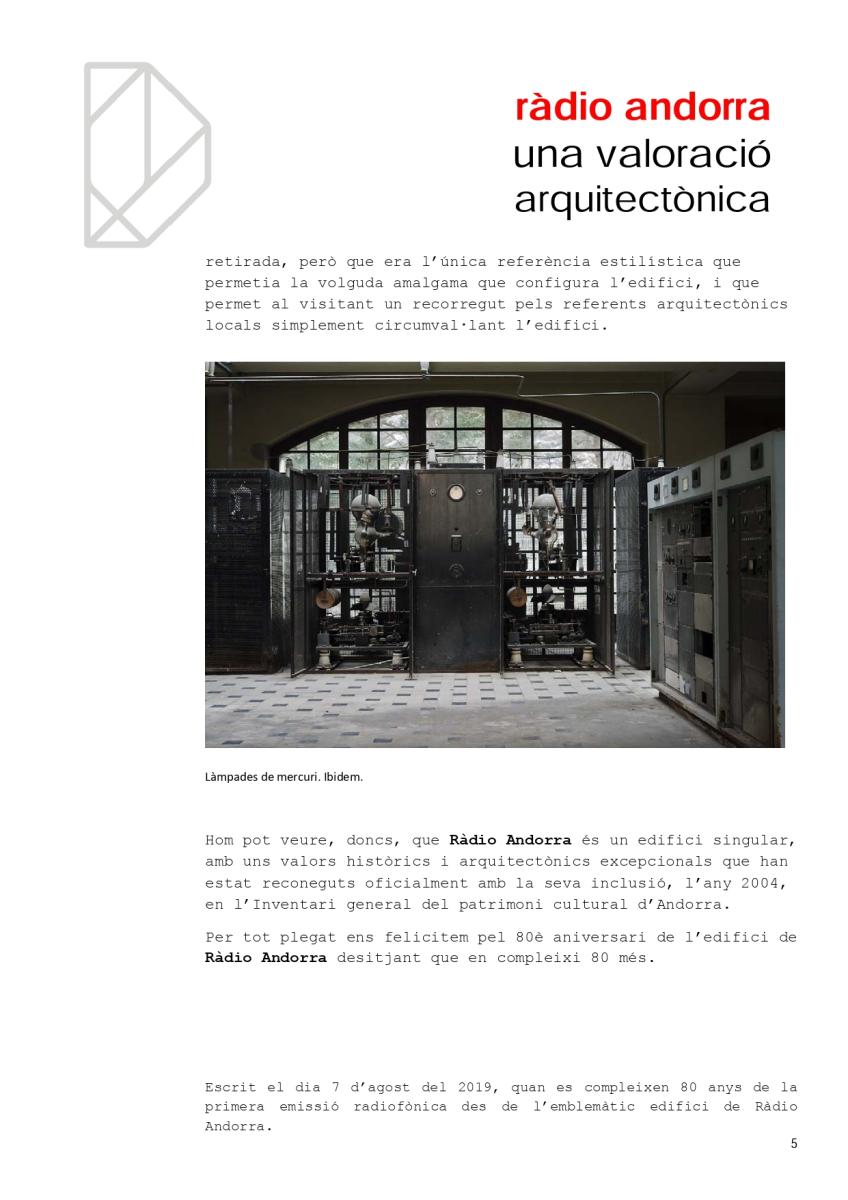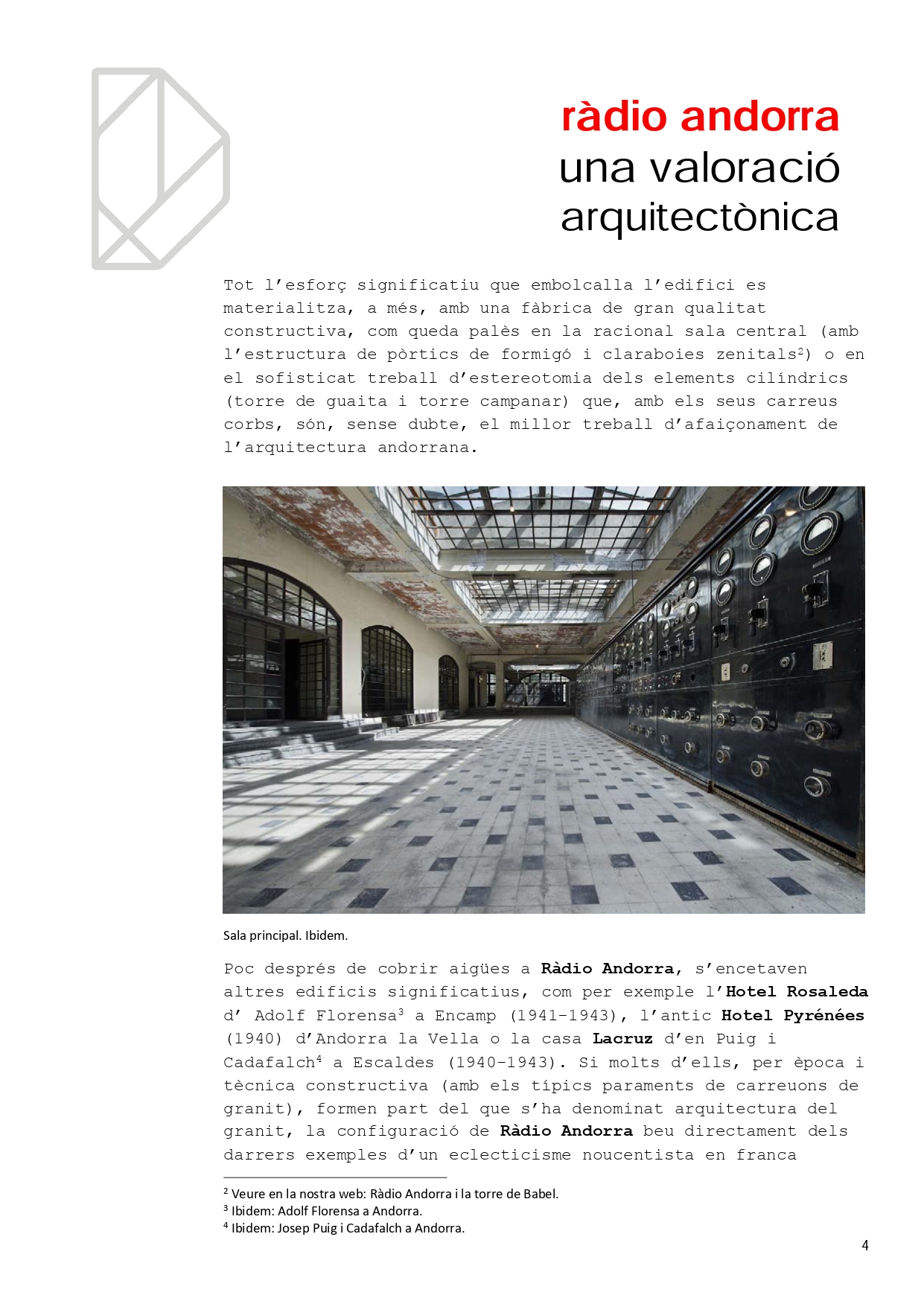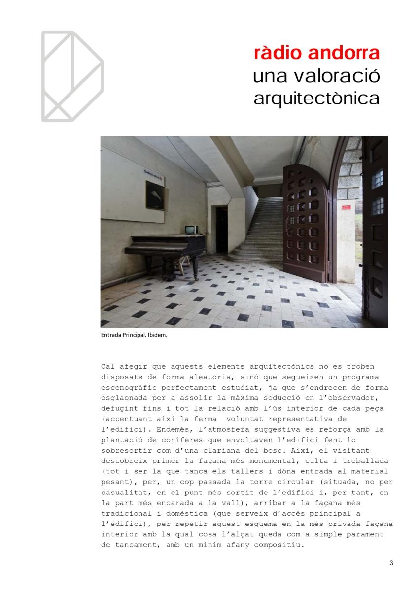 No fa massa que l’edifici de Ràdio Andorra ha començat a ser acceptat com un bon exemple arquitectònic. Personalment m’ha costat força convèncer als coneguts i, encara més, a companys de professió. Certament el collage d’arquitectura popular que l’adornen no ajuda gens en un temps on qualsevol referència al passat es mira de reüll. Aprofitant l’efemèride de la primera emissió radiofònica des d’aquest Monument volem fer un apunt dels seus valors arquitectònics.