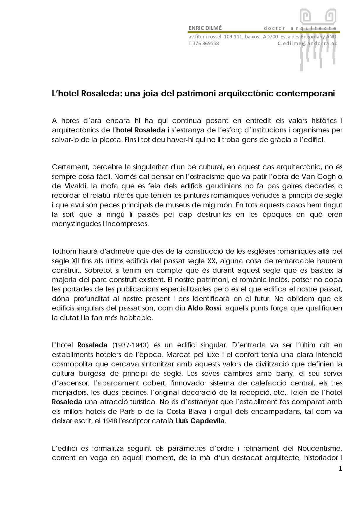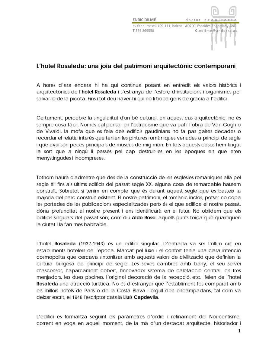 A hores d’ara encara hi ha qui continua posant en entredit els valors històrics i arquitectònics de l’hotel Rosaleda i s’estranya de l’esforç d’institucions i organismes per salvar-lo de la picota. Fins i tot deu haver-hi qui no li troba gens de gràcia a l’edifici.