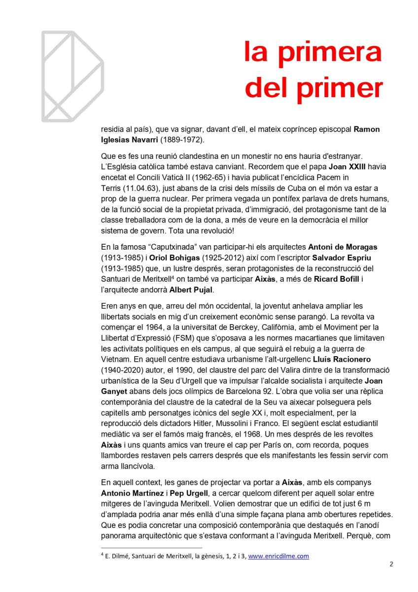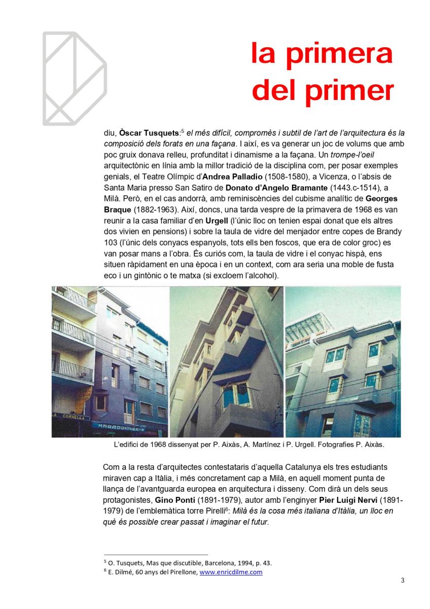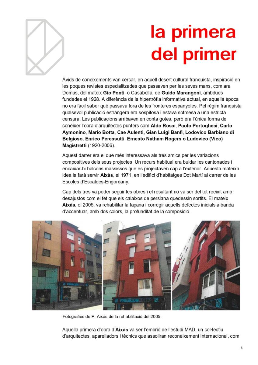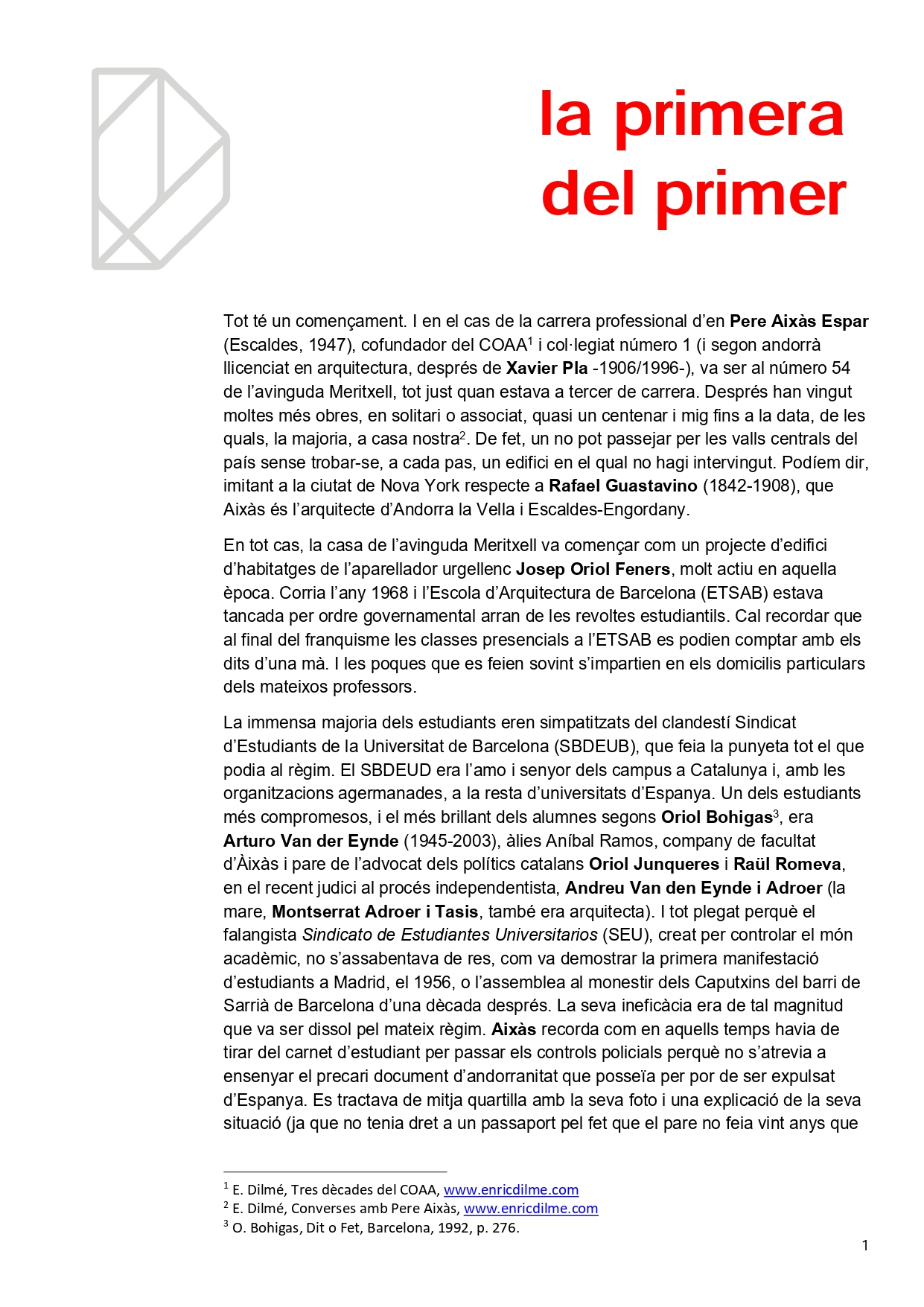 Tot té un començament. I en el cas de la carrera professional d’en Pere Aixàs Espar (Escaldes, 1947), cofundador del COAA i col·legiat número 1 (i segon andorrà llicenciat en arquitectura, després de Xavier Pla -1906/1996-), va ser al número 54 de l’avinguda Meritxell.