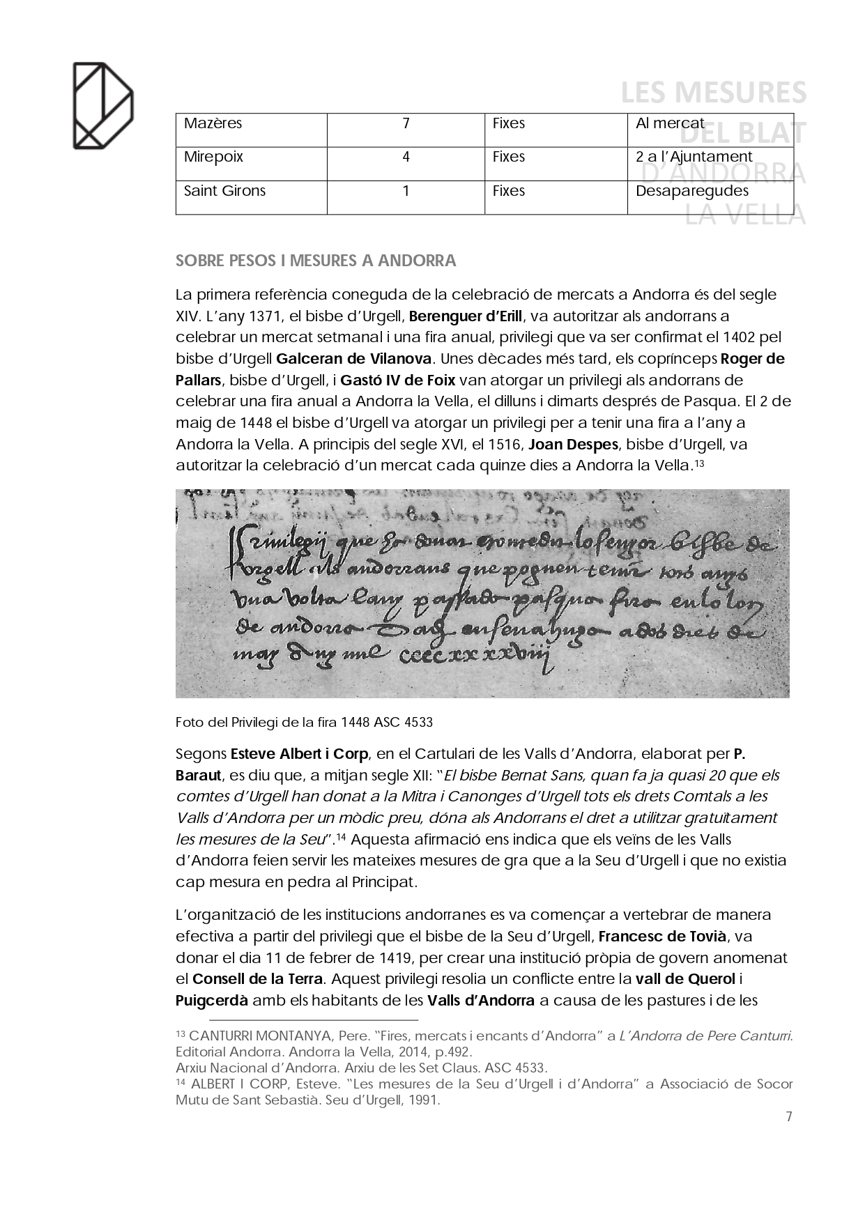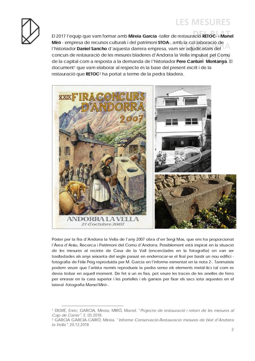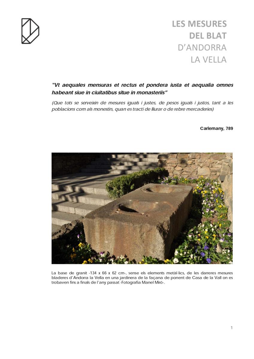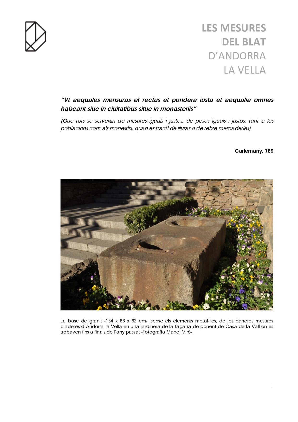 Enguany es compleix el 600 aniversari de la creació del Consell de la Terra a partir del privilegi que el bisbe de la Seu d’Urgell, Francesc de Tovià, va donar l’11 de febrer de 1419 i que vertebrava l’organització de les institucions andorranes. Una de les seves funcions era posar en llei els pesos i les mesures a través de patrons fets amb materials estables com ara un bloc de pedra. Un dels darrers exemples d’aquest singular element de mesura es conservava parcialment als entorns de Casa de la Vall.