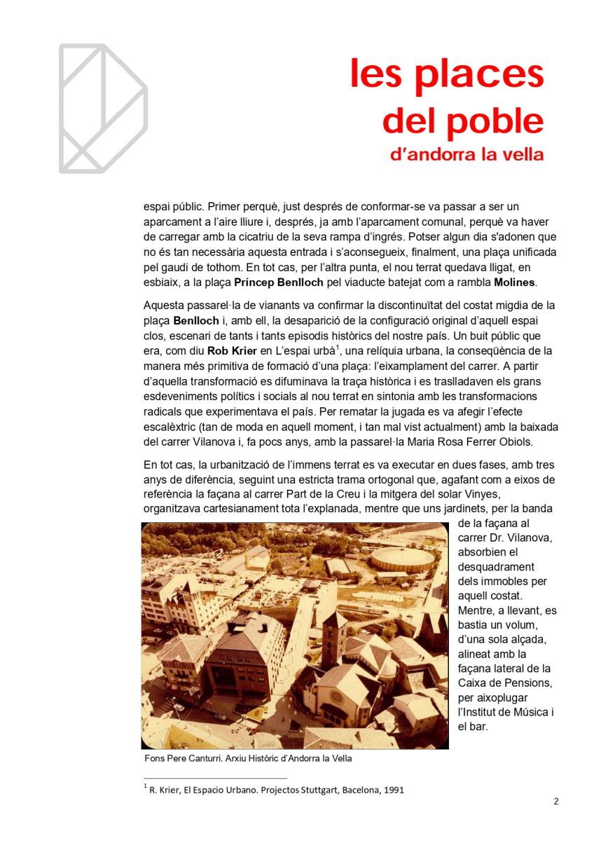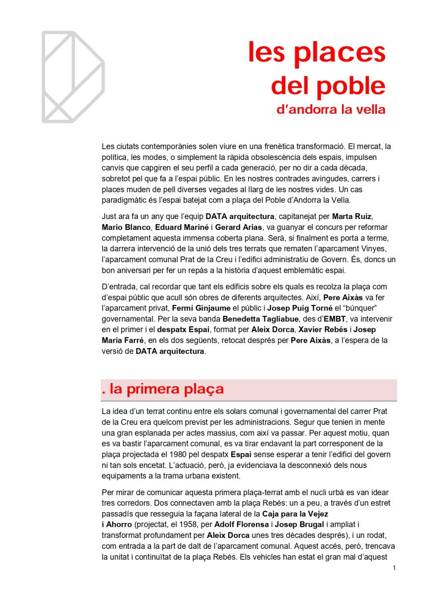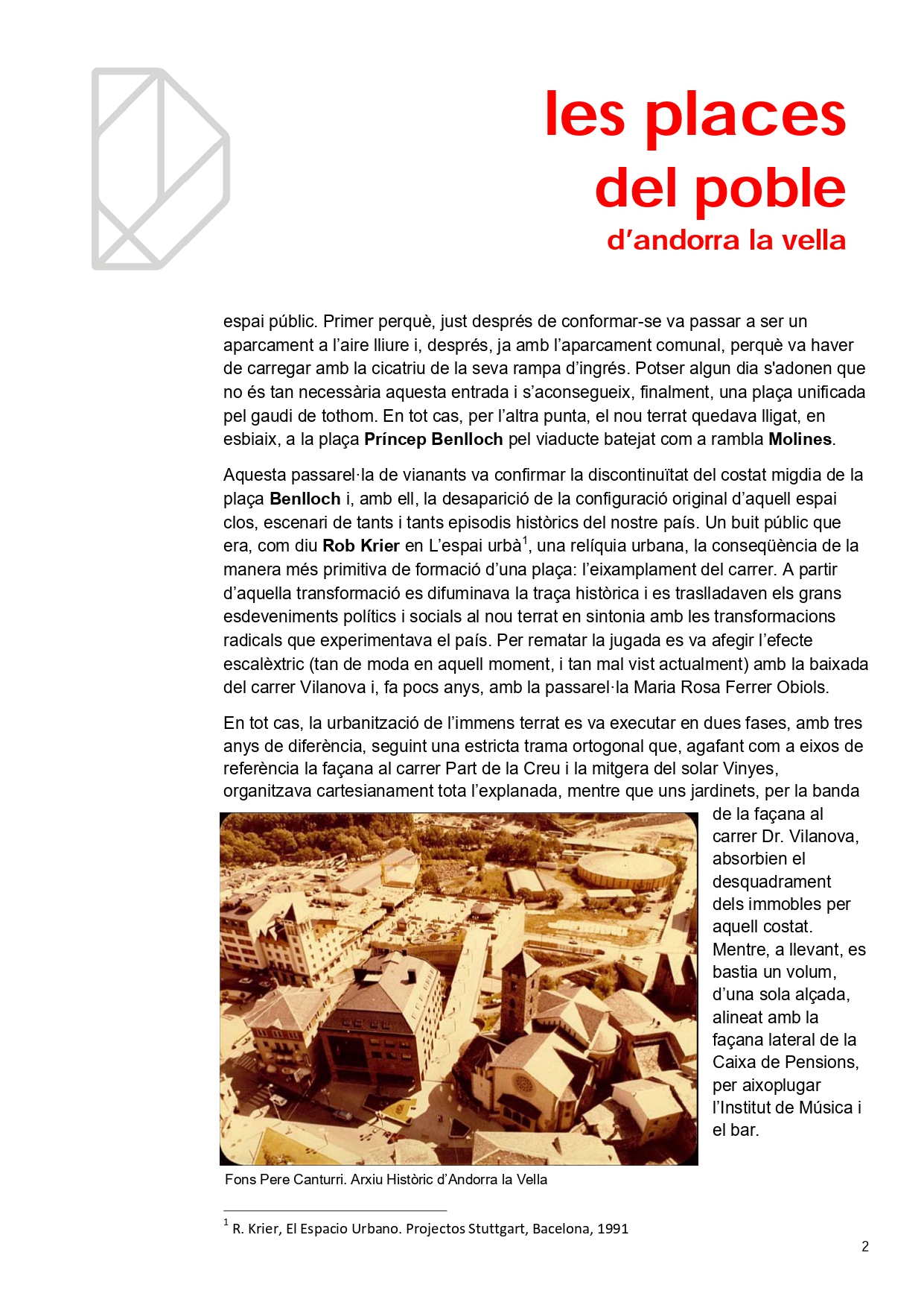 Les ciutats contemporànies solen viure en una frenètica transformació. El mercat, la política, les modes, o simplement la ràpida obsolescència dels espais, impulsen canvis que capgiren el seu perfil a cada generació, per no dir a cada dècada, sobretot pel que fa a l’espai públic. En les nostres contrades avingudes, carrers i places muden de pell diverses vegades al llarg de les nostres vides. Un cas paradigmàtic és l’espai batejat com a plaça del Poble d’Andorra la Vella.