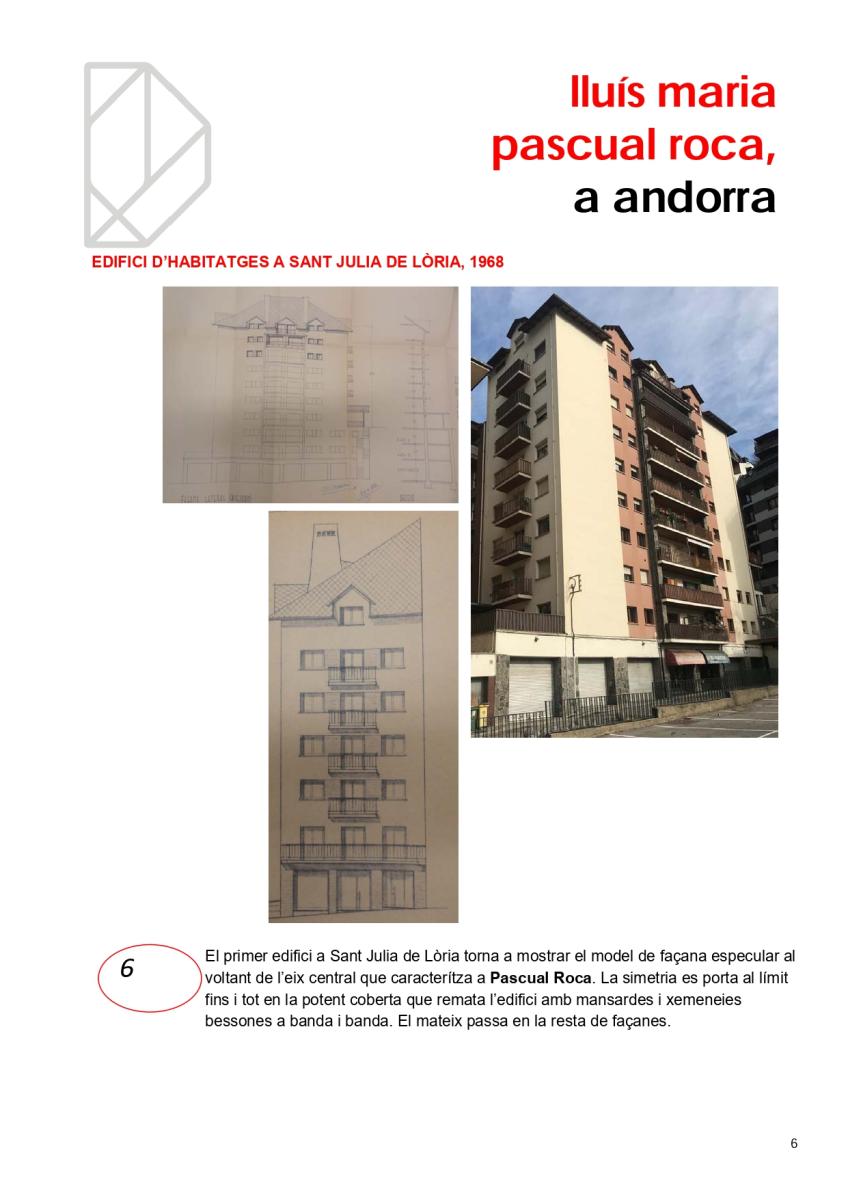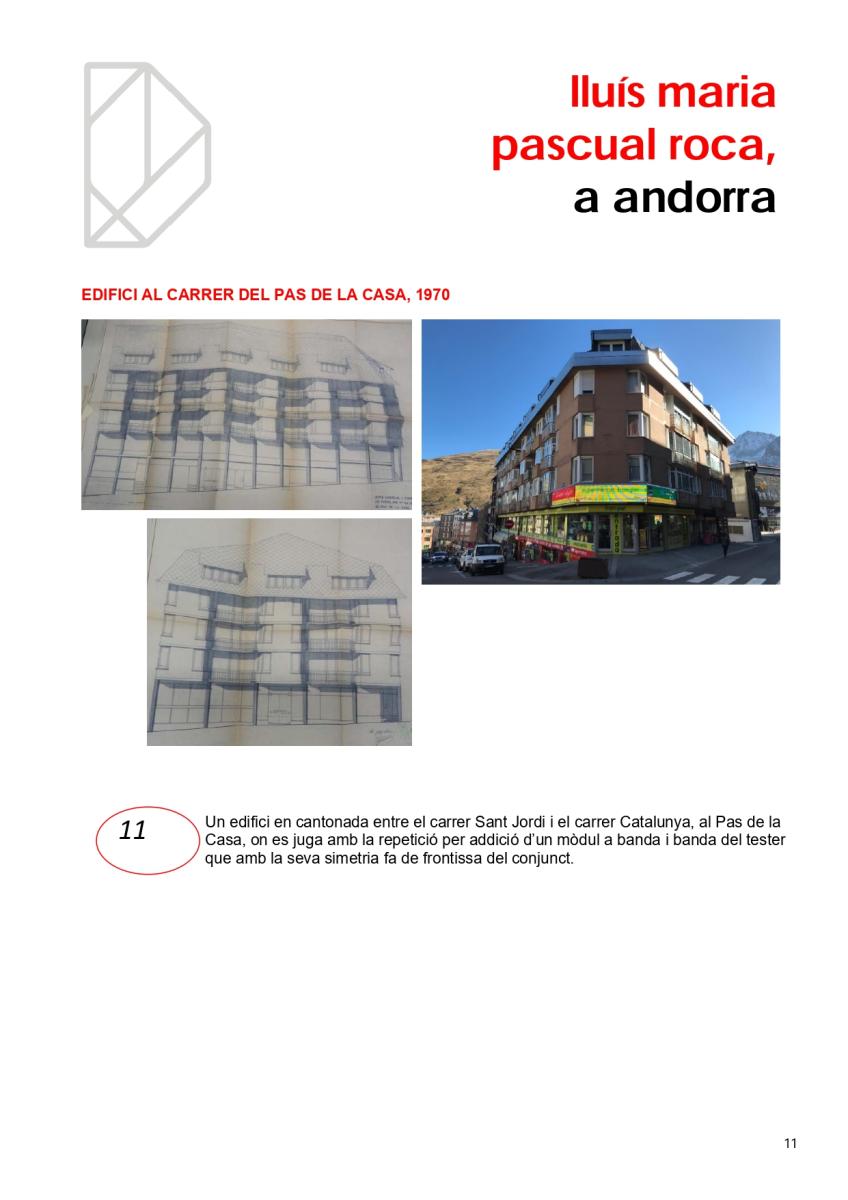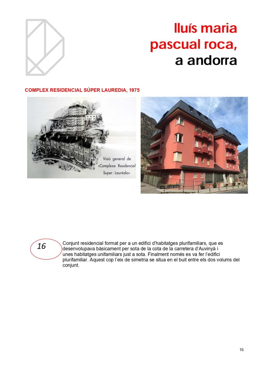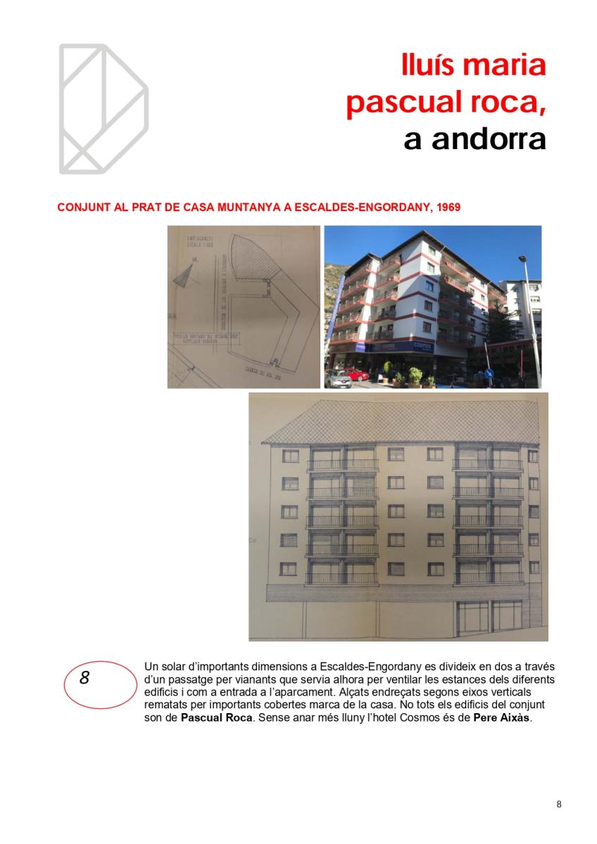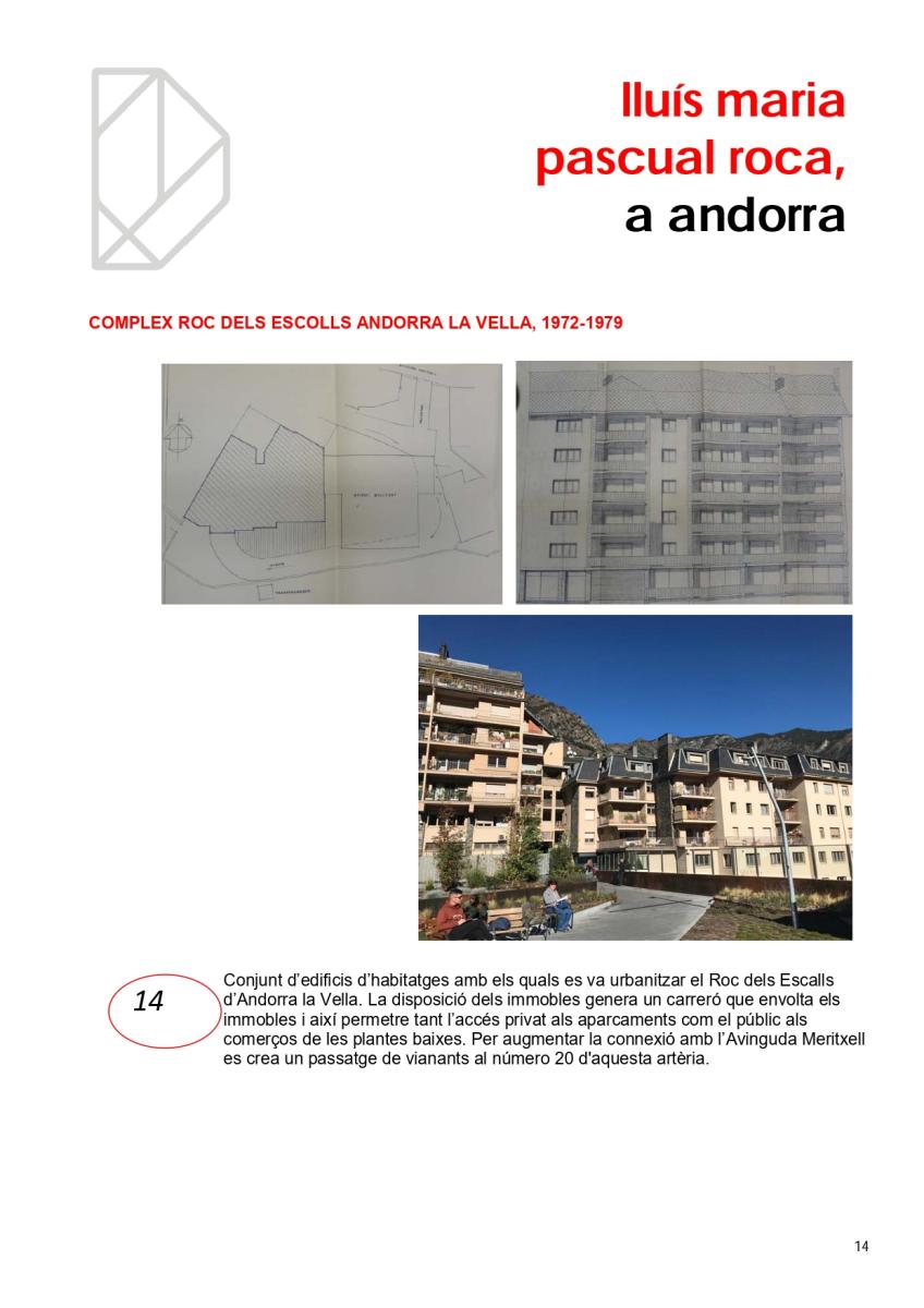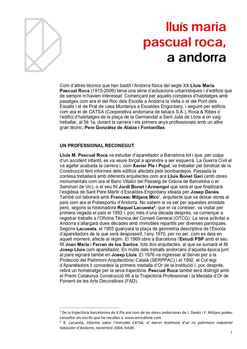 Com d’altres tècnics que han bastit l’Andorra física del segle XX Lluís Maria Pascual Roca (1915-2009) tenia una sèrie d’actuacions urbanístiques i d’edificis que de sempre m’havien interessat. Començant per aquells complexs d’habitatges amb passatges com ara el del Roc dels Escolls a Andorra la Vella o el del Pont dels Escalls i el de Prat de casa Muntanya a Escaldes Engordany, i seguint per edificis com ara el de CATSA (Cooperativa andorrana de tabacs S.A.), Roca & Ribes o l’edifici d’habitatges de la plaça de la Germandat a Sant Julià de Lòria a on vaig treballar, al 5è 1a, durant la carrera i els primers anys professionals amb un altre gran tècnic, Pere Gonzàlez de Alaiza i Fontanillas.