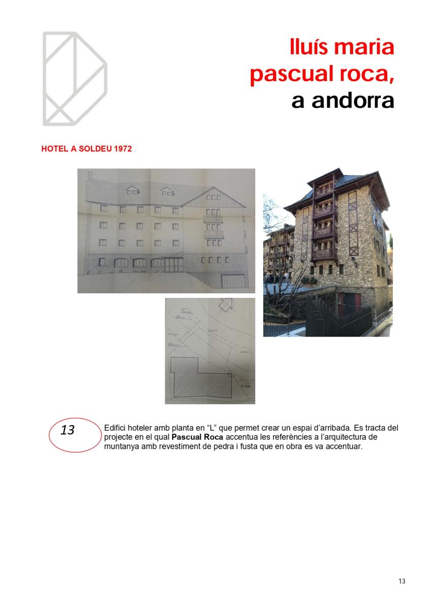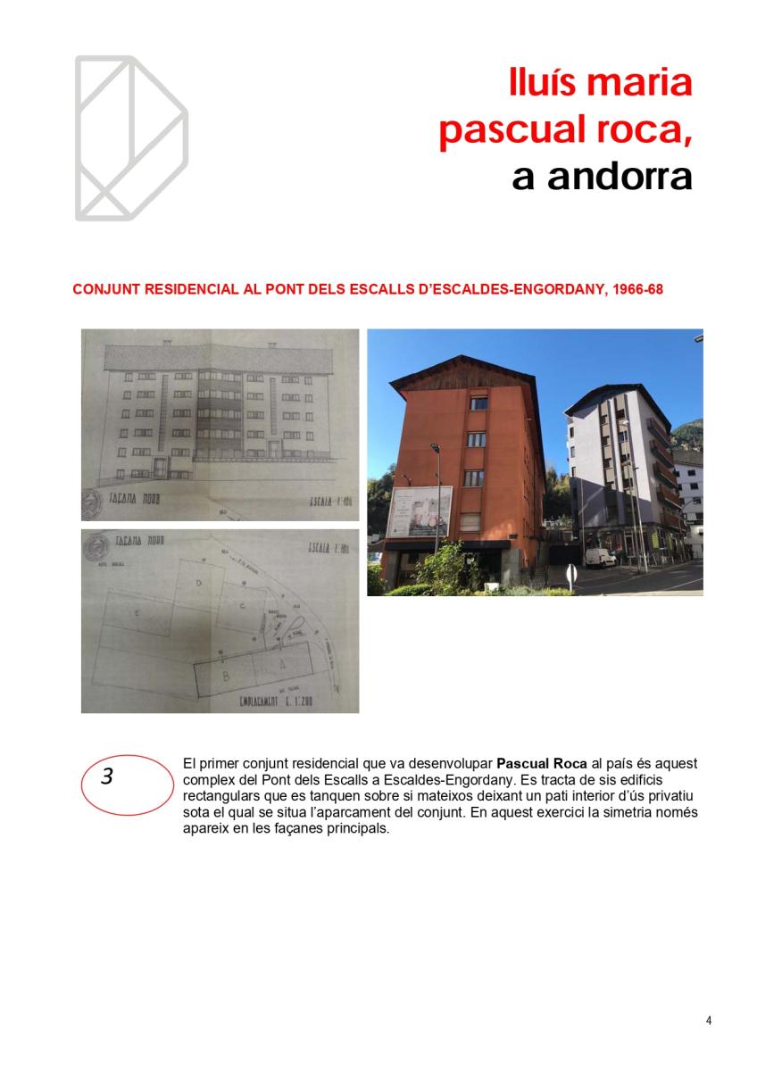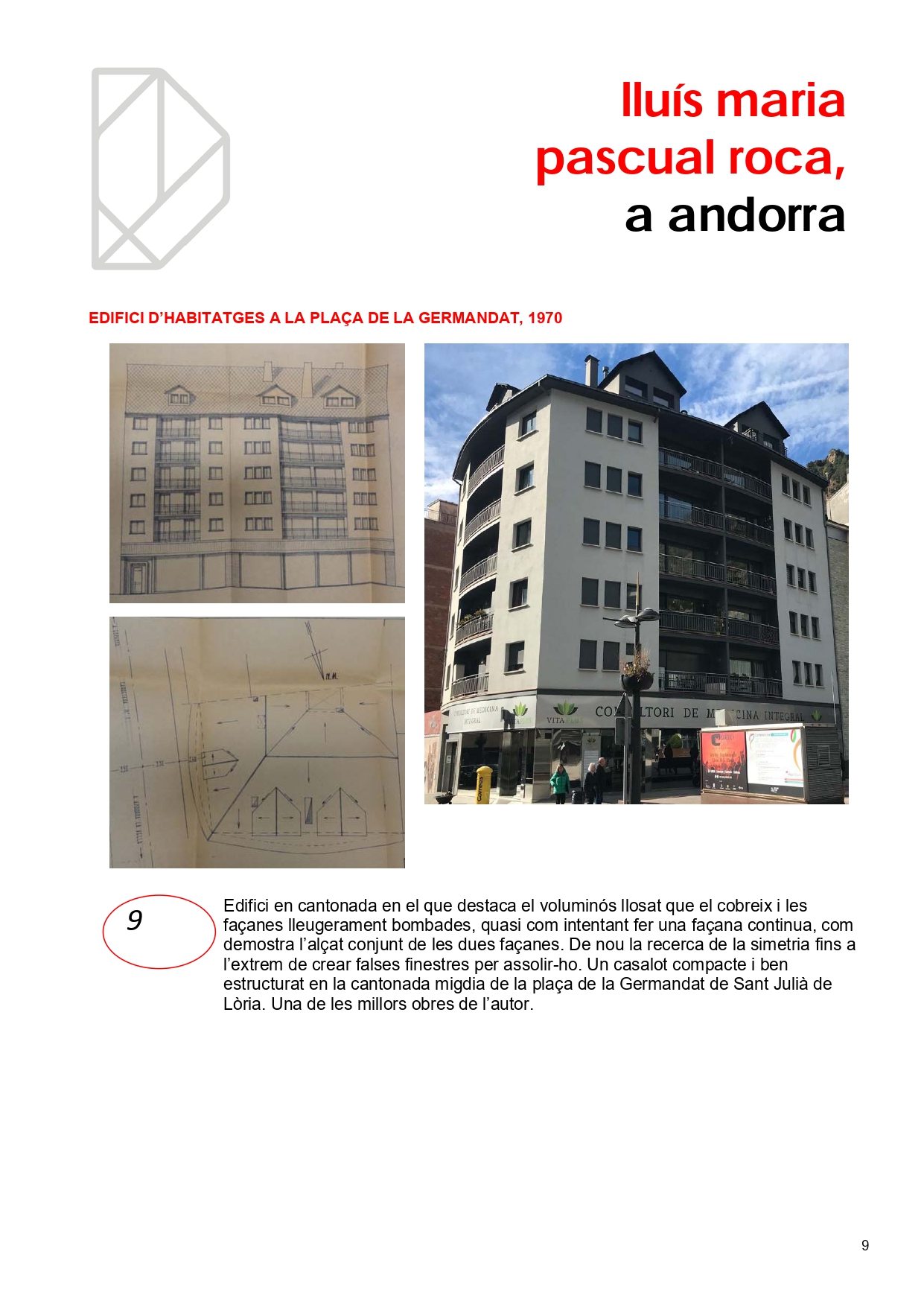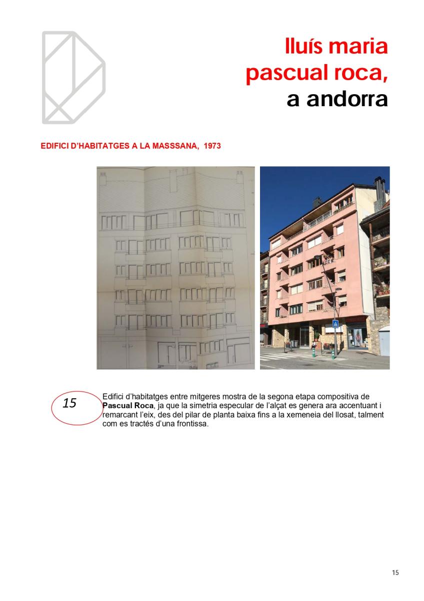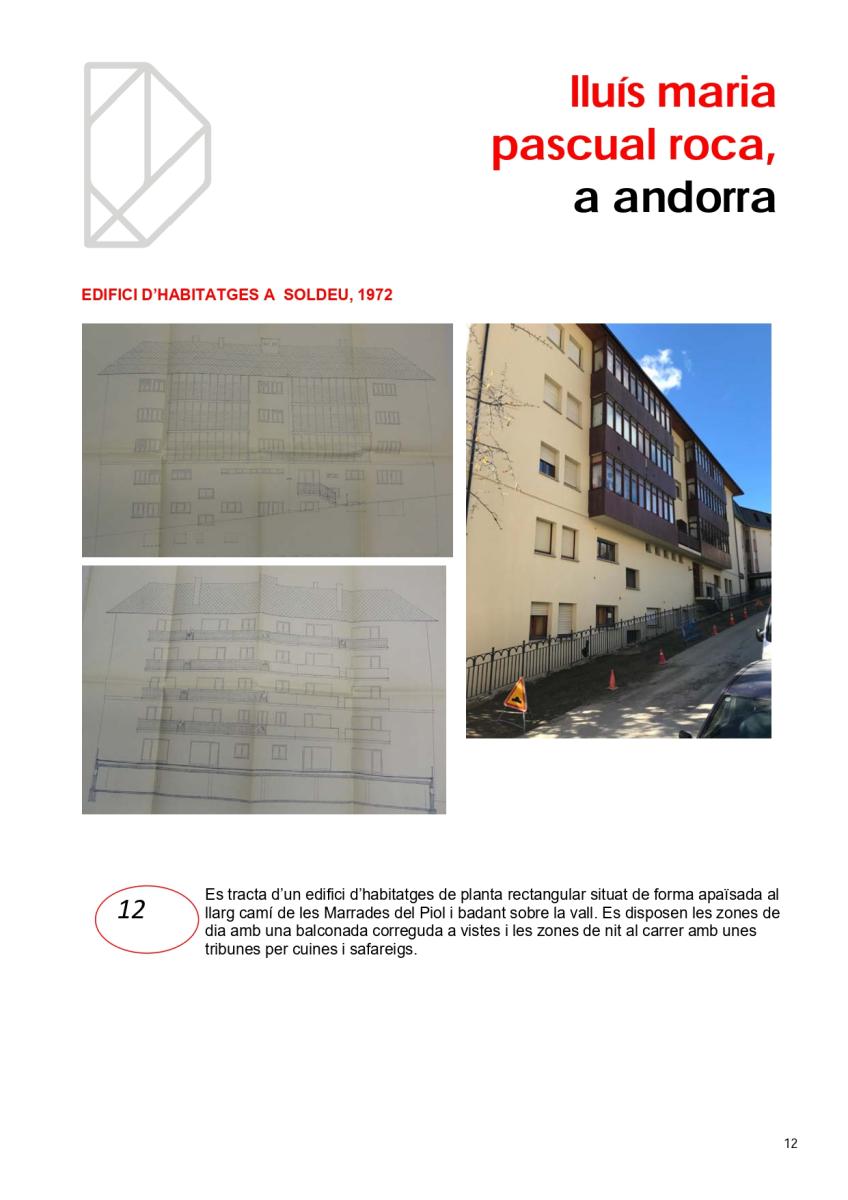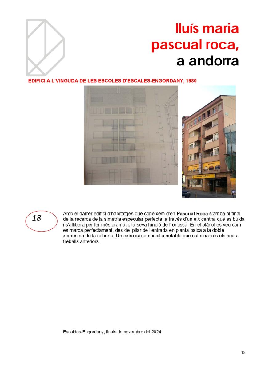 Com d’altres tècnics que han bastit l’Andorra física del segle XX Lluís Maria Pascual Roca (1915-2009) tenia una sèrie d’actuacions urbanístiques i d’edificis que de sempre m’havien interessat. Començant per aquells complexs d’habitatges amb passatges com ara el del Roc dels Escolls a Andorra la Vella o el del Pont dels Escalls i el de Prat de casa Muntanya a Escaldes Engordany, i seguint per edificis com ara el de CATSA (Cooperativa andorrana de tabacs S.A.), Roca & Ribes o l’edifici d’habitatges de la plaça de la Germandat a Sant Julià de Lòria a on vaig treballar, al 5è 1a, durant la carrera i els primers anys professionals amb un altre gran tècnic, Pere Gonzàlez de Alaiza i Fontanillas.