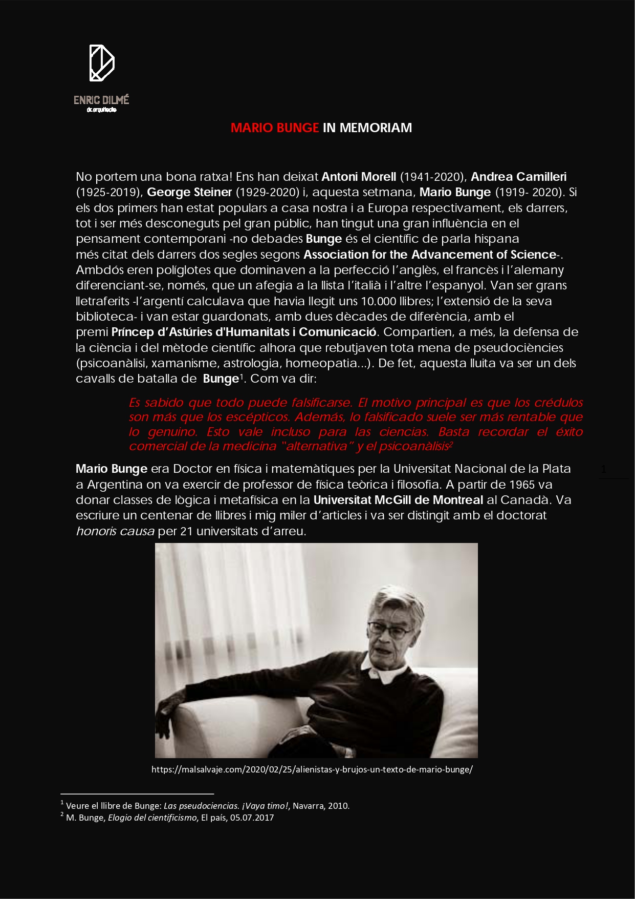 No portem una bona ratxa! Ens han deixat Antoni Morell (1941-2020), Andrea Camilleri (1925-2019), George Steiner (1929-2020) i, aquesta setmana, Mario Bunge (1919- 2020).