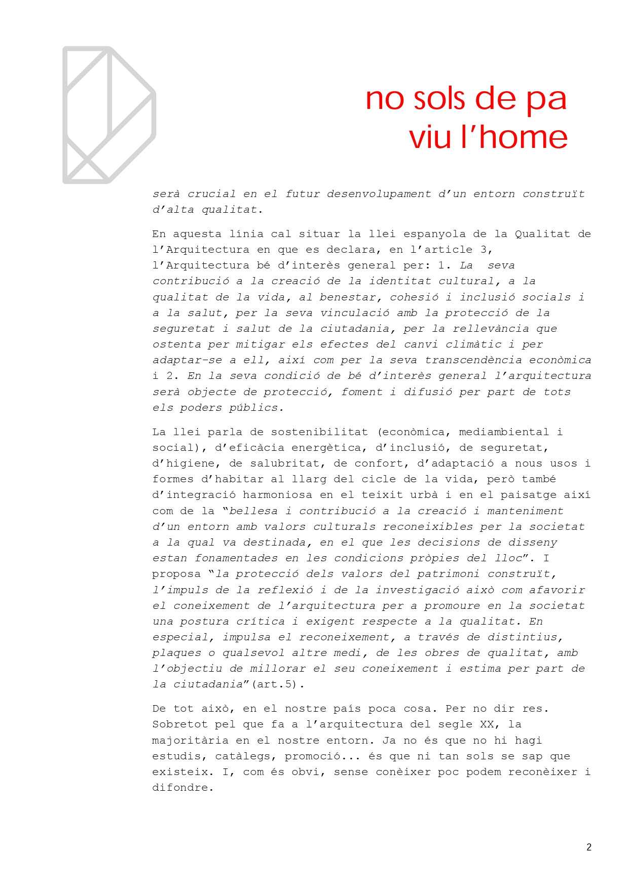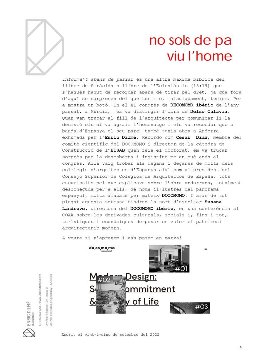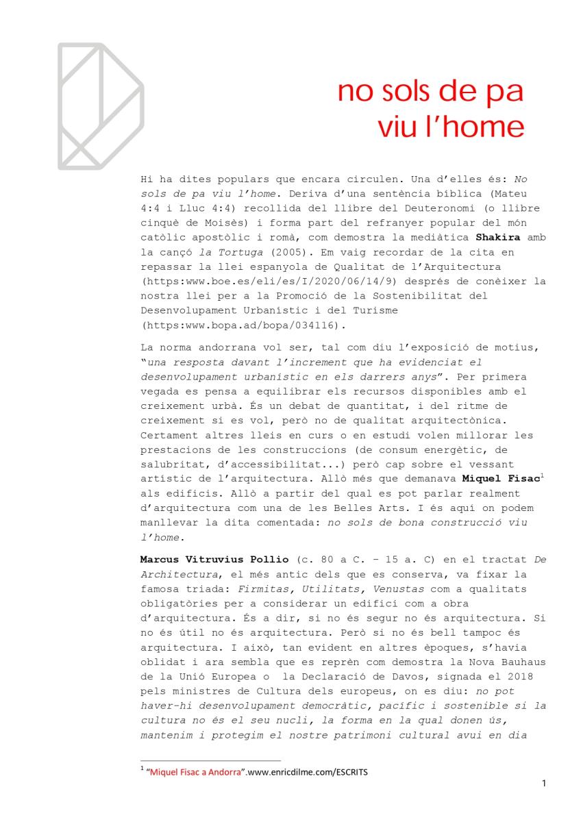 Aquesta dita popular em va venir al cap en repassar la llei espanyola de Qualitat de l’Arquitectura i després de conèixer la nostra llei per a la Promoció de la Sostenibilitat del Desenvolupament Urbanístic i del Turisme (https:www.bopa.ad/bopa/034116)