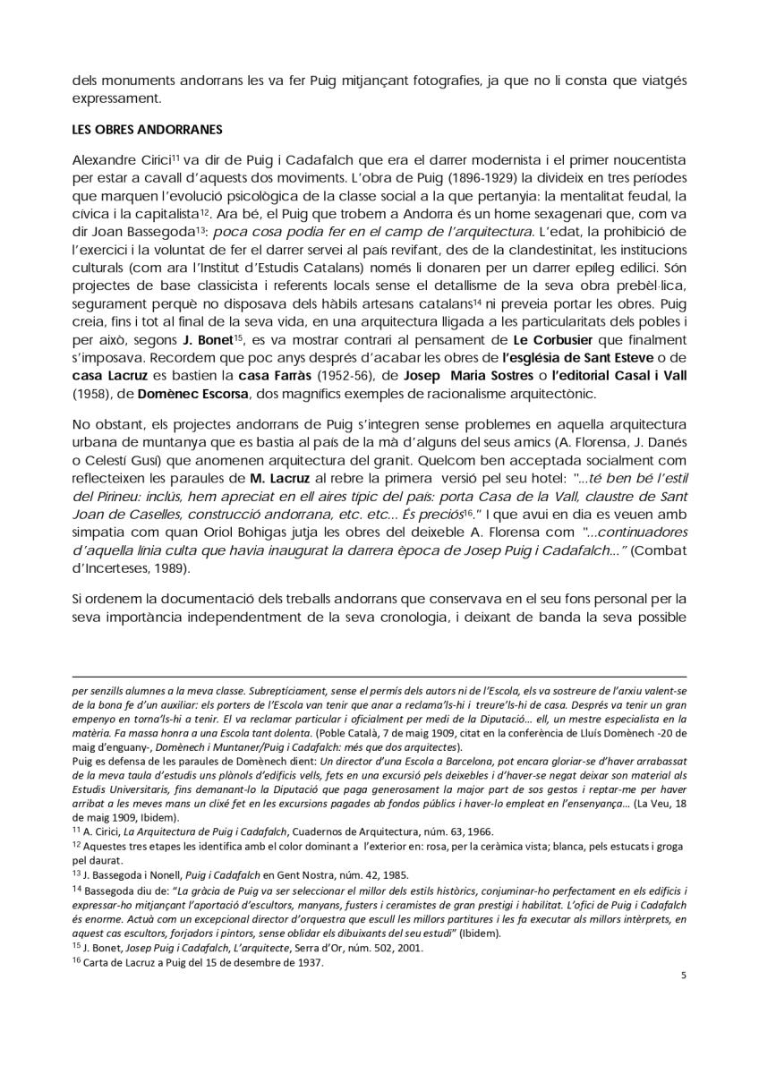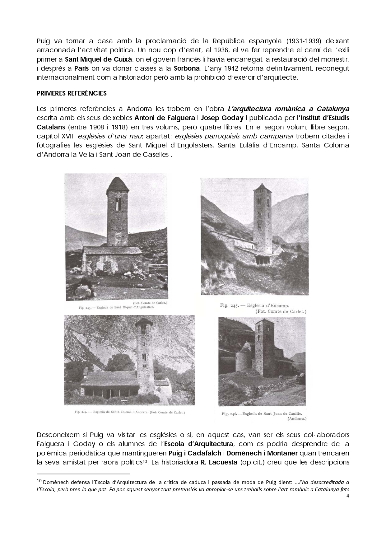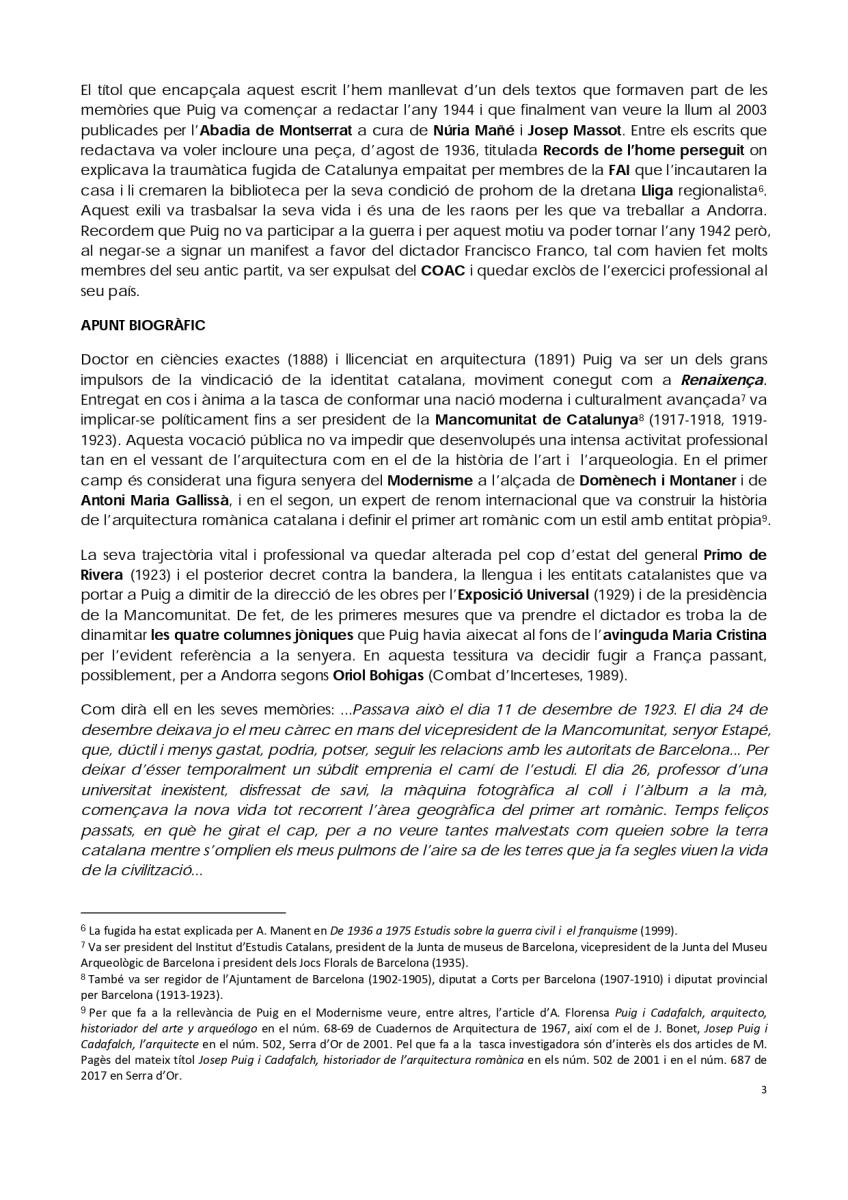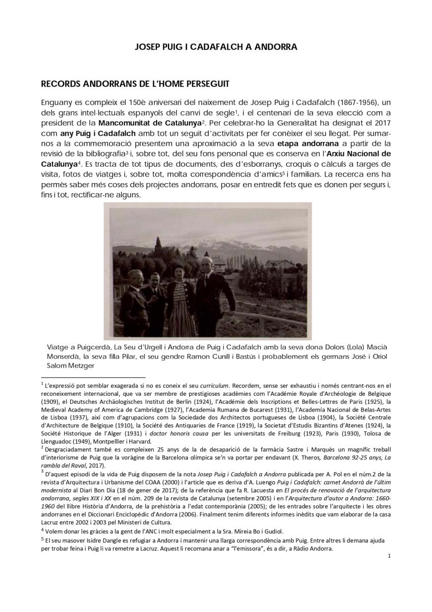Enguany es compleix el 150è aniversari del naixement de Josep Puig i Cadafalch (1867-1956), un dels grans intel·lectuals espanyols del canvi de segle i el centenari de la seva elecció com a president de la Mancomunitat de CatalunyA. Per celebrar-ho la Generalitat ha designat el 2017 com any Puig i Cadafalch amb tot un seguit d’activitats per fer conèixer el seu llegat. Per sumar-nos a la commemoració presentem una aproximació a la seva etapa andorrana a partir de la revisió de la bibliografia i, sobre tot, del seu fons personal que es conserva en l’Arxiu Nacional de Catalunya...