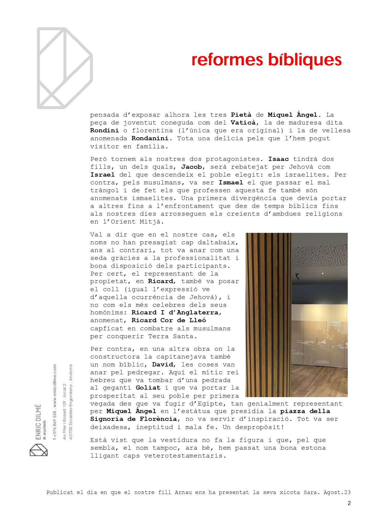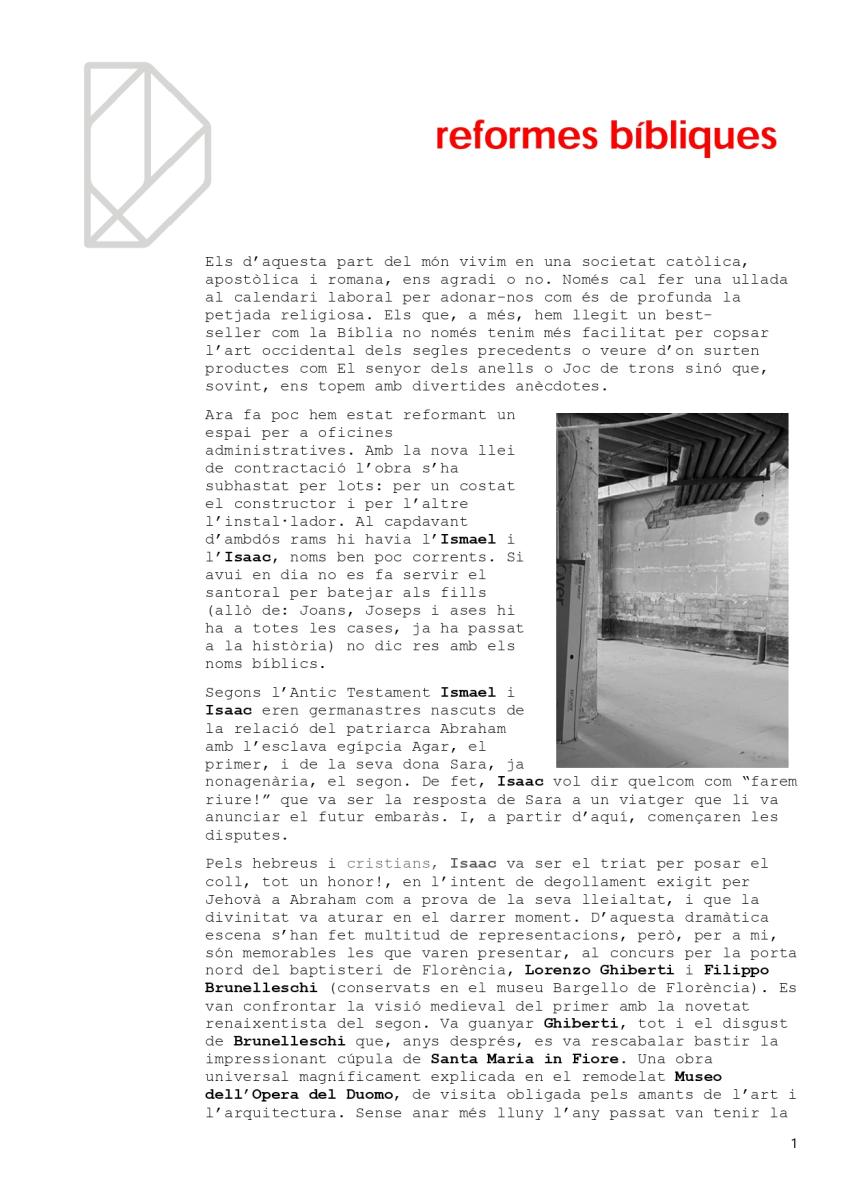 Ara fa poc hem estat reformant un espai per a oficines administratives. Al capdavant de l'obra hi teniem el representant de la constructora, l'Isaac i el de l'empresa d'instal·lacions, l'Ismael. Aquest escrit va dedicat a tots els Isaacs i Ismaels... sense oblidar-nos dels Ricards. Gràcies per fer-ho fàcil.