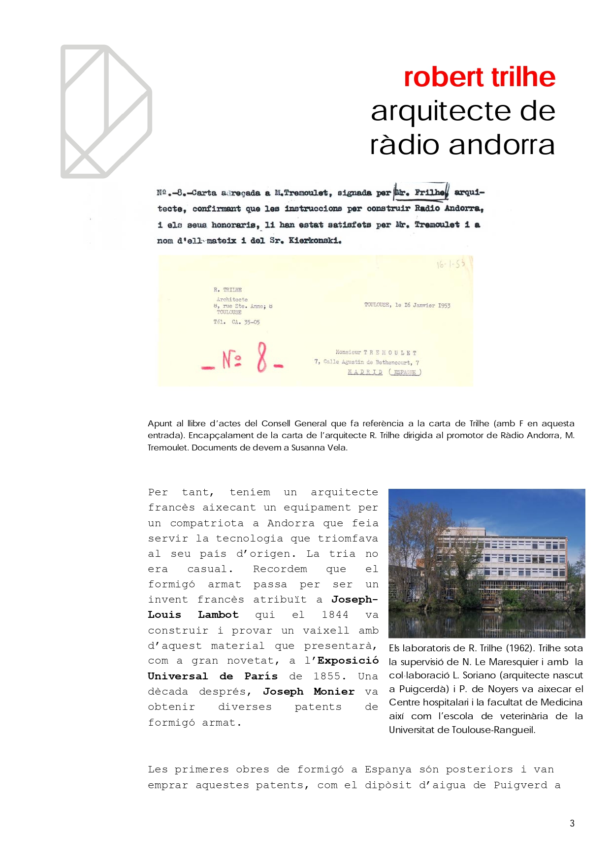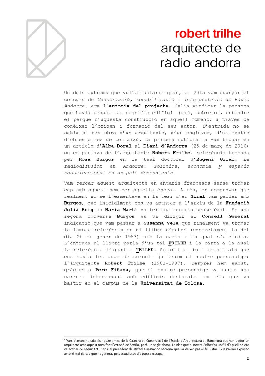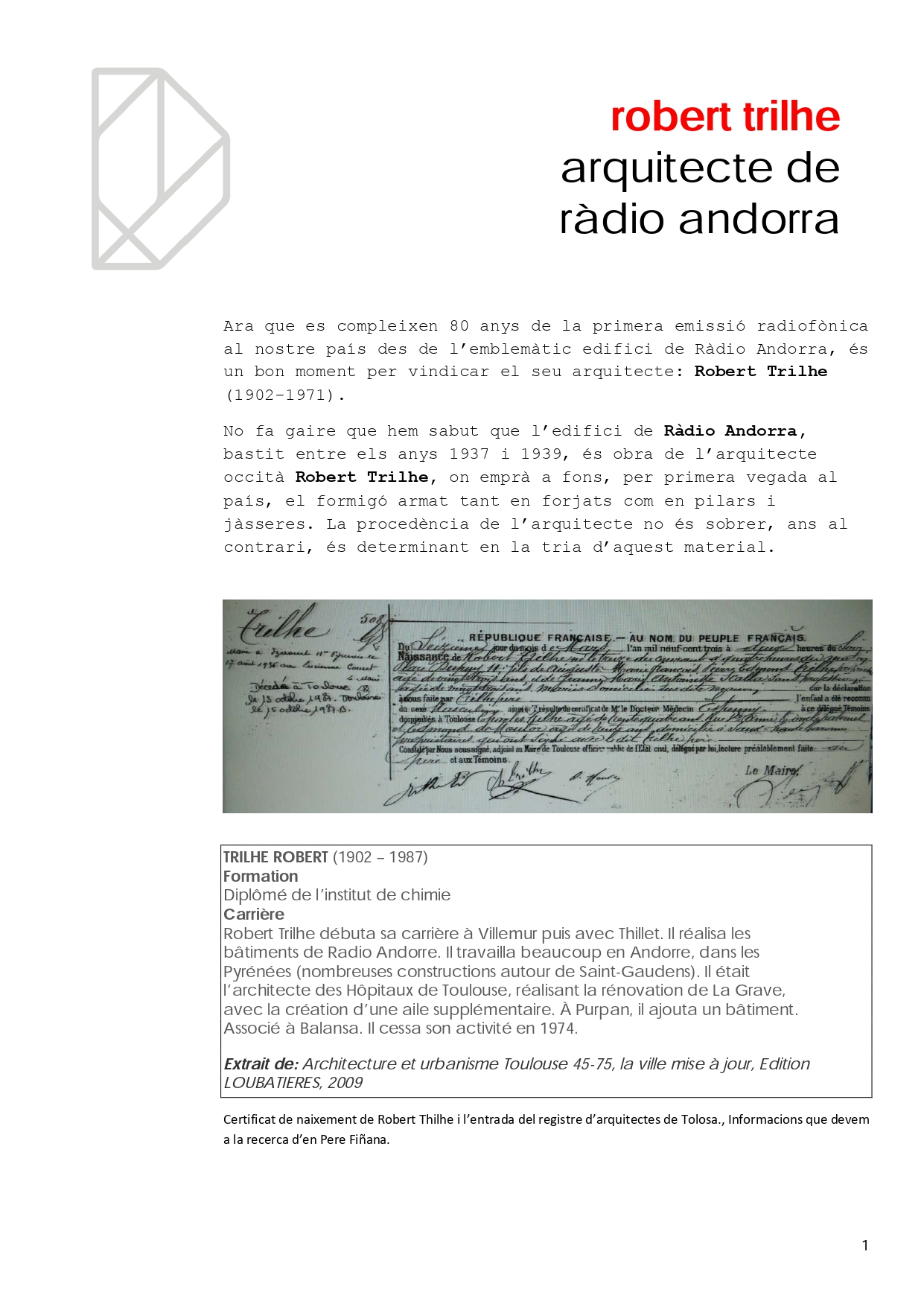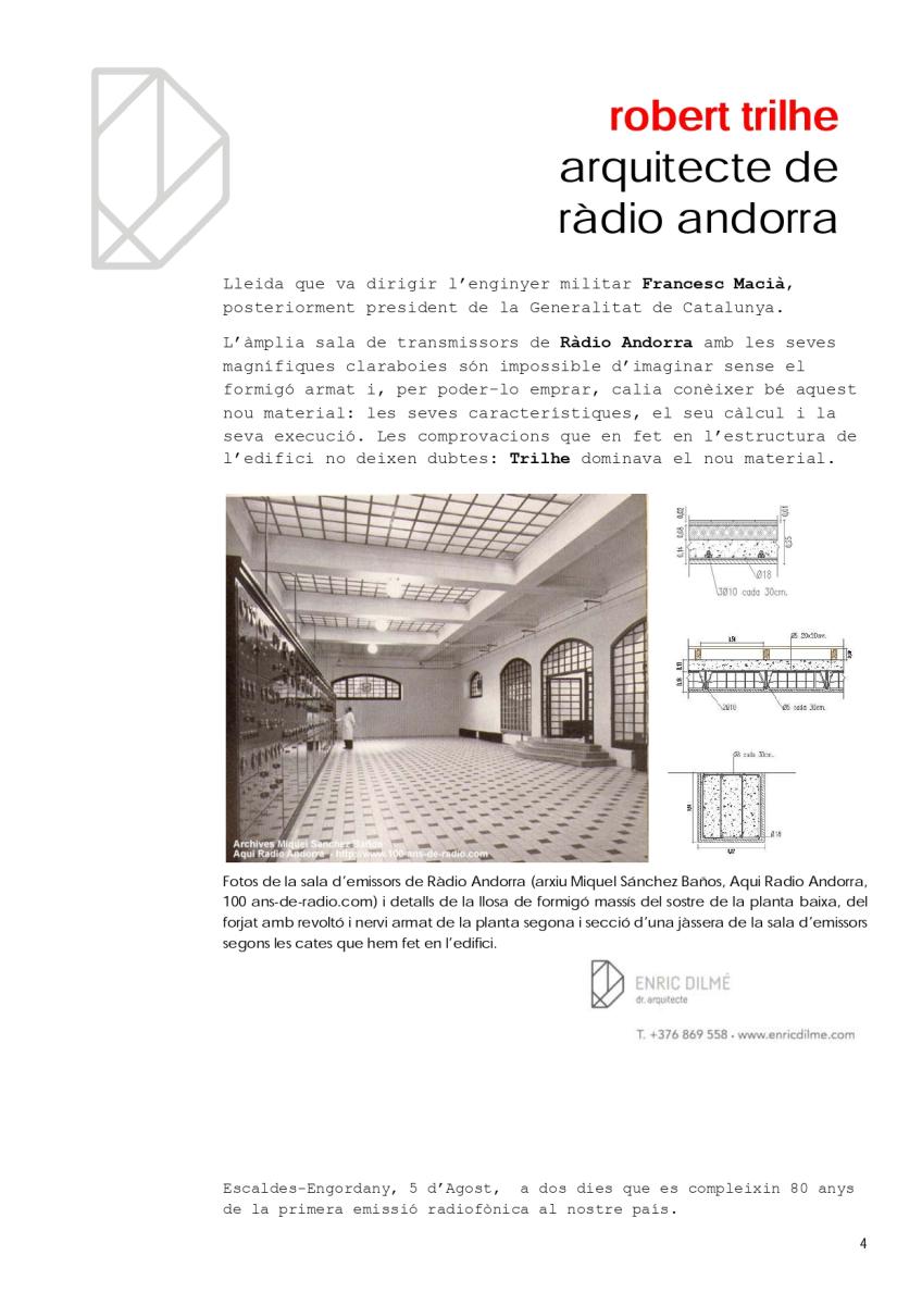 Ara que es compleixen 80 anys de la primera emissió radiofònica al nostre país des de l’emblemàtic edifici de Ràdio Andorra, és un bon moment per vindicar el seu arquitecte: Robert Trilhe (1902-1971).