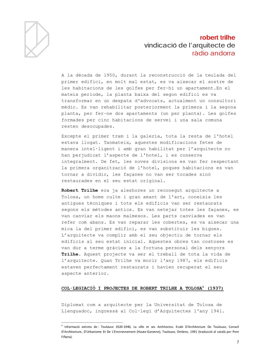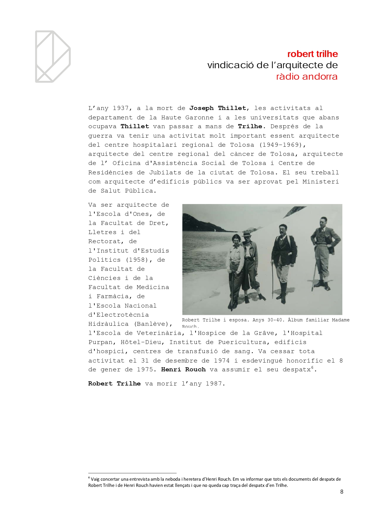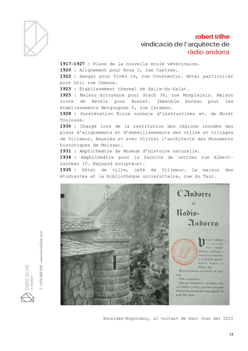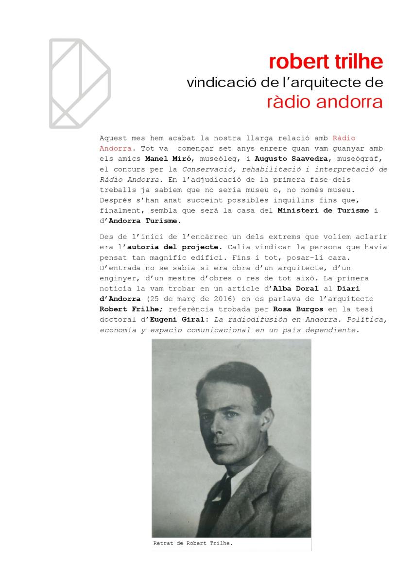 Aquest mes de juny del 2022 hem acabat la nostra llarga relació amb Ràdio Andorra. Tot va començar set anys enrere quan vam guanyar amb els amics Manel Miró, museòleg, i Augusto Saavedra, museògraf, el concurs per la Conservació, rehabilitació i interpretació de Ràdio Andorra. En l’adjudicació de la primera fase dels treballs ja sabíem que no seria museu o, no només museu. Després s’han anat succeint possibles inquilins fins que, finalment, sembla que serà la casa del Ministeri de Turisme i d’Andorra Turisme.