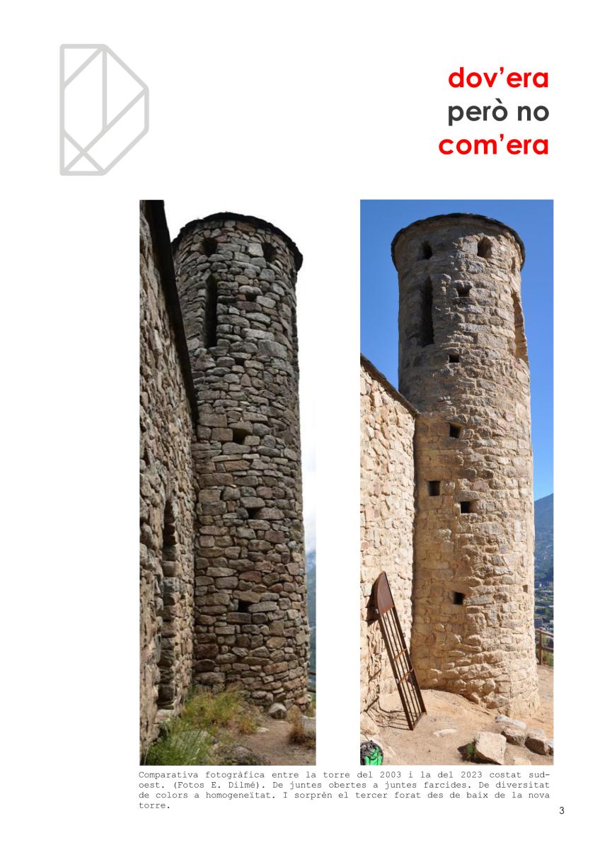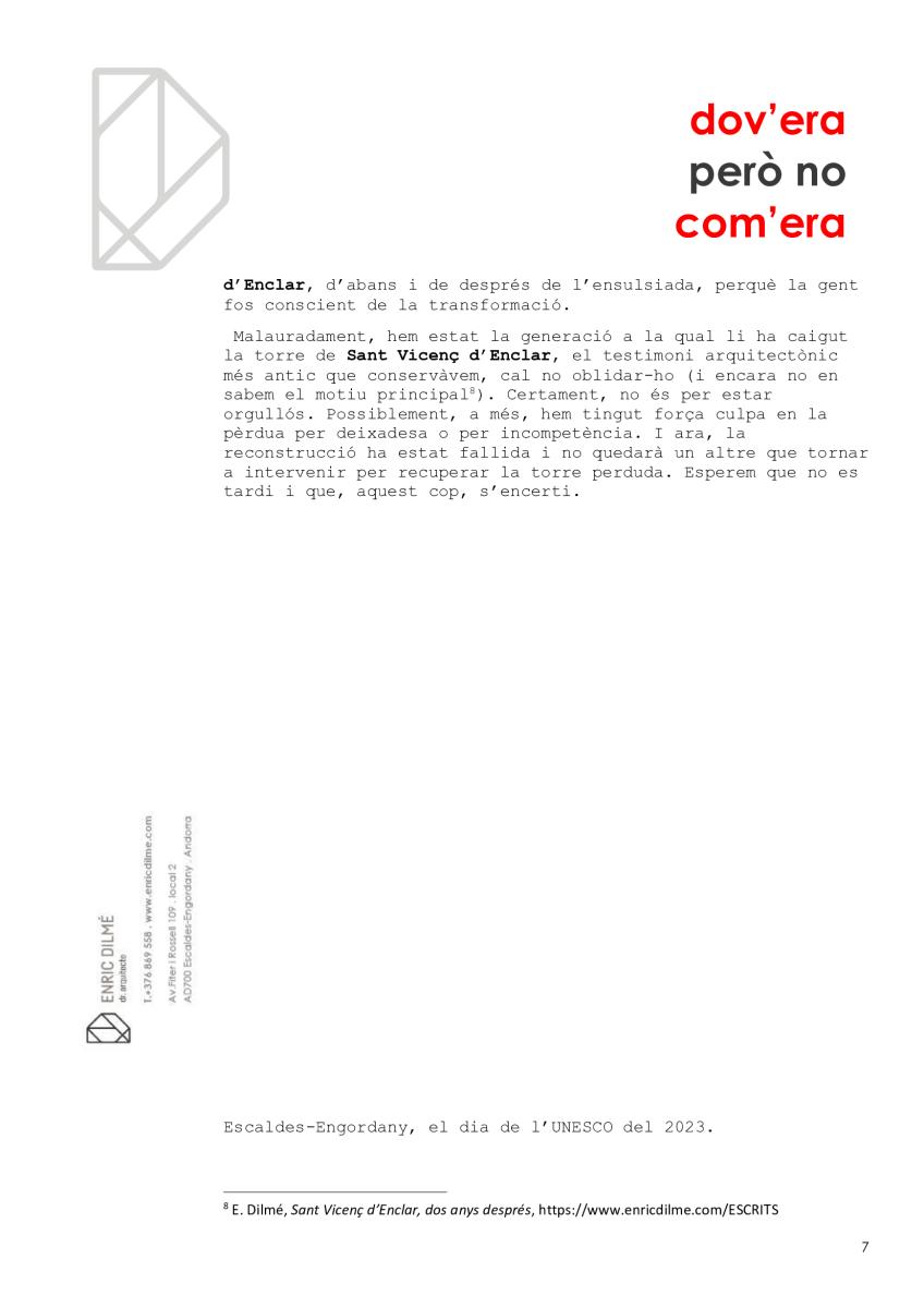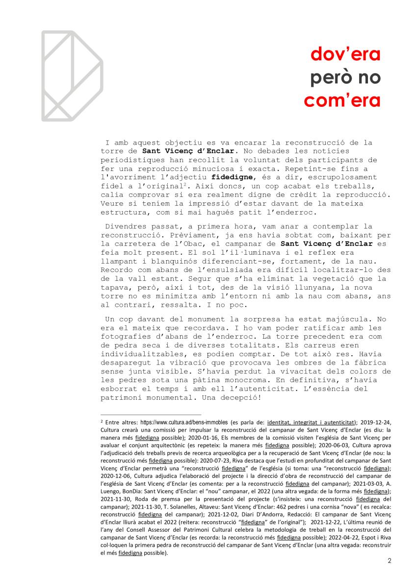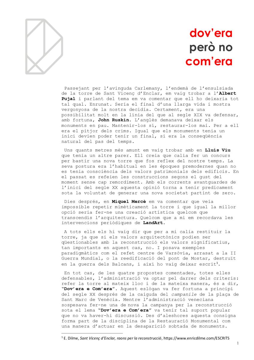 Malauradament, hem estat la generació a la qual li ha caigut la torre de Sant Vicenç d’Enclar, el testimoni arquitectònic més antic que conservàvem, cal no oblidar-ho (i encara no en sabem el motiu principal. Certament, no és per estar orgullós. Possiblement, a més, hem tingut força culpa en la pèrdua per deixadesa o per incompetència. I ara, la reconstrucció ha estat fallida i no quedarà un altre que tornar a intervenir per recuperar la torre perduda. Esperem que no es tardi i que, aquest cop, s’encerti.