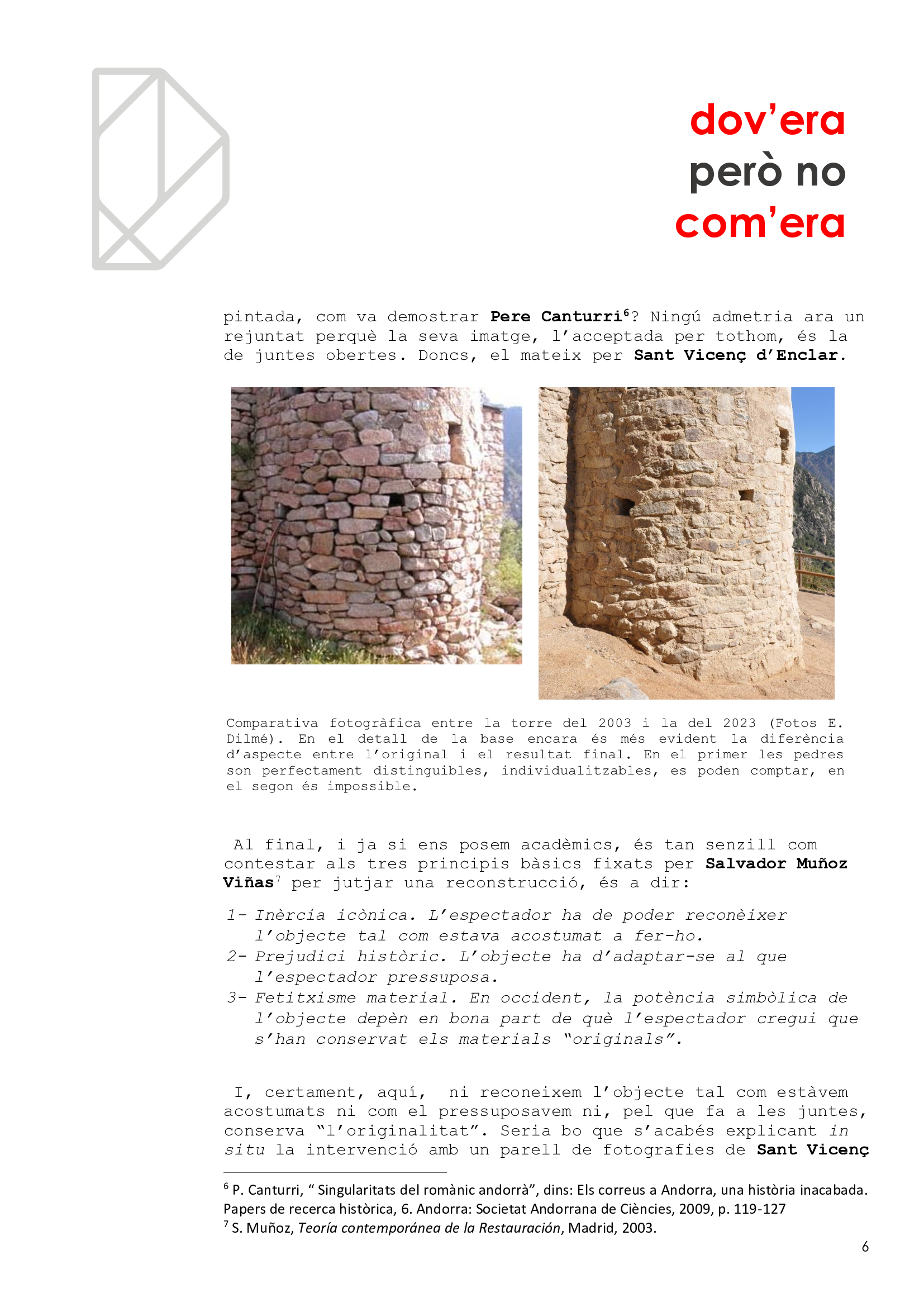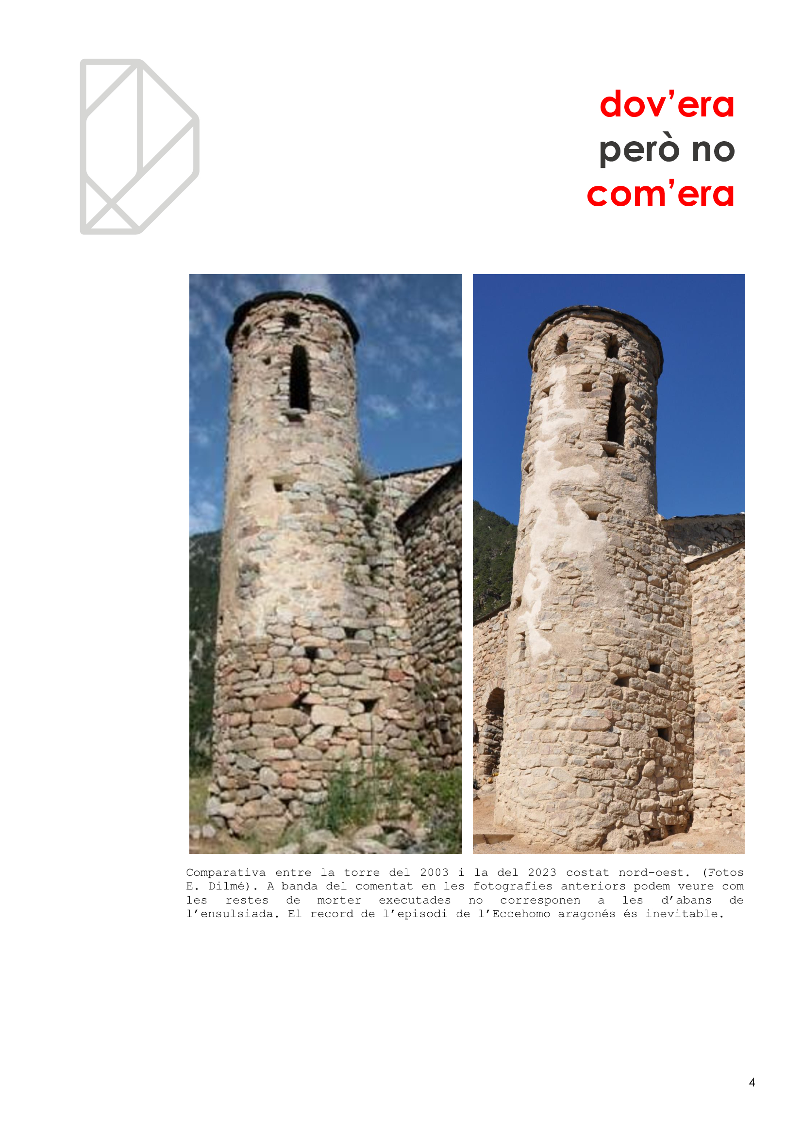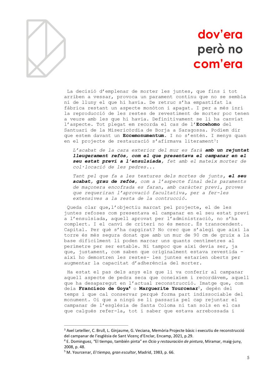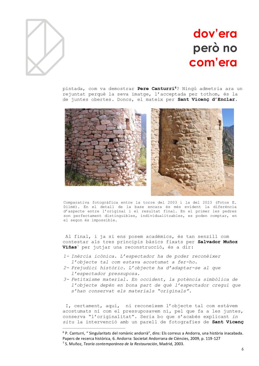 Malauradament, hem estat la generació a la qual li ha caigut la torre de Sant Vicenç d’Enclar, el testimoni arquitectònic més antic que conservàvem, cal no oblidar-ho (i encara no en sabem el motiu principal. Certament, no és per estar orgullós. Possiblement, a més, hem tingut força culpa en la pèrdua per deixadesa o per incompetència. I ara, la reconstrucció ha estat fallida i no quedarà un altre que tornar a intervenir per recuperar la torre perduda. Esperem que no es tardi i que, aquest cop, s’encerti.