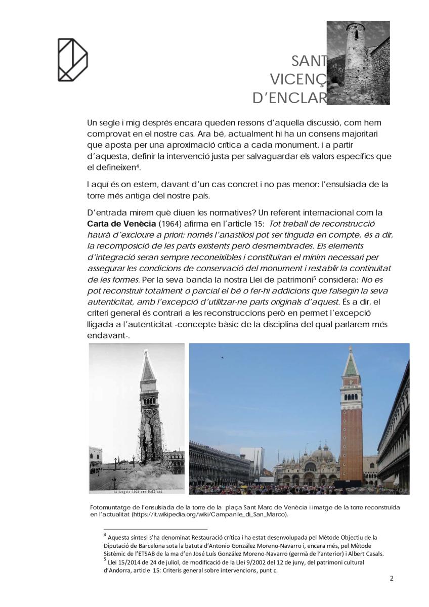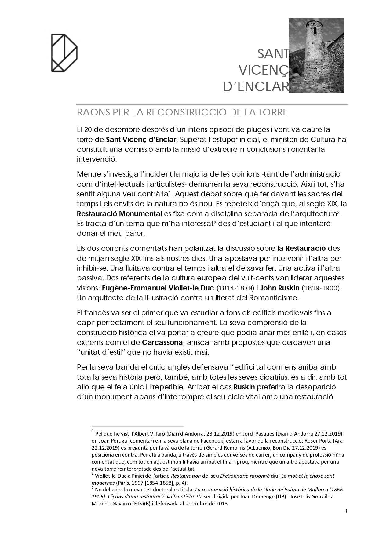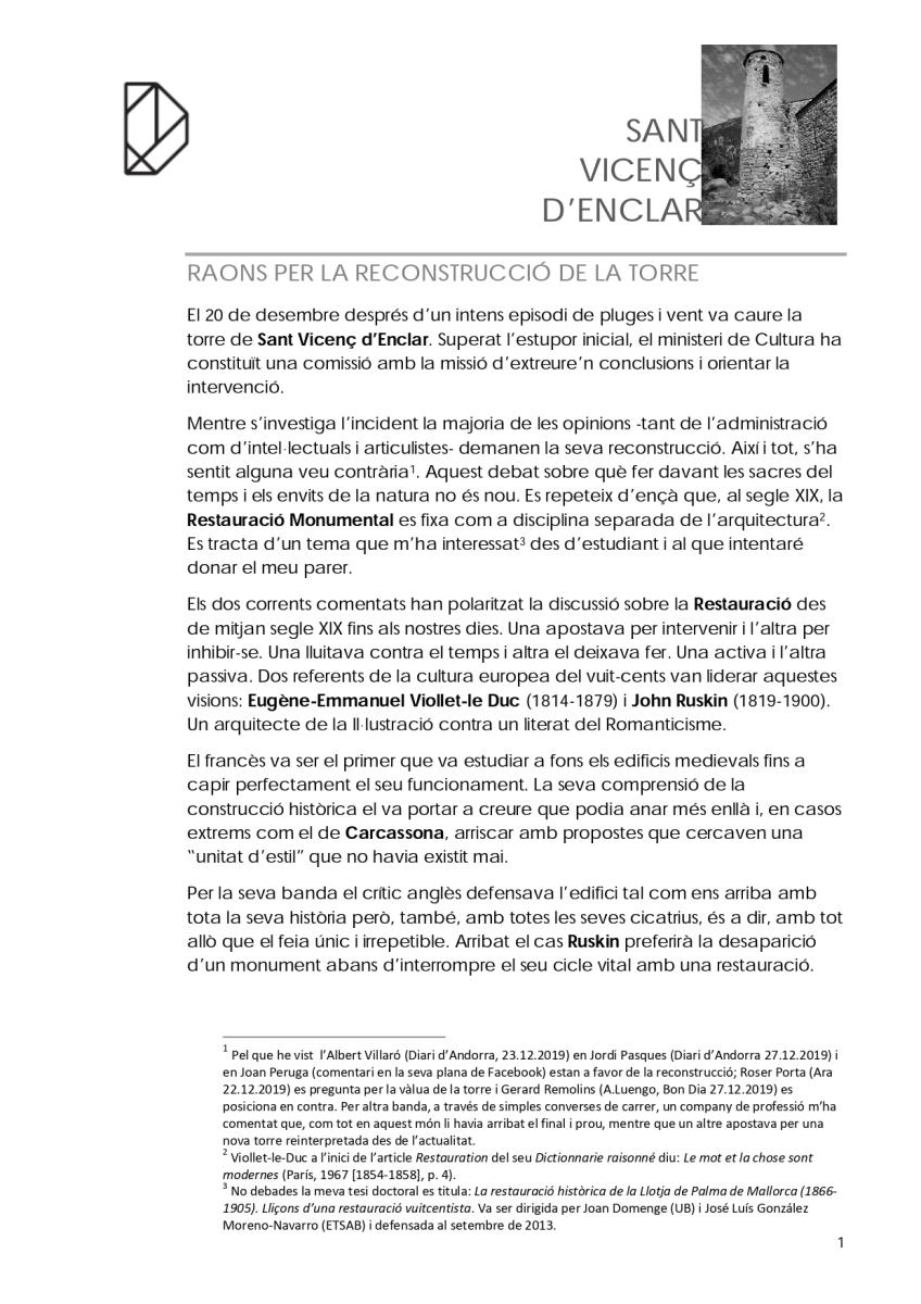 El 20 de desembre després d’un intens episodi de pluges i vent va caure la torre de Sant Vicenç d’Enclar. Superat l’estupor inicial, el ministeri de Cultura ha constituït una comissió amb la missió d’extreure’n conclusions i orientar la intervenció. Mentre s’investiga l’incident la majoria de les opinions -tant de l’administració com d’intel·lectuals i articulistes- demanen la seva reconstrucció. Així i tot, s’ha sentit alguna veu contrària.