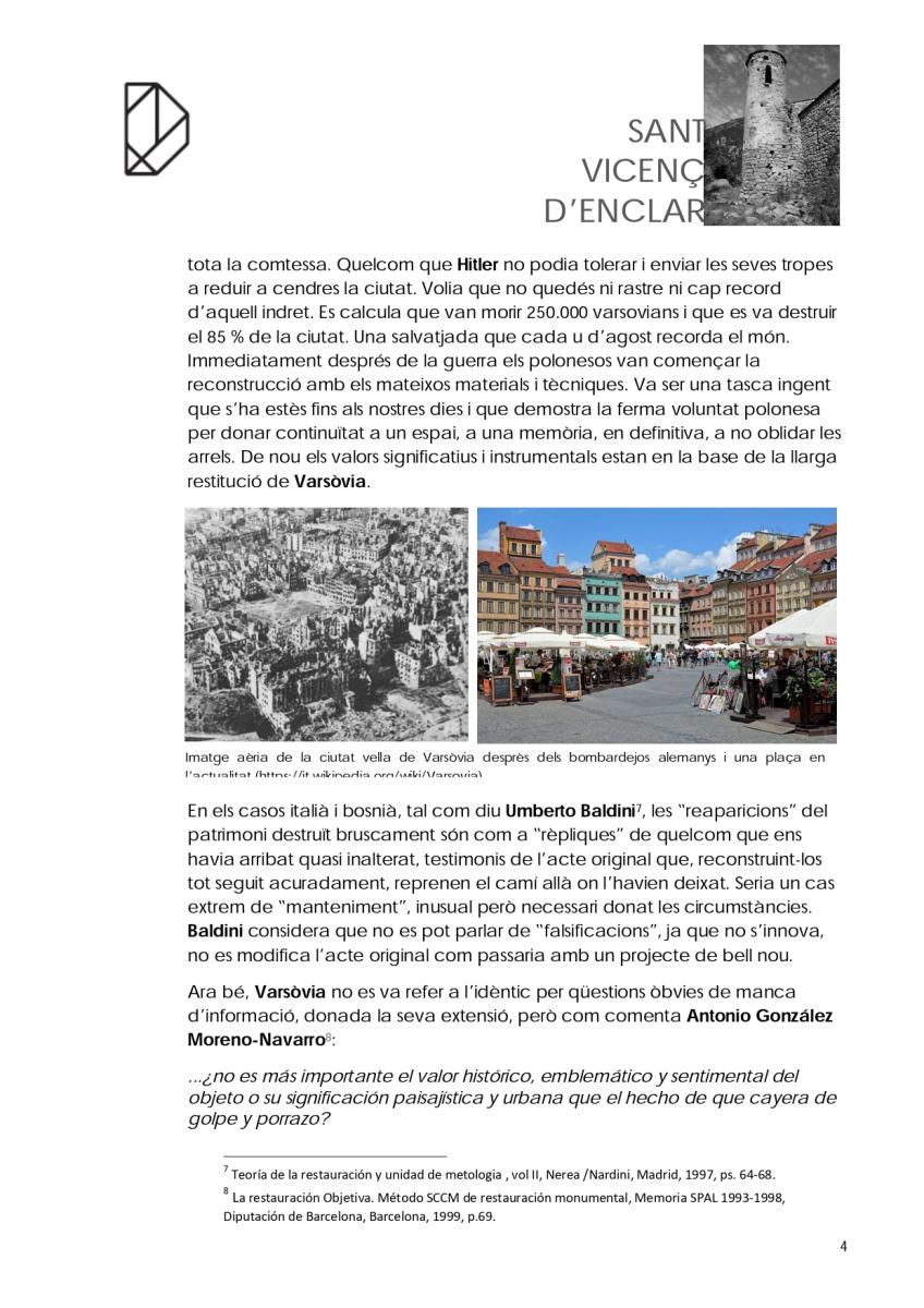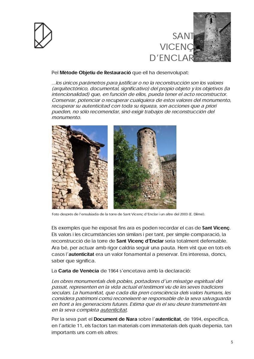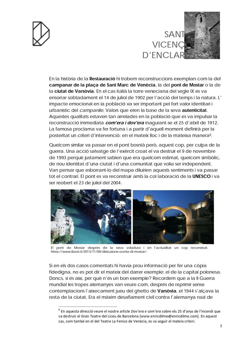El 20 de desembre després d’un intens episodi de pluges i vent va caure la torre de Sant Vicenç d’Enclar. Superat l’estupor inicial, el ministeri de Cultura ha constituït una comissió amb la missió d’extreure’n conclusions i orientar la intervenció. Mentre s’investiga l’incident la majoria de les opinions -tant de l’administració com d’intel·lectuals i articulistes- demanen la seva reconstrucció. Així i tot, s’ha sentit alguna veu contrària.