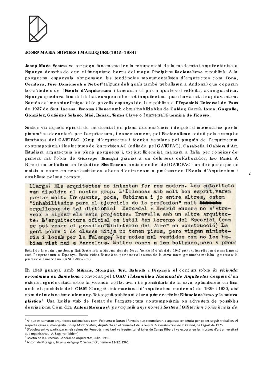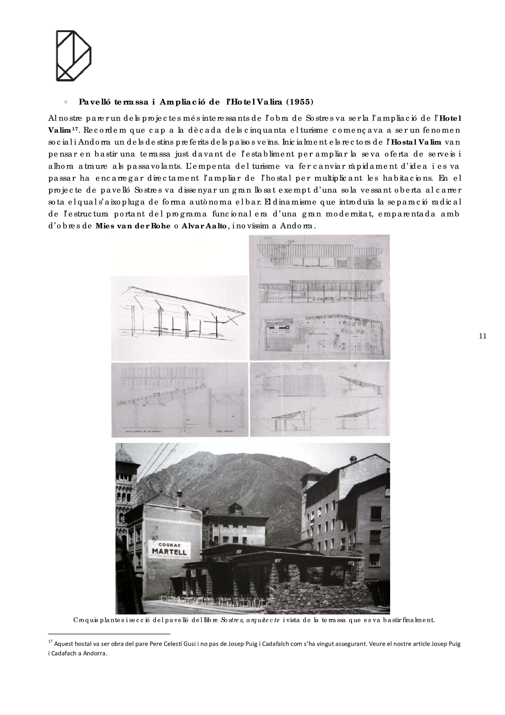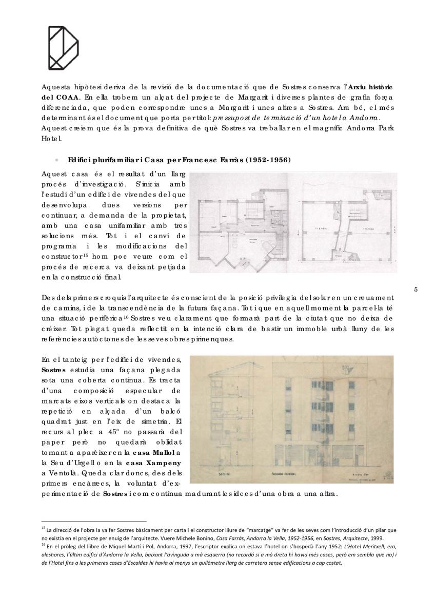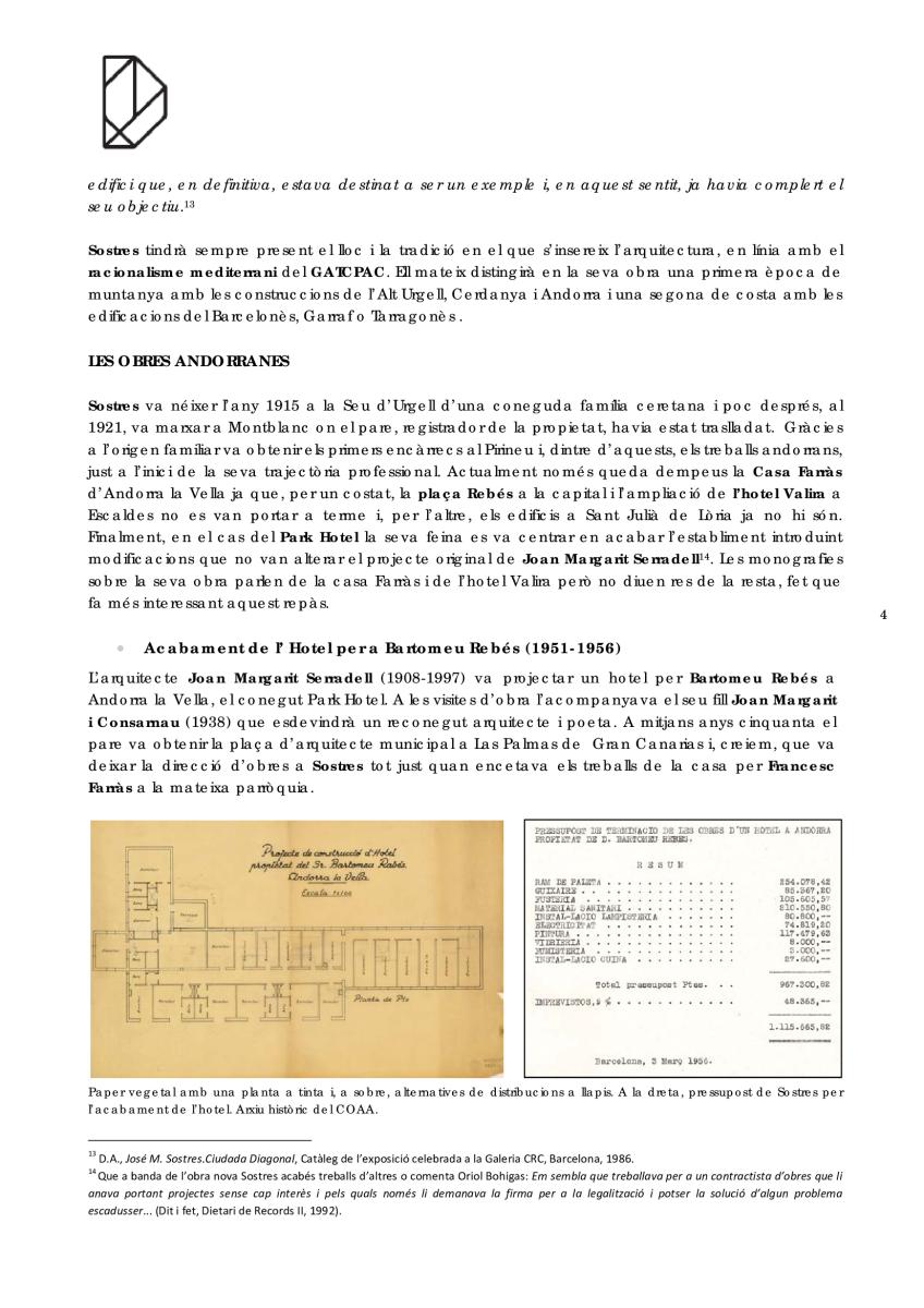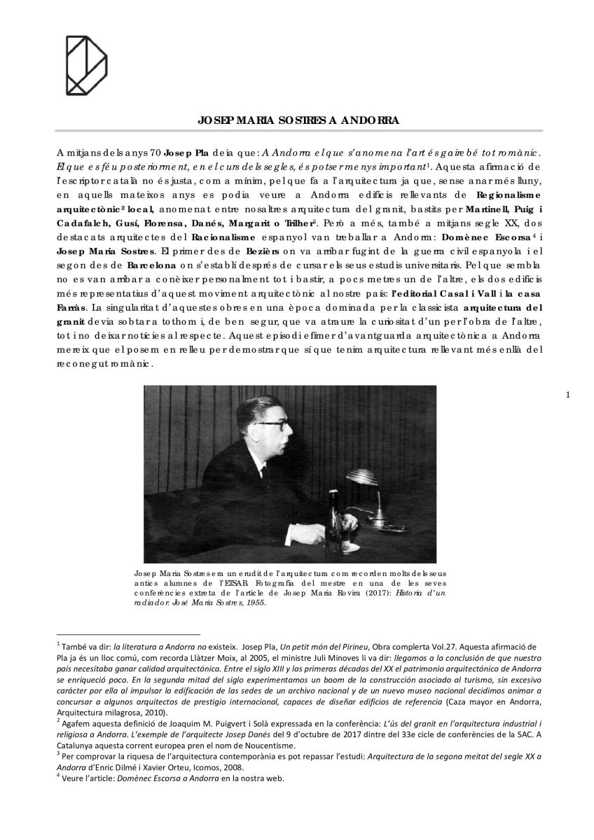 A mitjans dels anys 70 Josep Pla deia que: A Andorra el que s’anomena l’art és gairebé tot romànic. El que es féu posteriorment, en el curs dels segles, és potser menys important. Aquesta afirmació de l’escriptor català no és justa, com a mínim, pel que fa a l’arquitectura ja que, sense anar més lluny, en aquells mateixos anys es podia veure a Andorra edificis rellevants de Regionalisme arquitectònic local, anomenat entre nosaltres arquitectura del granit, bastits per Martinell, Puig i Cadafalch, Gusí, Florensa, Danés, Margarit o Trilher. Però a més, també a mitjans segle XX, dos destacats arquitectes del Racionalisme espanyol van treballar a Andorra: Domènec Escorsa i Josep Maria Sostres.