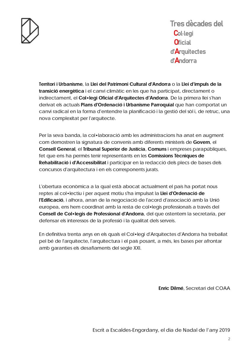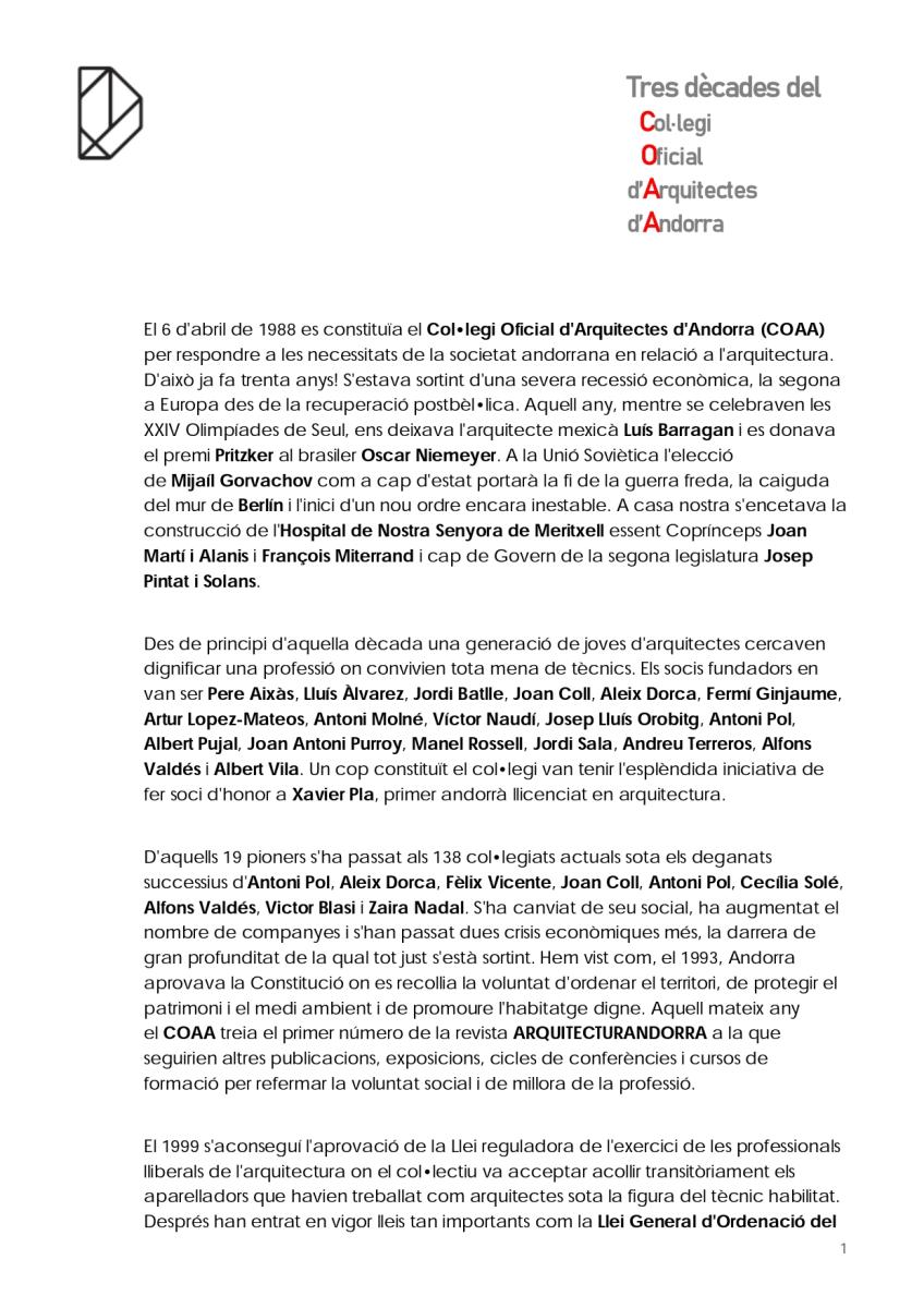 El 6 d'abril de 1988 es constituïa el Col•legi Oficial d'Arquitectes d'Andorra (COAA) per respondre a les necessitats de la societat andorrana en relació a l'arquitectura.